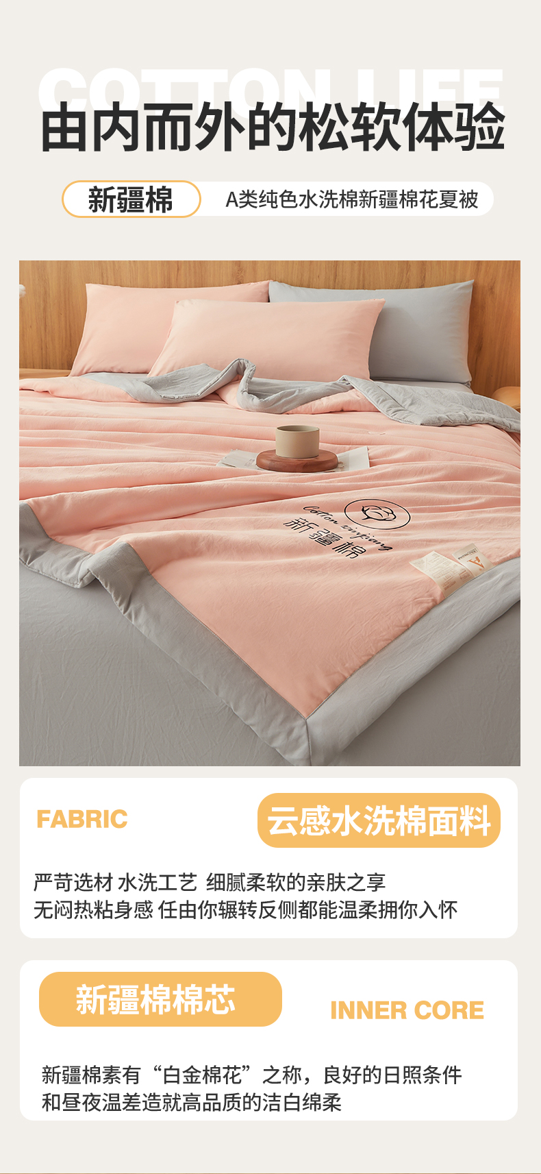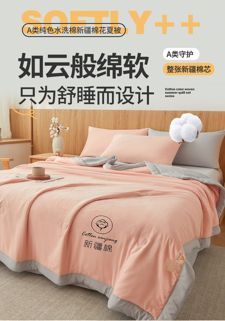 商品名称:晓时候 2026新款无印风水洗棉新疆棉花被夏被夏凉被空调被子 素夏-粉灰