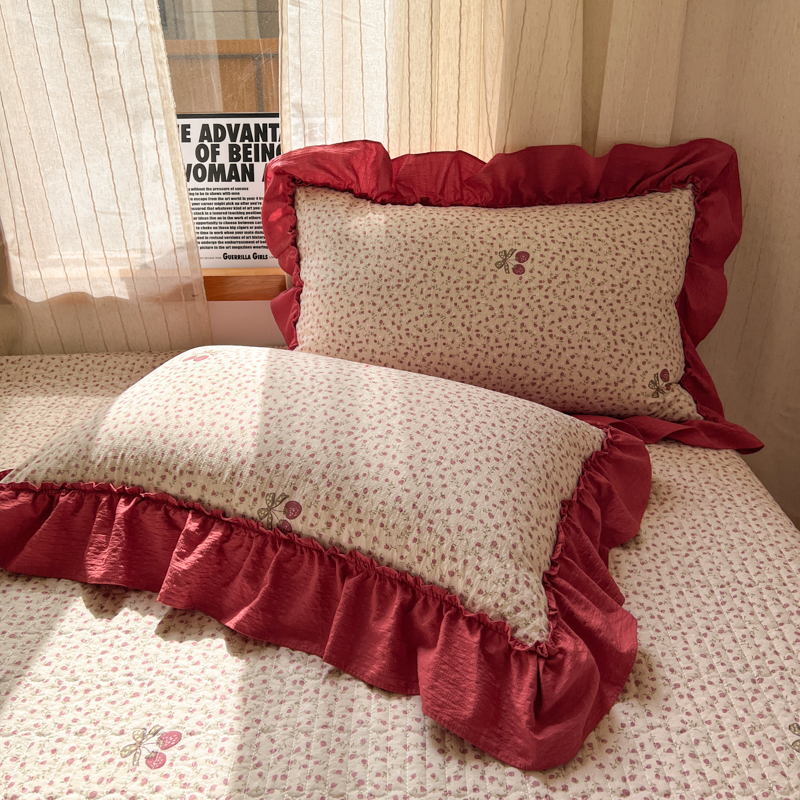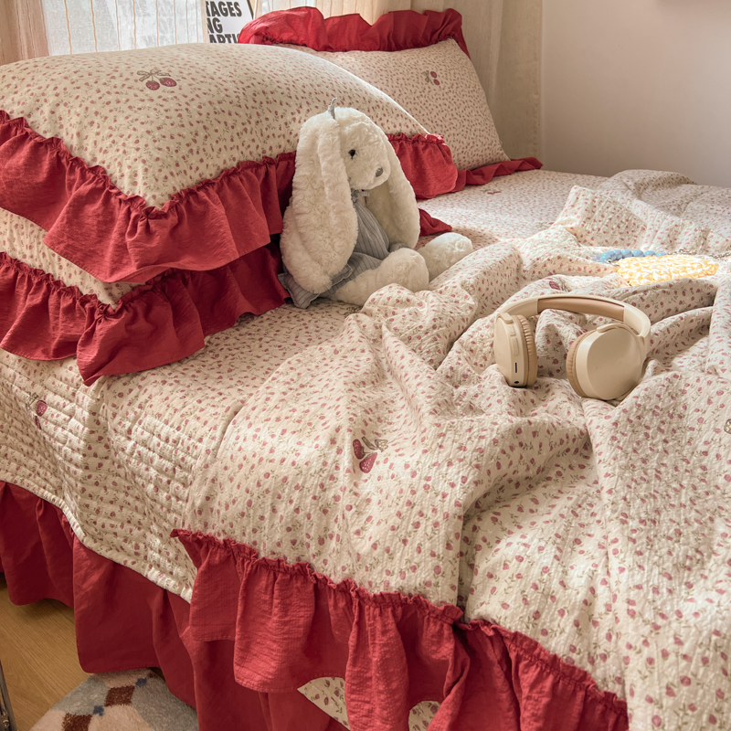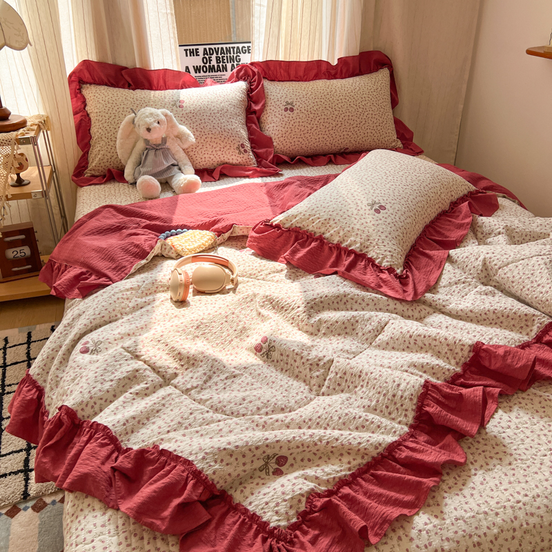 欧尚 2026新款床盖款花边夏被四件套 莓系花伐