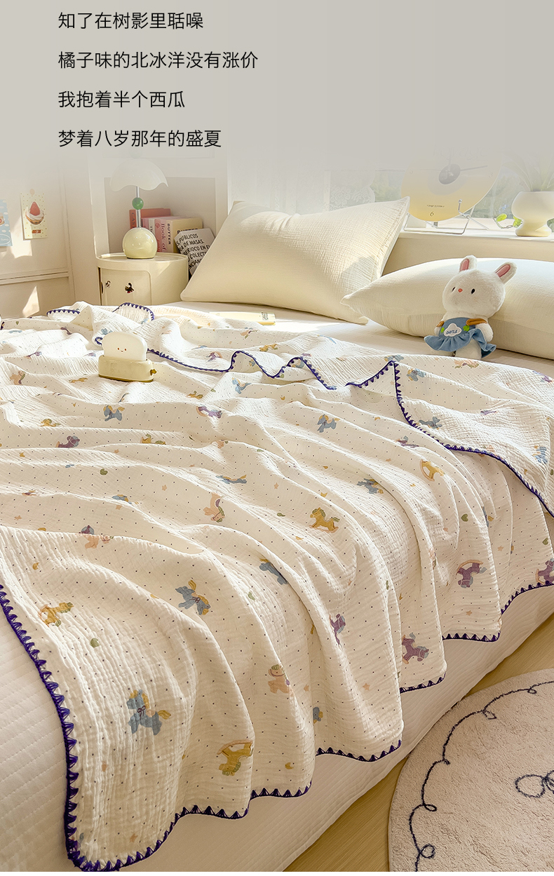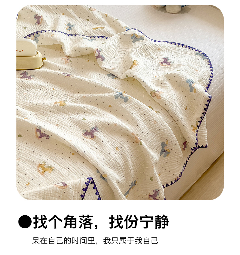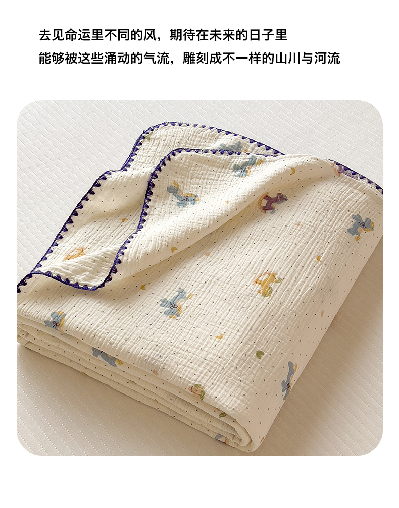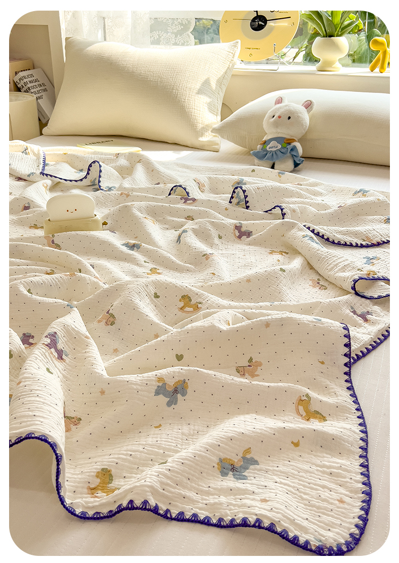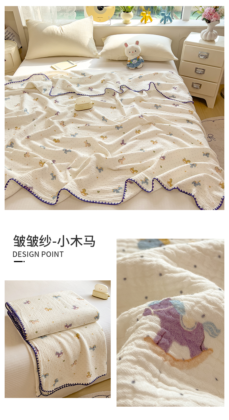 商品名称:布凡家居 2026新款全棉纯棉双层纱布毯夏被毯盖毯双层纱浴巾毯 皱皱纱-小木马