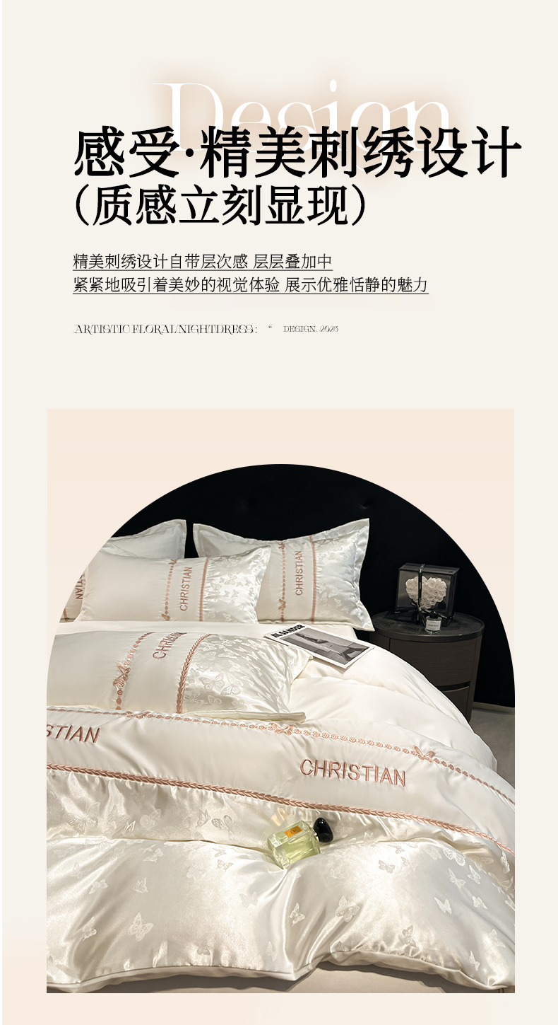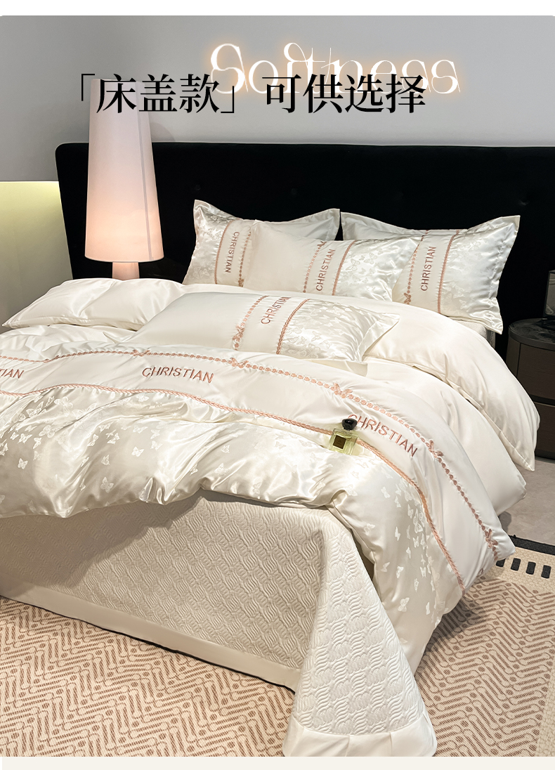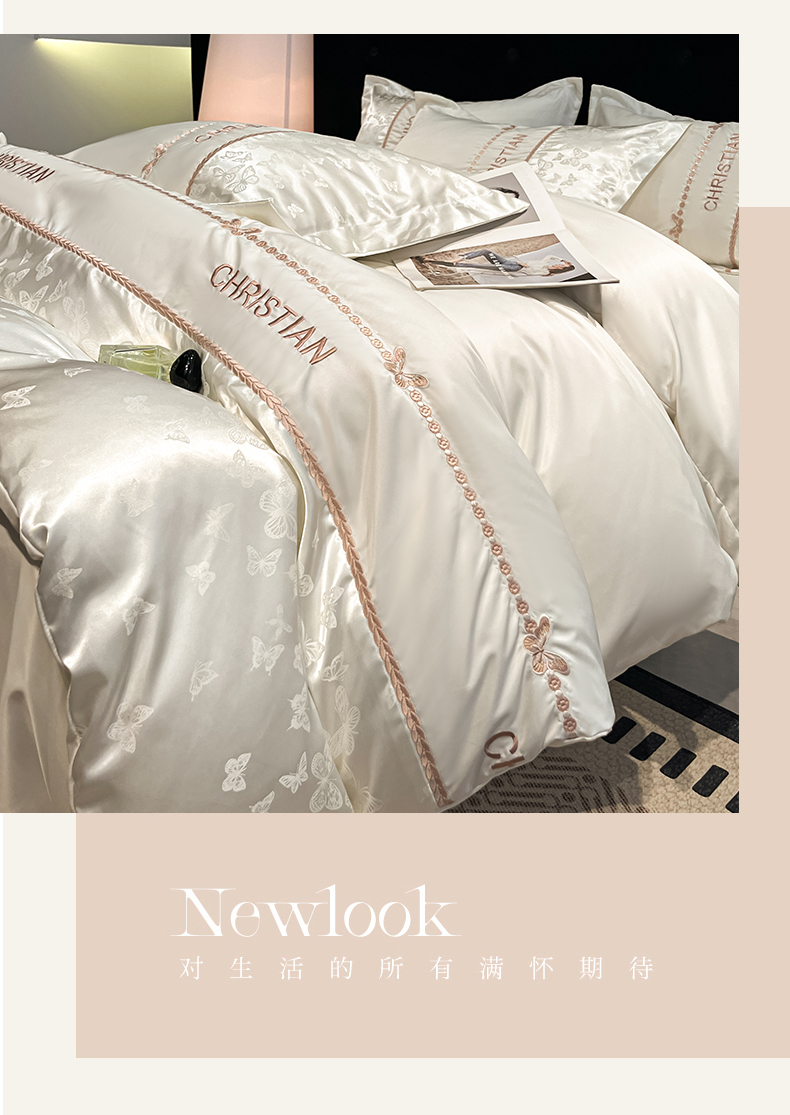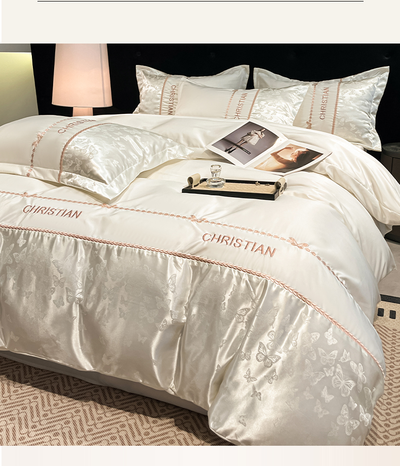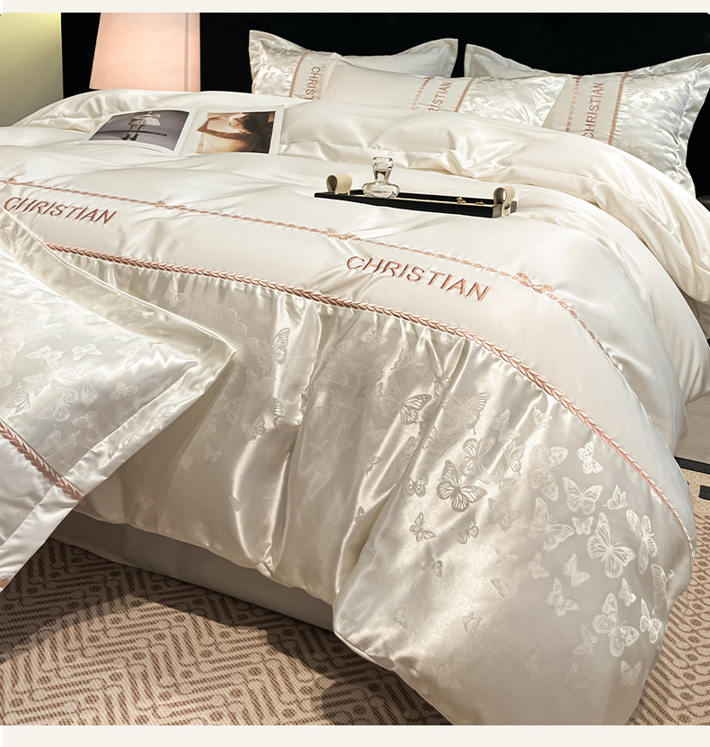 当前位置: 91家纺网 > 商品网购 > 床品套件 > 四件套 > 其它四件套 > 金牛座家纺 2026新款亮丝细斜纹贡缎提花重工刺绣四件套床盖四件套-醉蝶 醉蝶-奶白