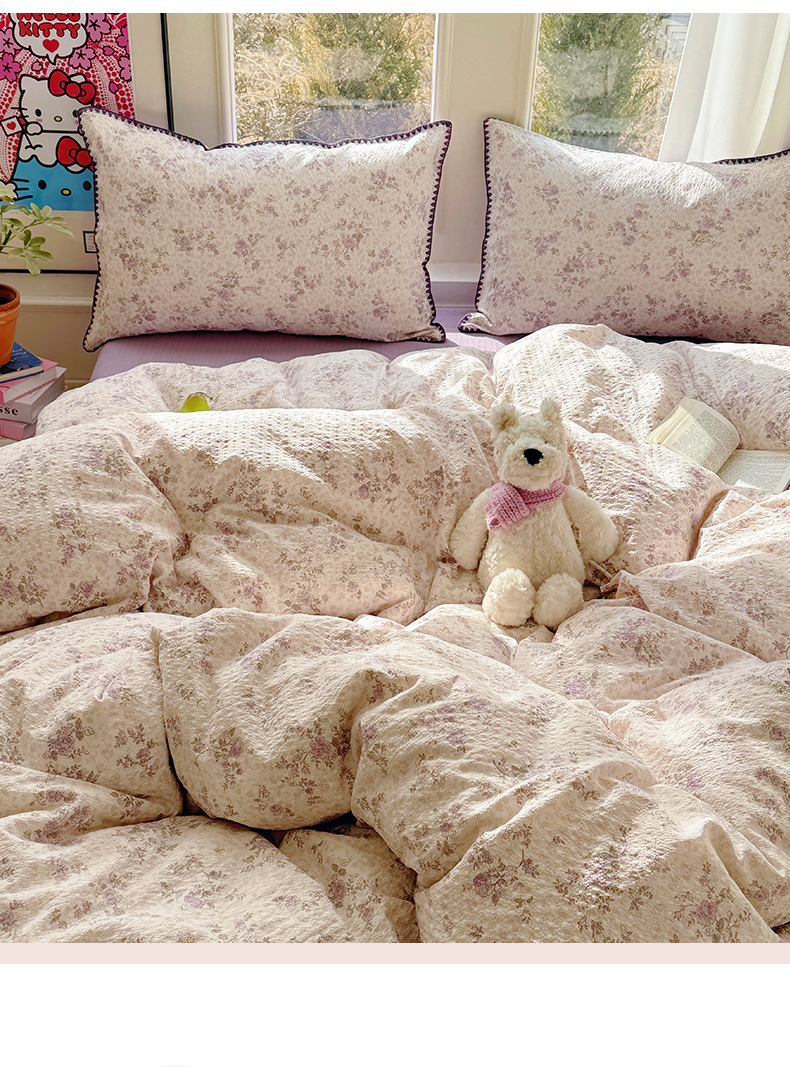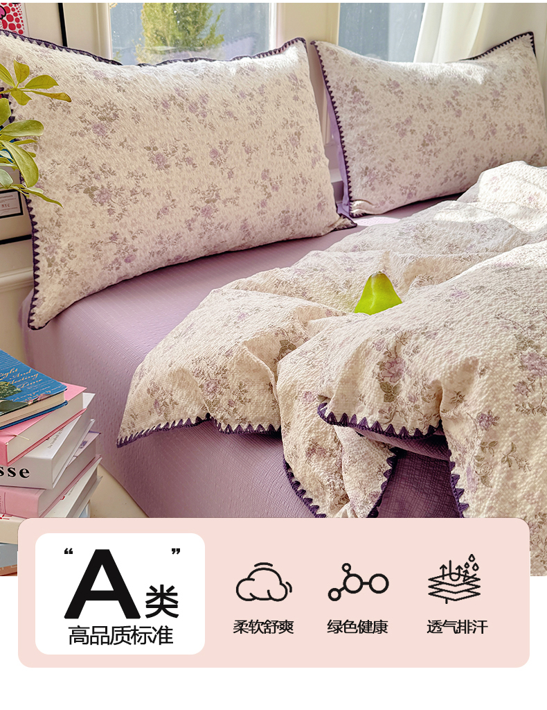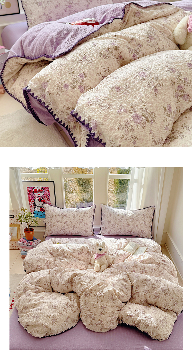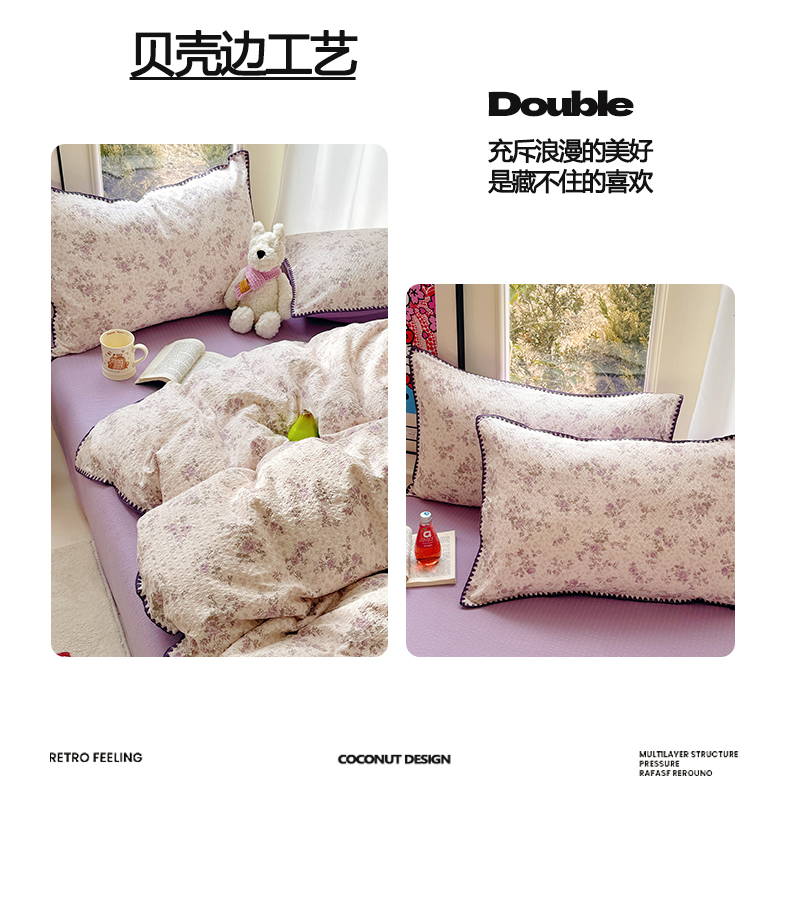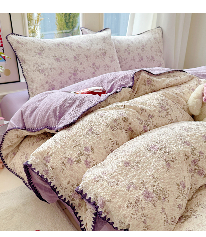 当前位置: 91家纺网 > 商品网购 > 床品套件 > 四件套 > 其它四件套 > 玉海棠家纺 2026新款高品质A类泡芙纱甜栗贝壳边套件系列-小红书推荐(110g) 甜栗-柔紫碎花屿