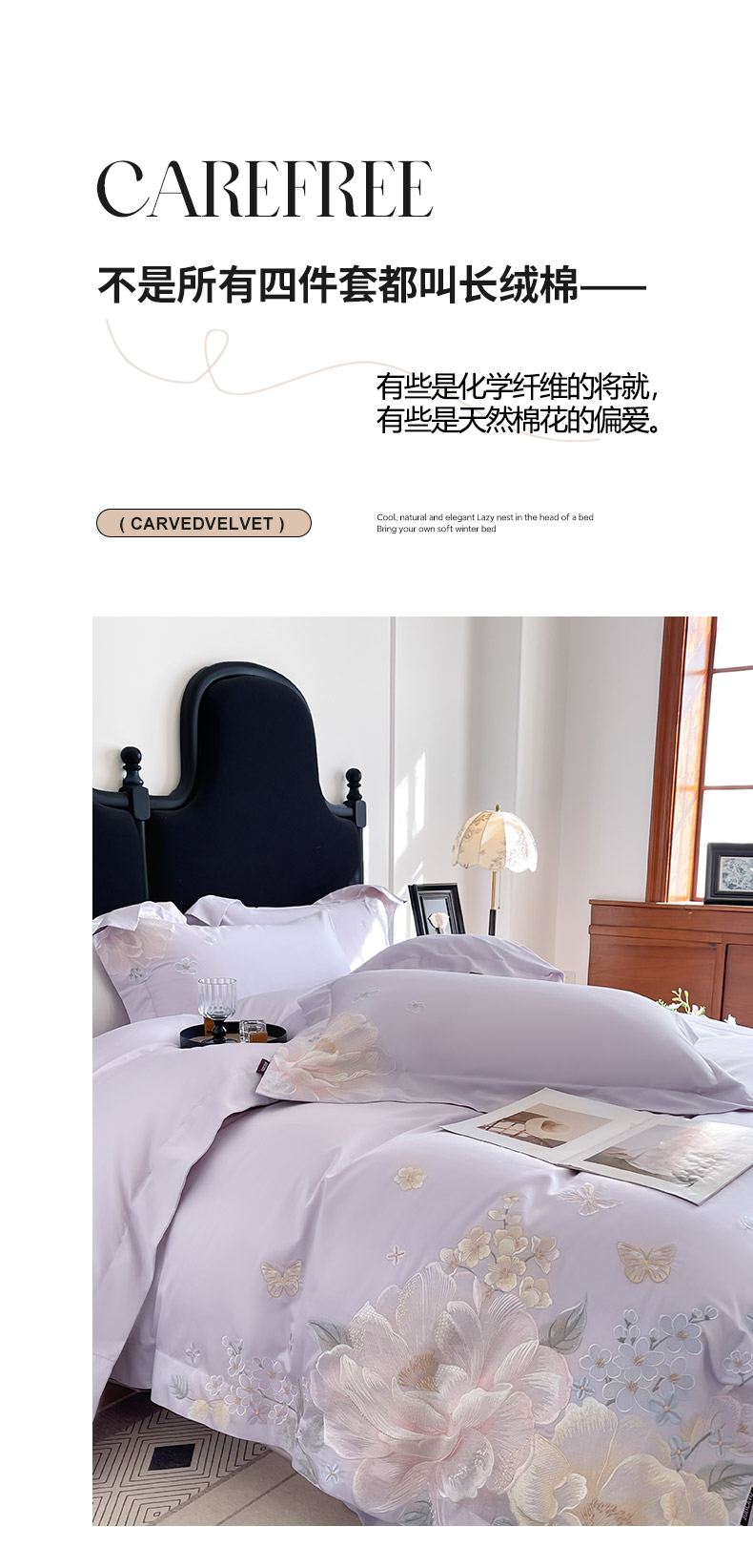 商品名称:2026新品A类100支贡缎长绒棉纯棉四件套全棉重工刺绣全工艺被套床单床笠高端轻奢风床上用品-朵卿 朵卿-黛紫