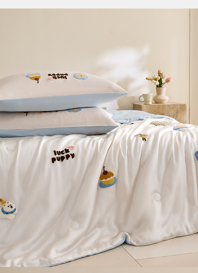 • 91家纺网 家纺一手货源 找家纺 DC 2026新款A类兰精天丝毛巾绣系列夏被四件套 元气白桃+婴儿蓝(初夏小狗)