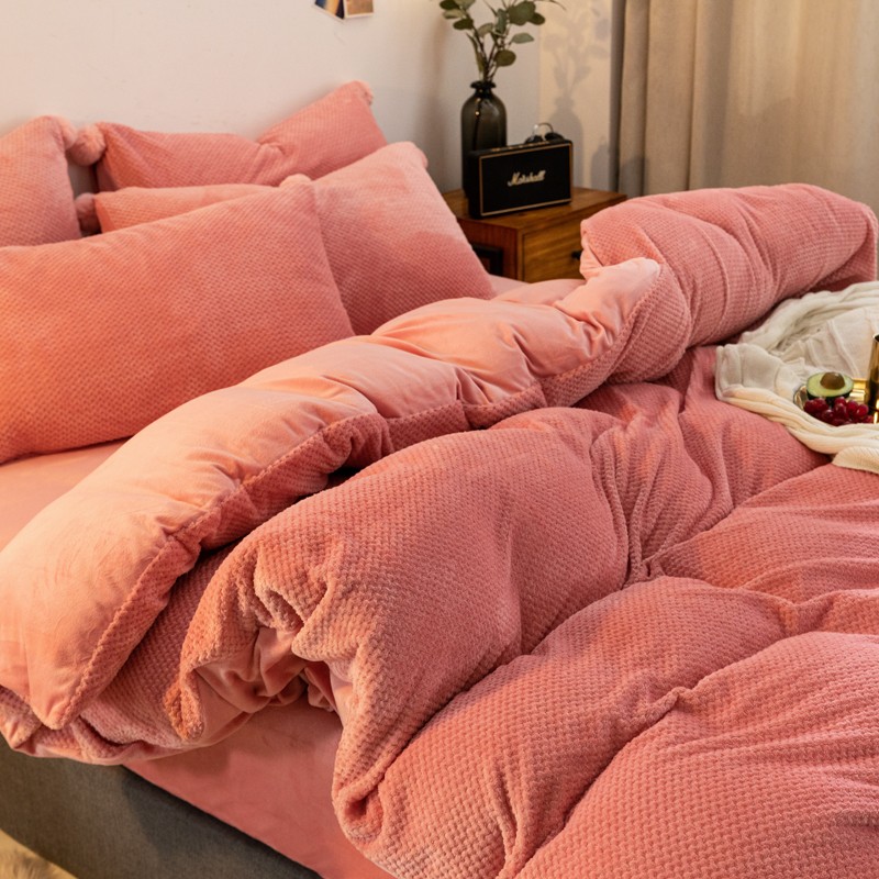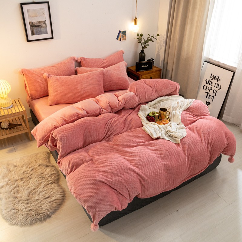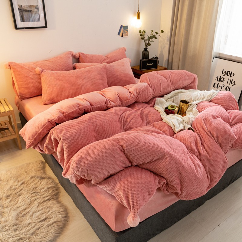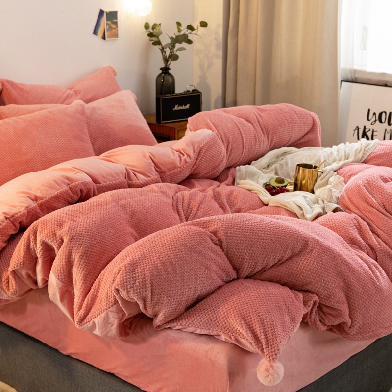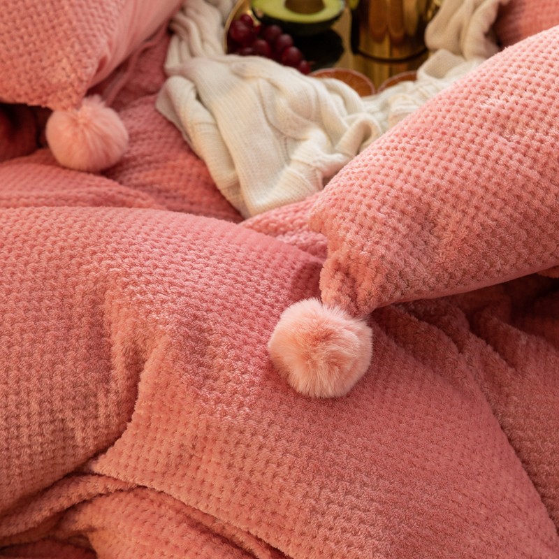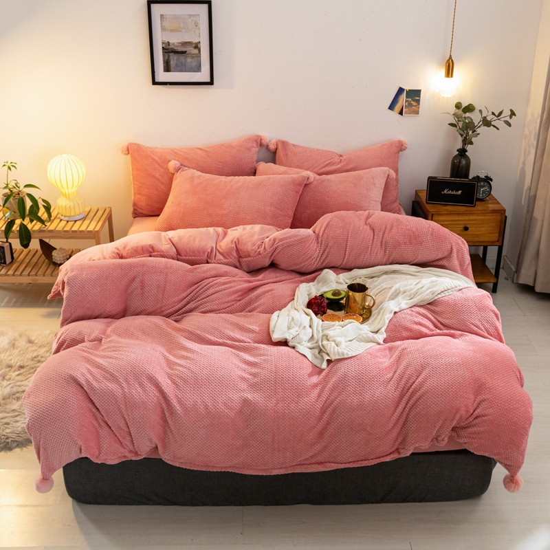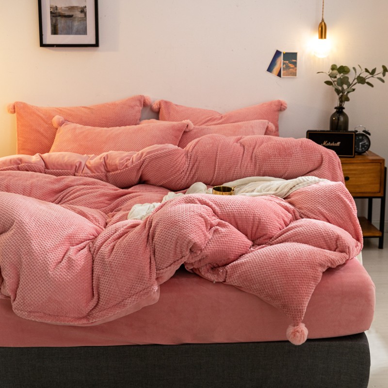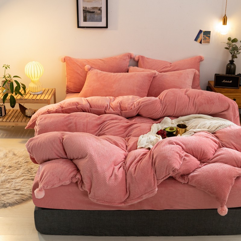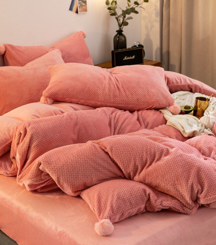 (总)仟网汇 2025新款热款剪花绒毛毛球绒水晶绒四件套,粉色