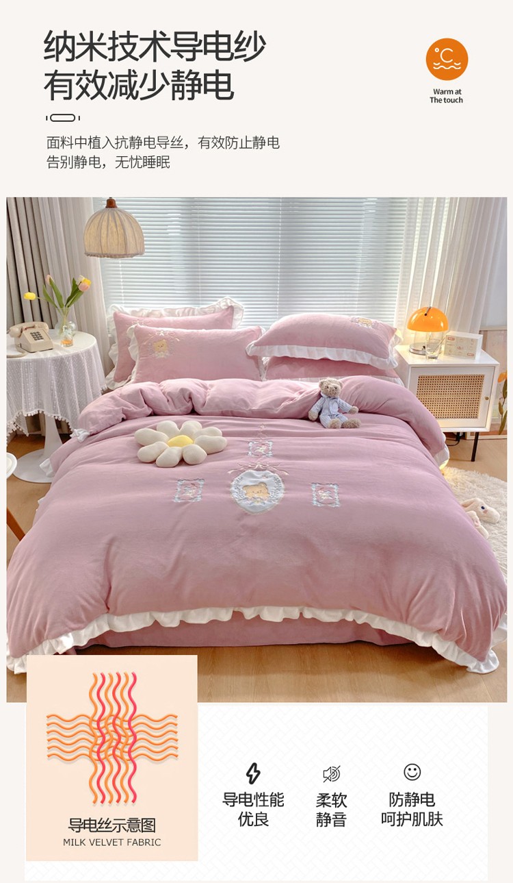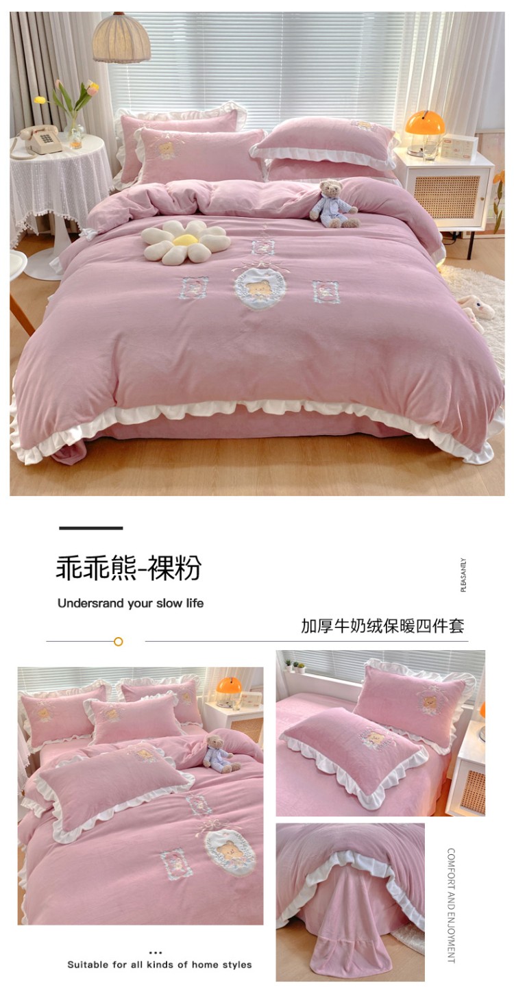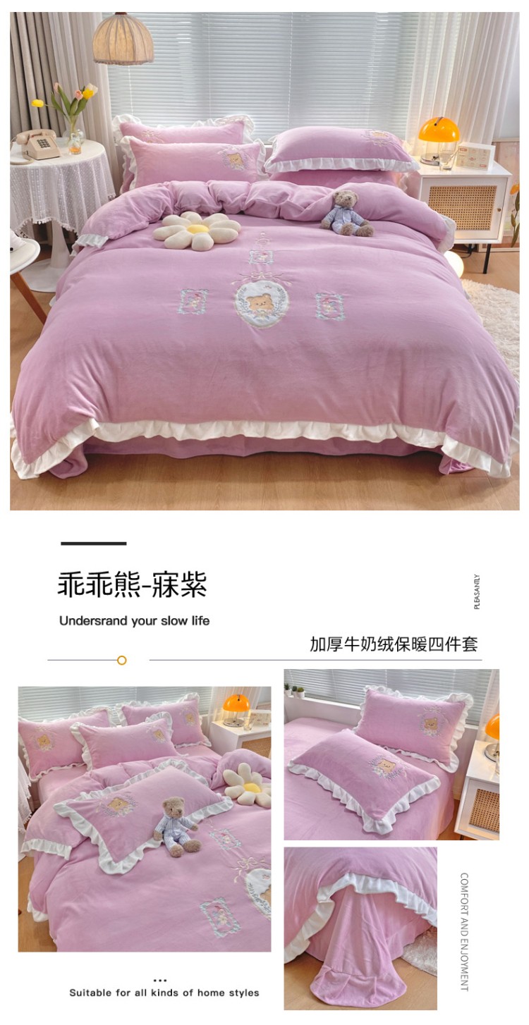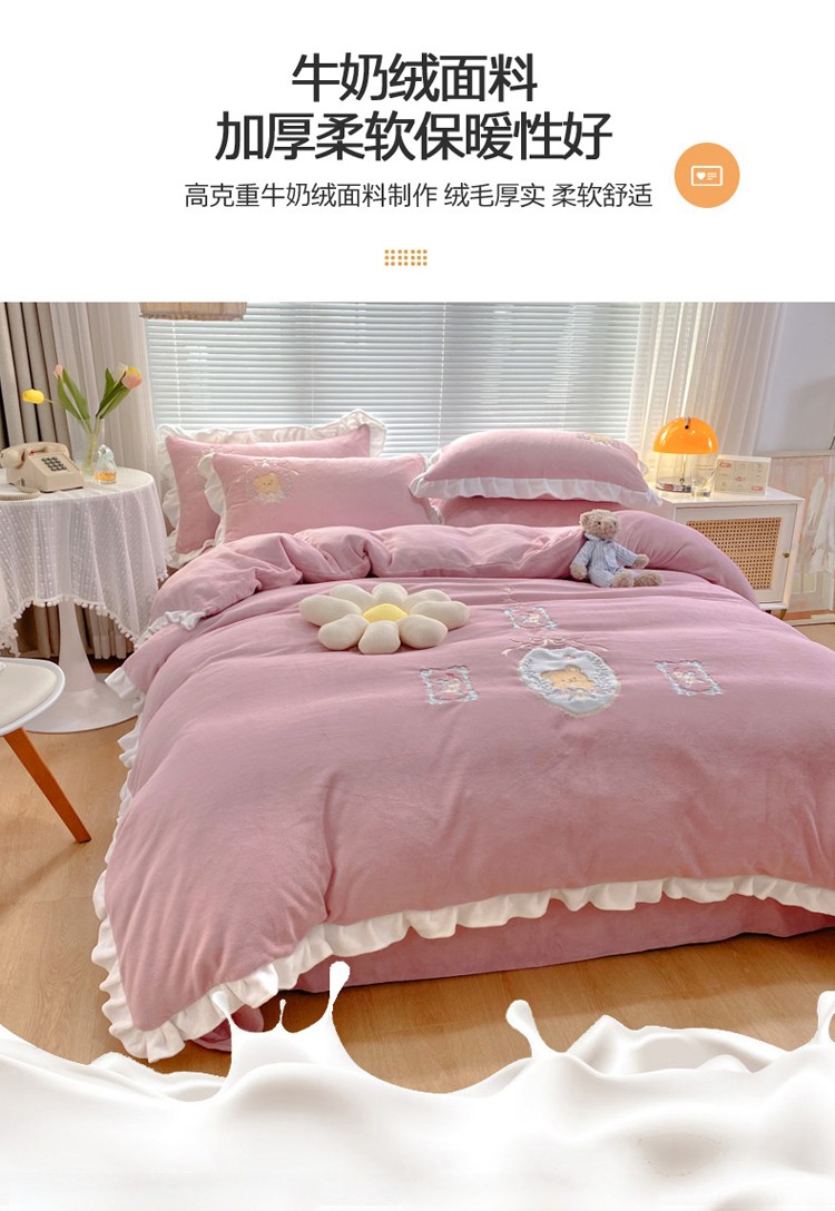 (总)星尚家纺 2024新款加厚保暖全消光牛奶绒夹棉床裙四件套-玫瑰之恋,粉玉,寐紫,浅蓝,水绿