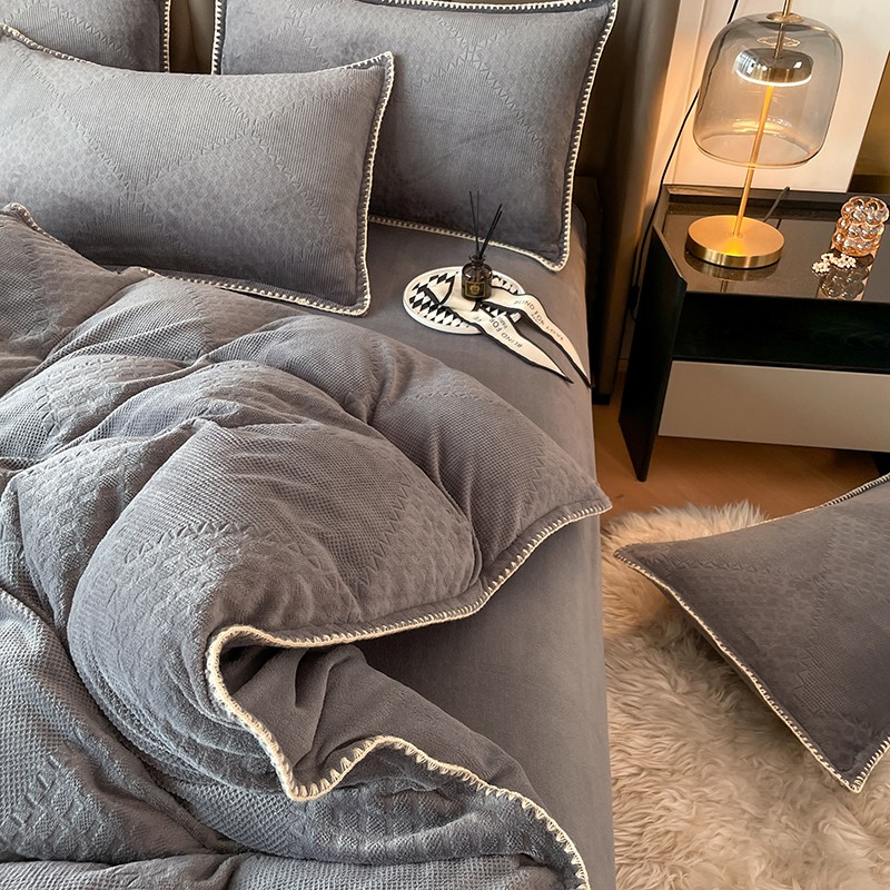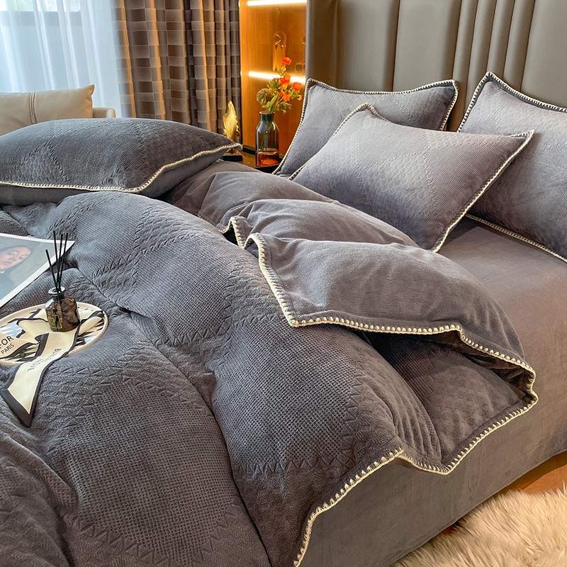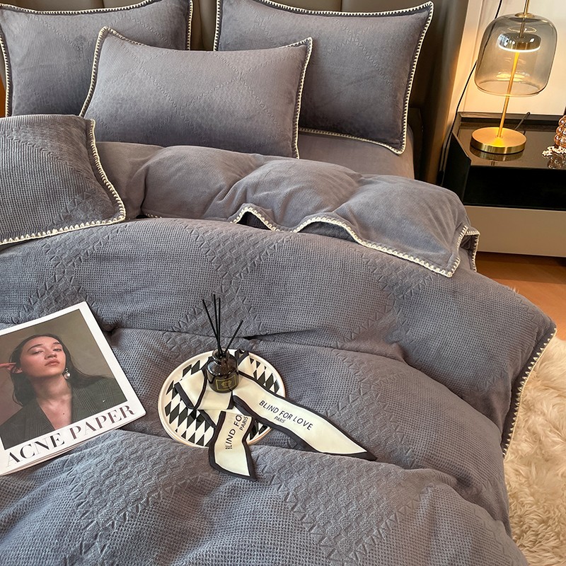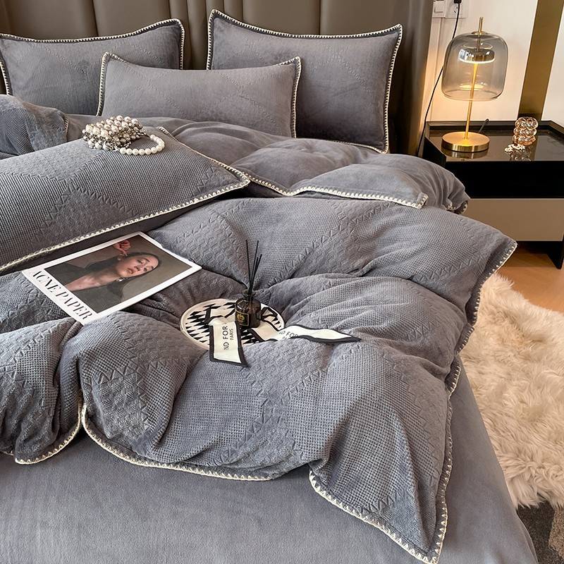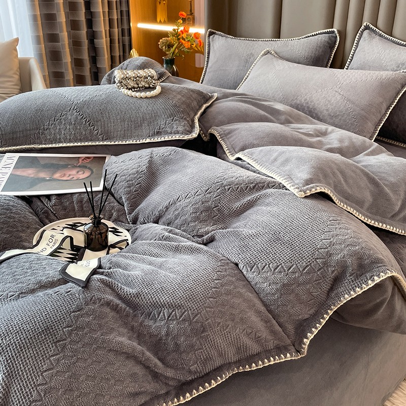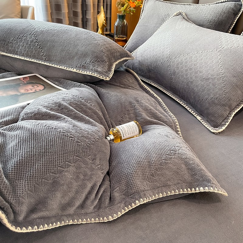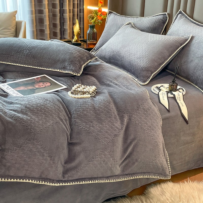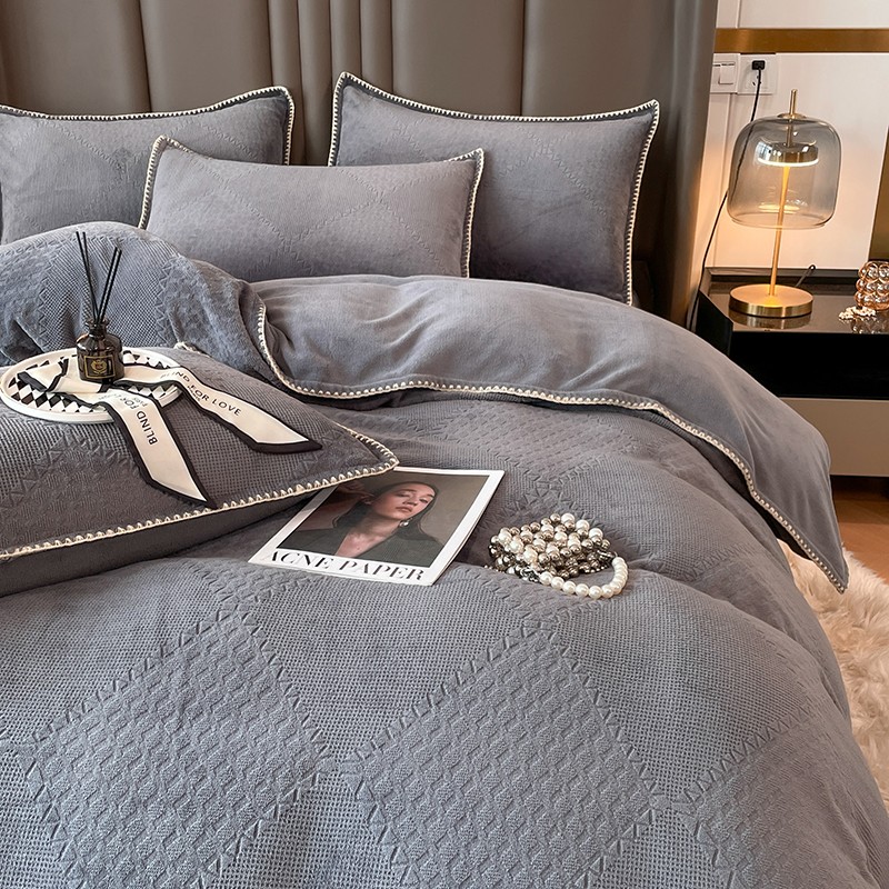 商品名称:金丝鸟 2022新款200克华夫格雕花牛奶绒贝壳边四件套 华夫格灰