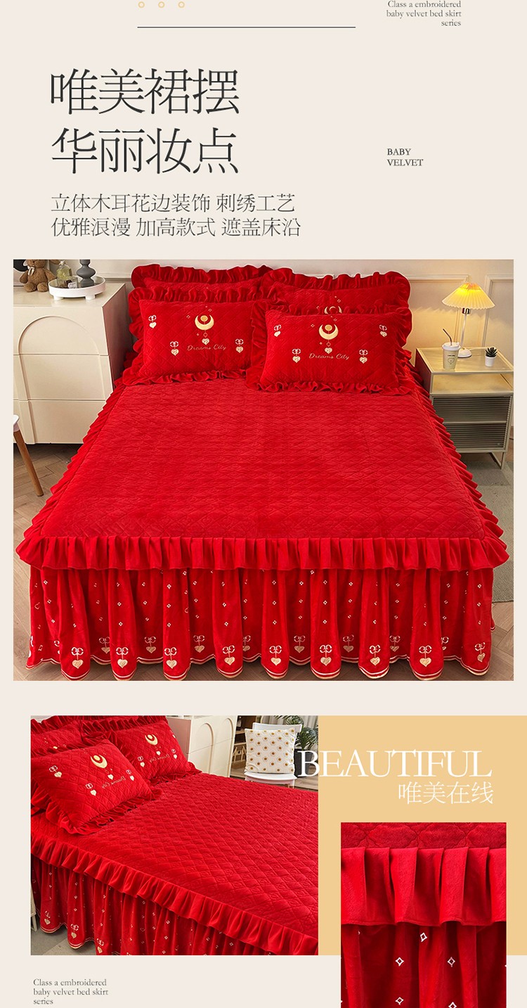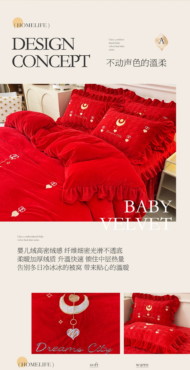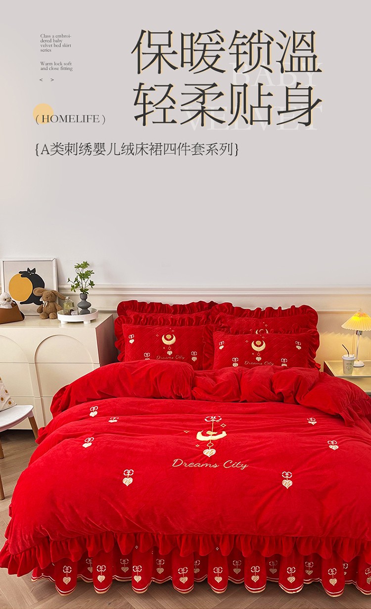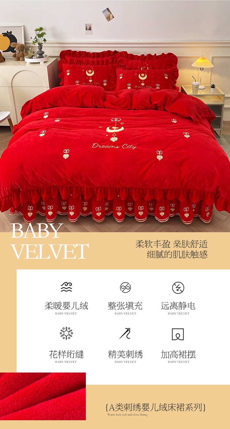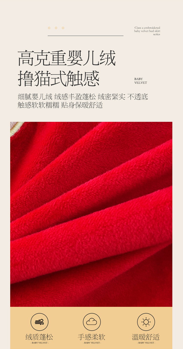 当前位置: 91家纺网 > 商品网购 > 床品套件 > 四件套 > 宝宝绒四件套 > 宜凡家纺 2022新款A类婴儿绒床裙星悦系列四件套 星悦-中国红