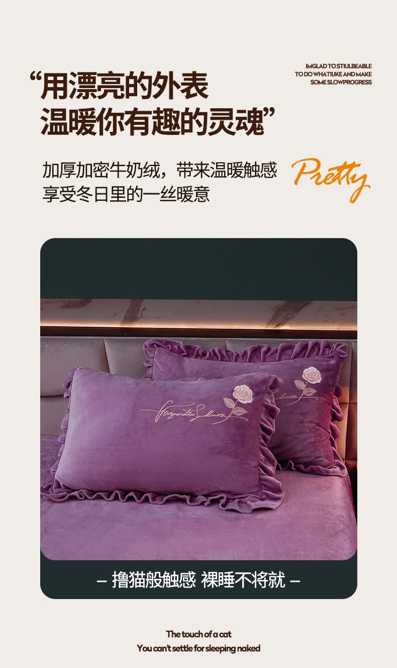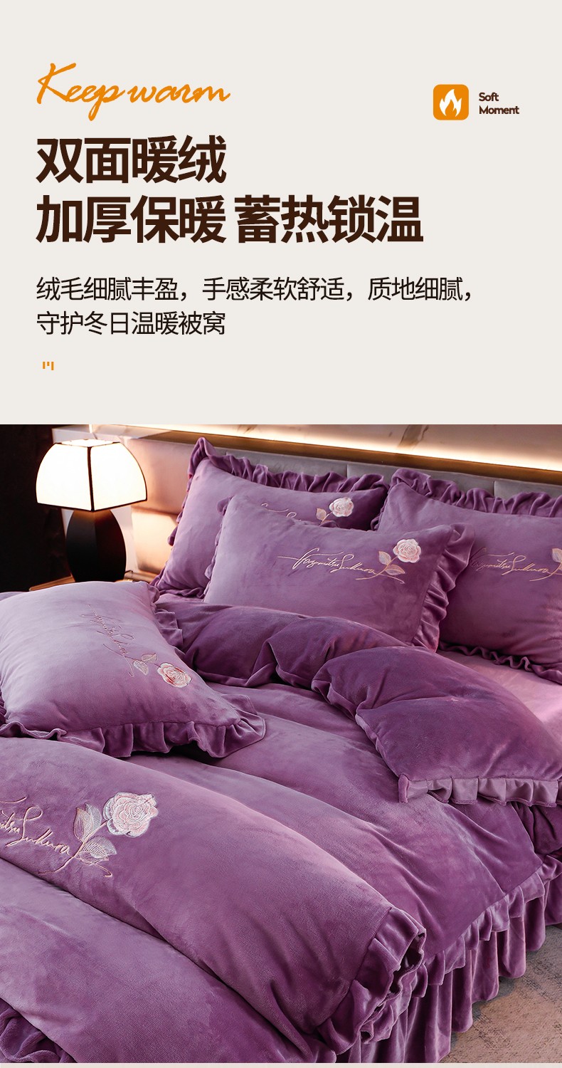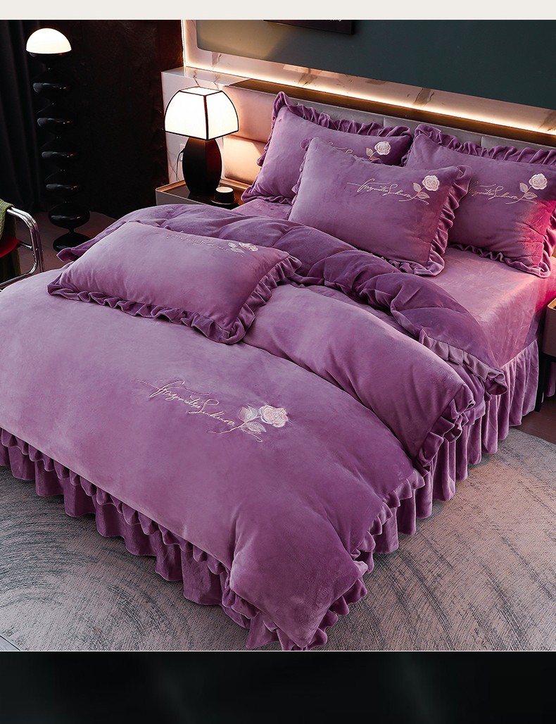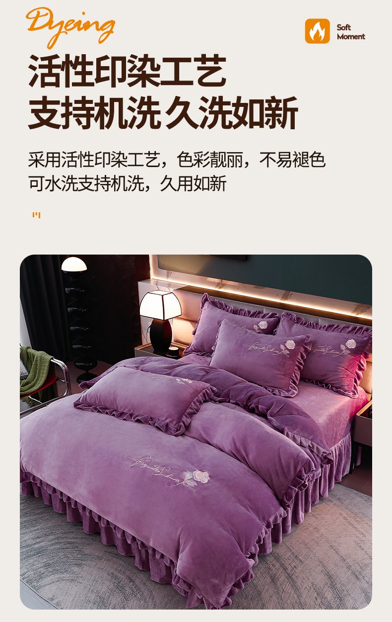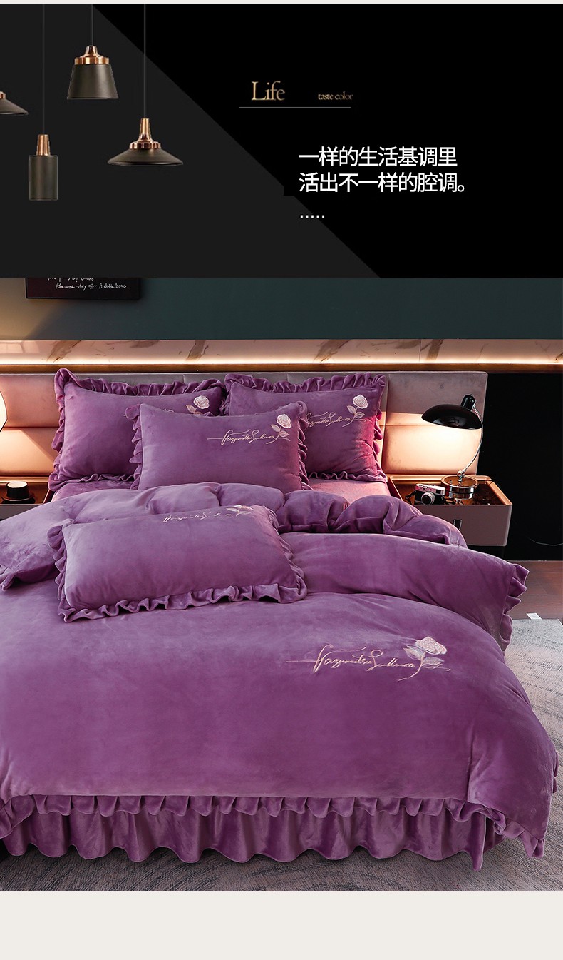 2023牛奶绒保暖四件套韩版蕾丝花边,紫色,松花绿,灰色,豆沙,宾利蓝