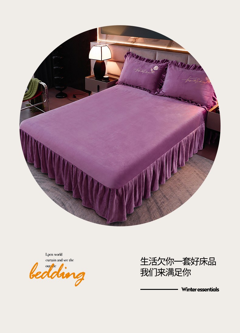 (总)绣女坊2023新款韩版花边床裙款牛奶绒宝宝绒四件套,宾利蓝,豆沙,灰色,酒红色,松花绿,紫色