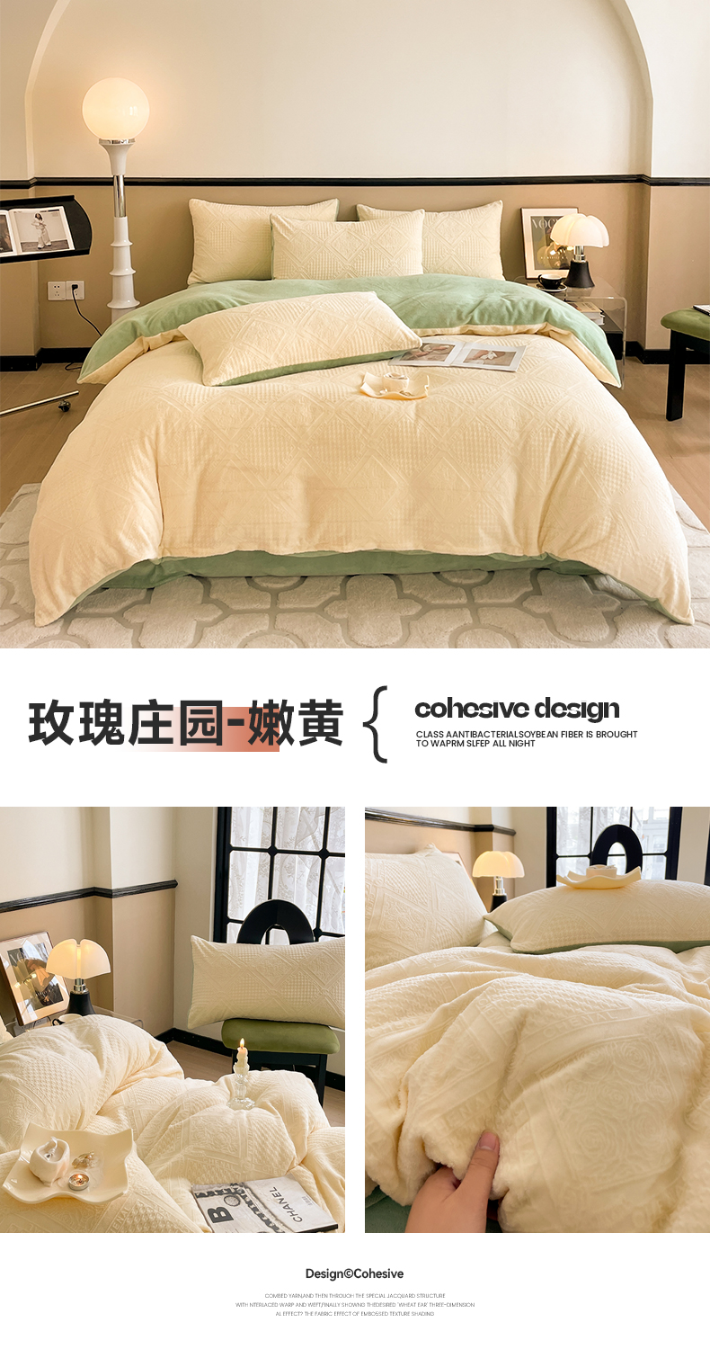 澳梵 2023新款雕花牛奶绒四件套 玫瑰庄园-米黄