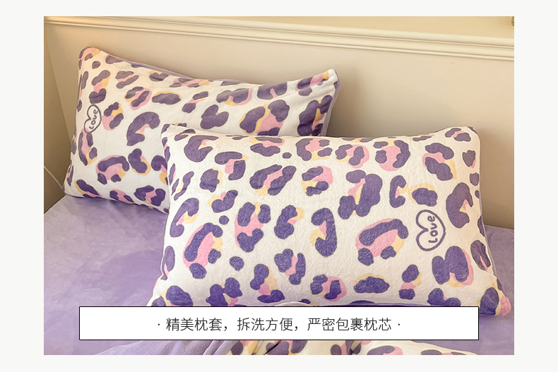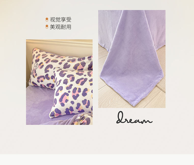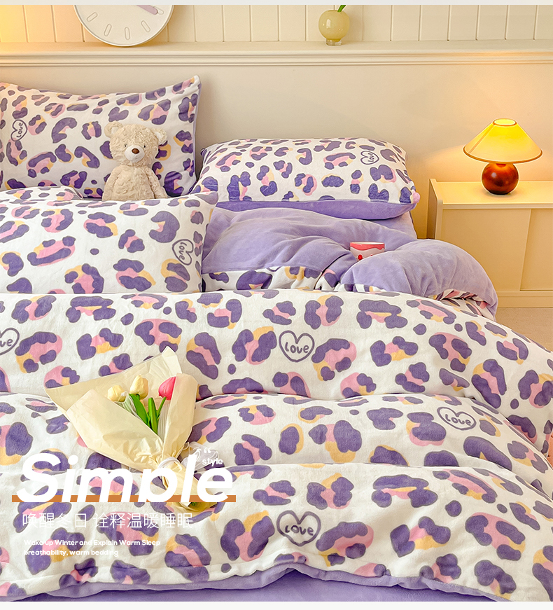 桃子家居 2023新款ins韩系简约卡通奶油小清新加厚牛奶绒系列四件套 绒-紫豹纹