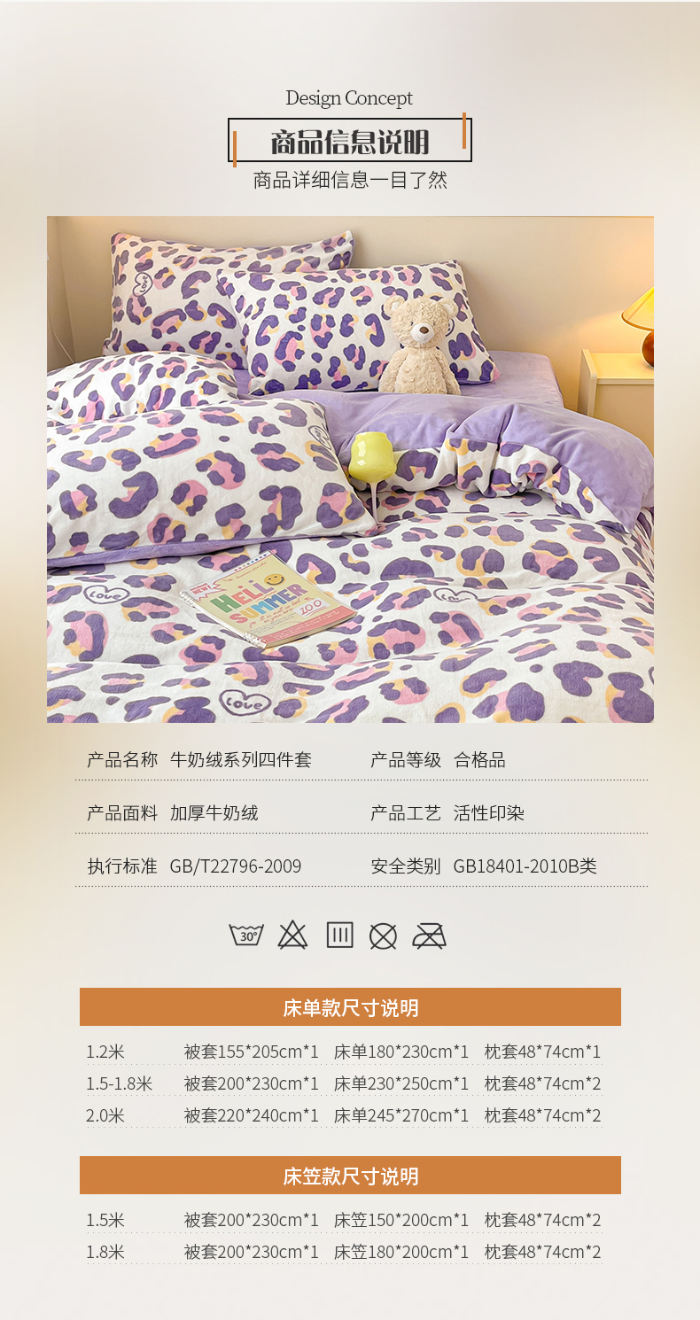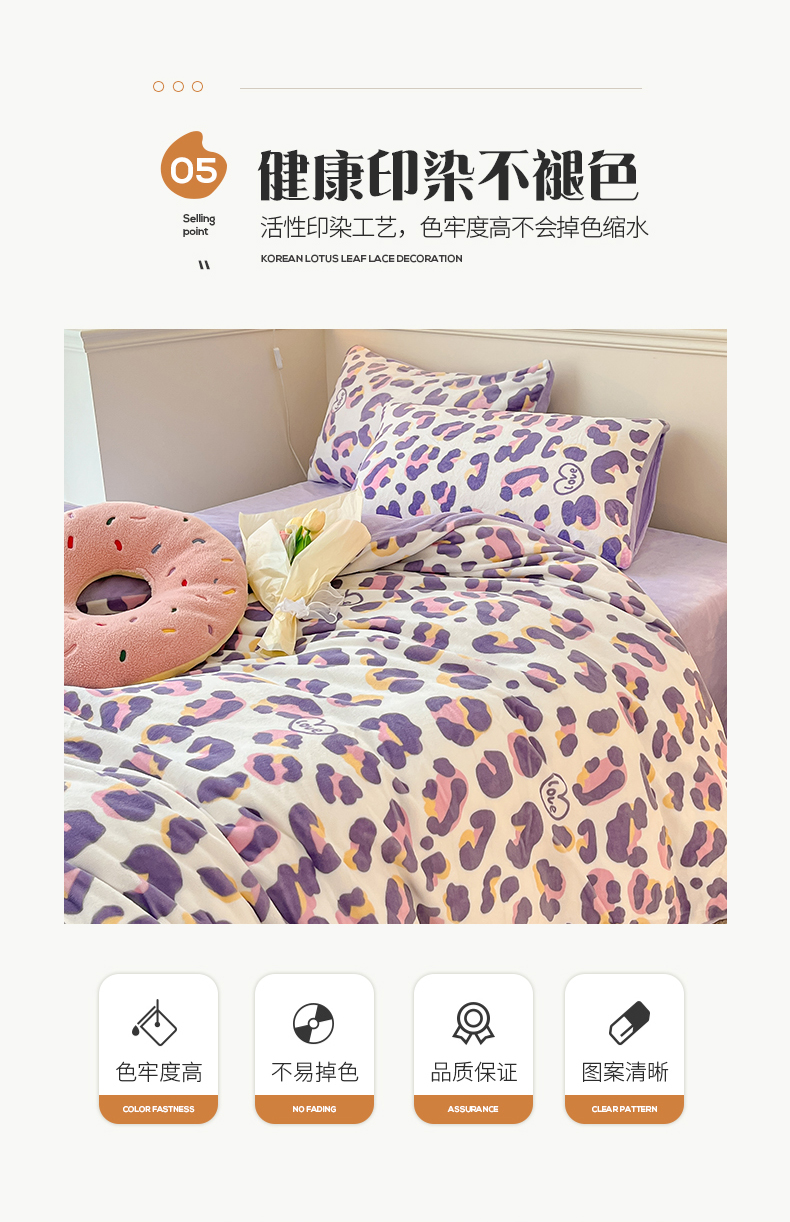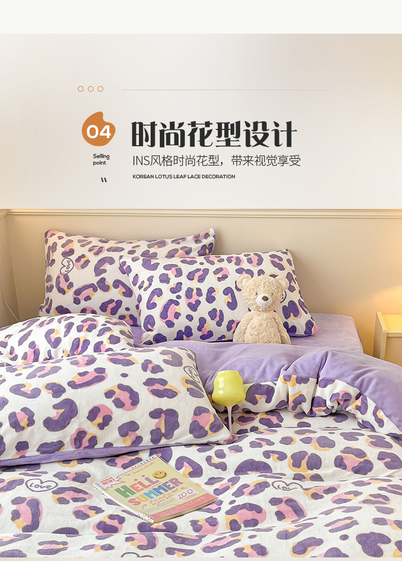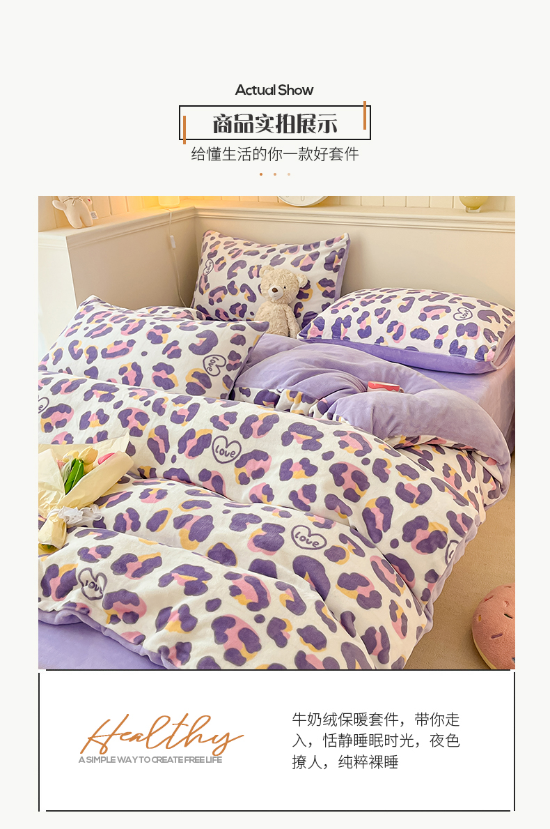 商品名称:桃子家居 2023新款ins韩系简约卡通奶油小清新加厚牛奶绒系列四件套 绒-紫豹纹