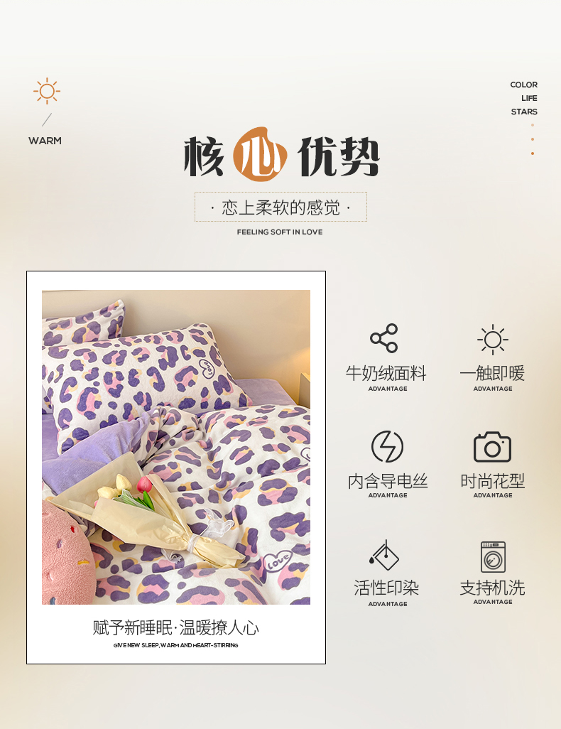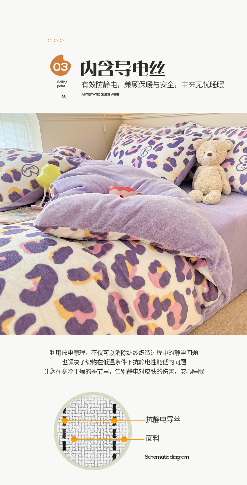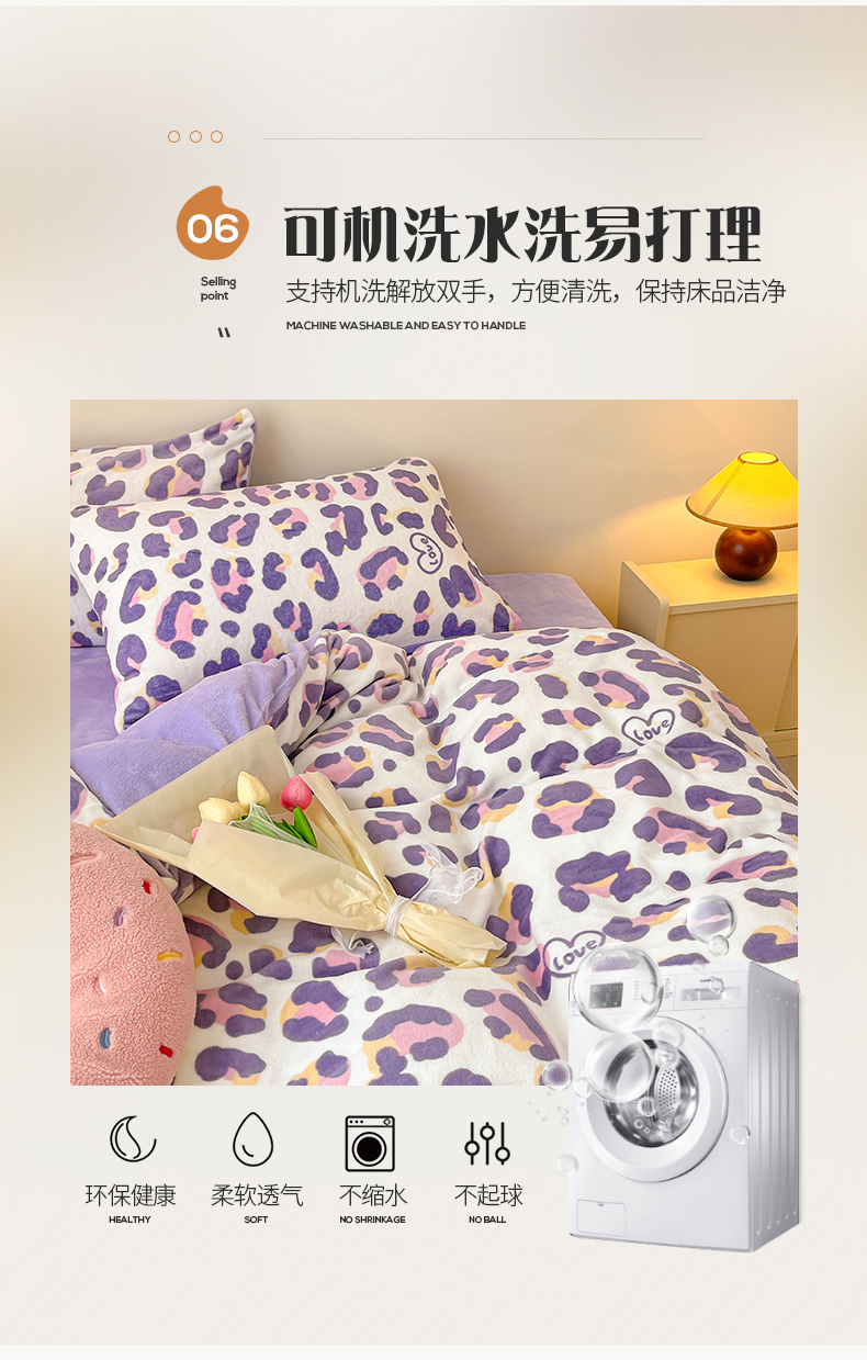 商品名称:桃子家居 2023新款ins韩系简约卡通奶油小清新加厚牛奶绒系列四件套 绒-紫豹纹