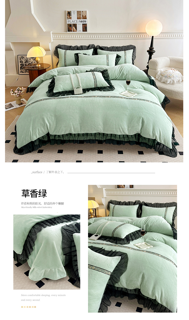 商品名称:其奥 2023新款法式大花边轻奢风纯色加厚牛奶绒四件套 草香绿
