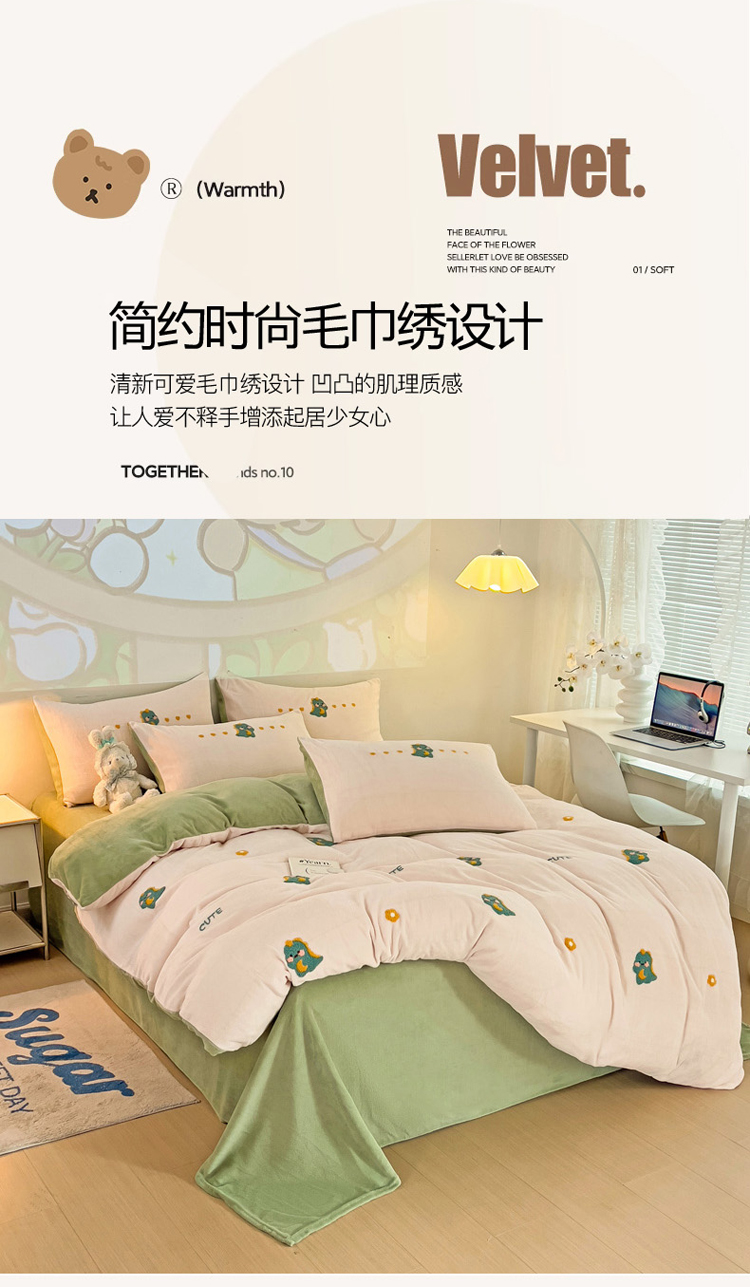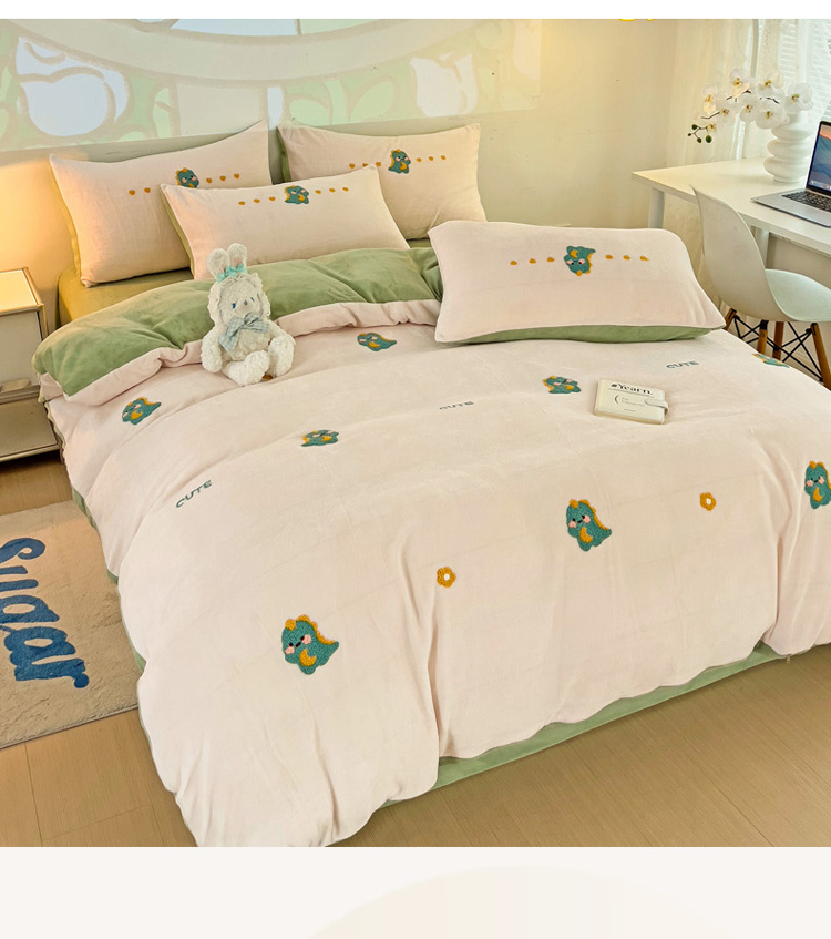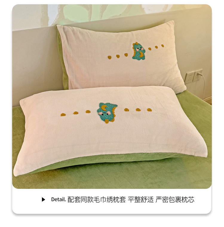商品名称:寐居家纺 2023新款高克重牛奶绒毛巾绣四件套 萌宠恐龙-绿