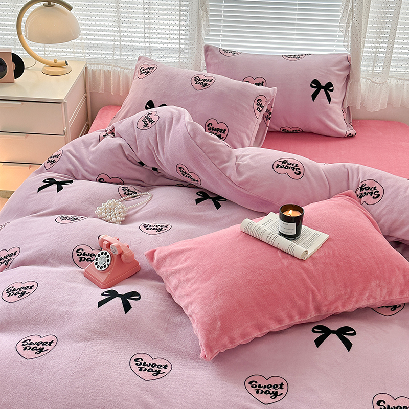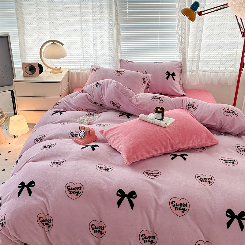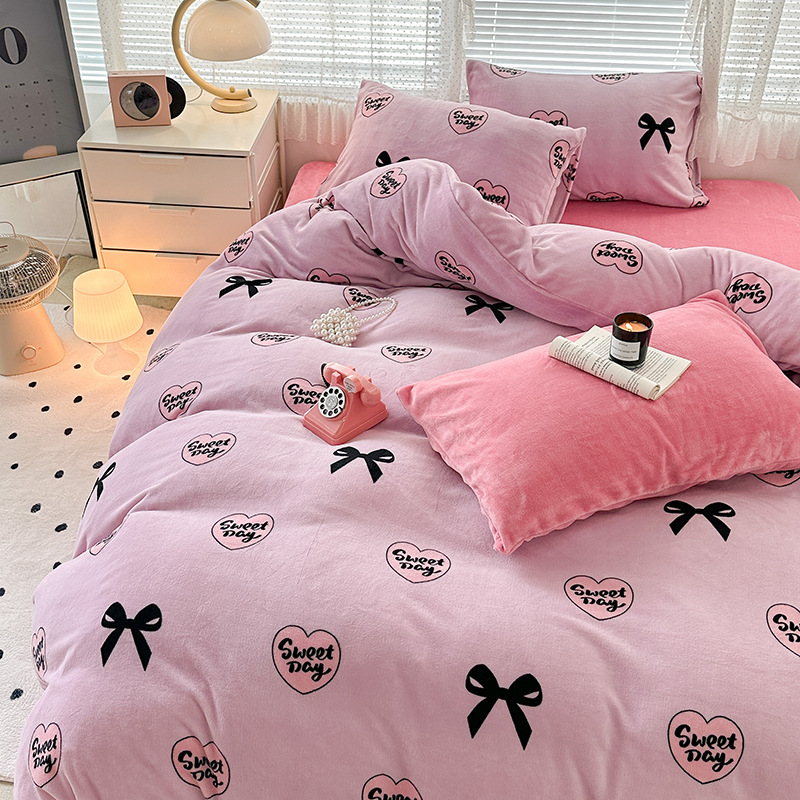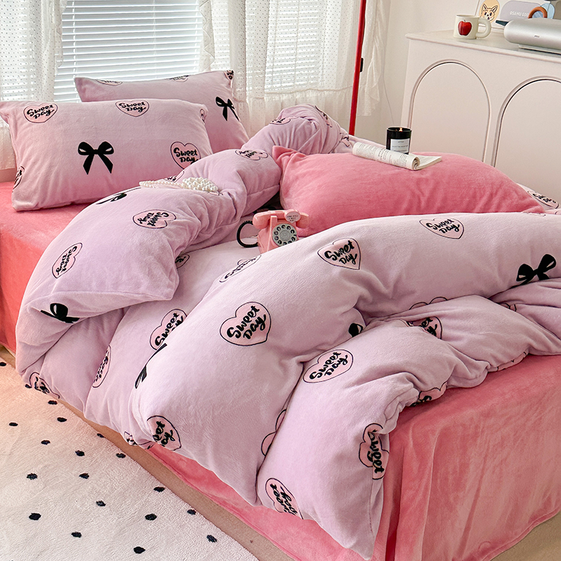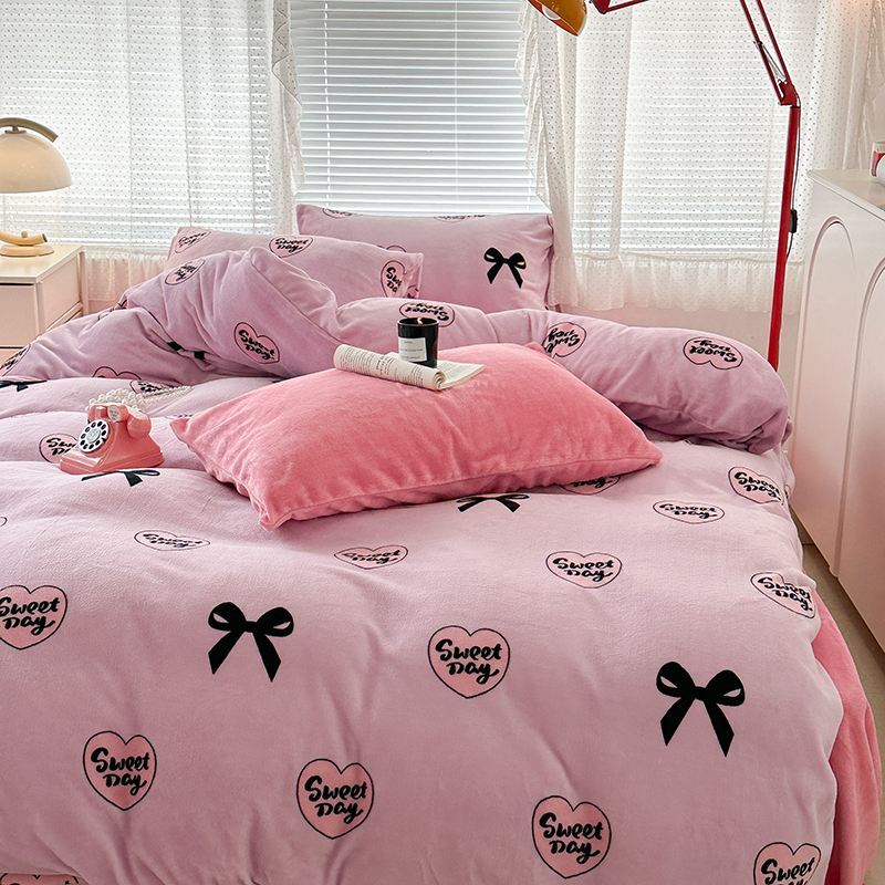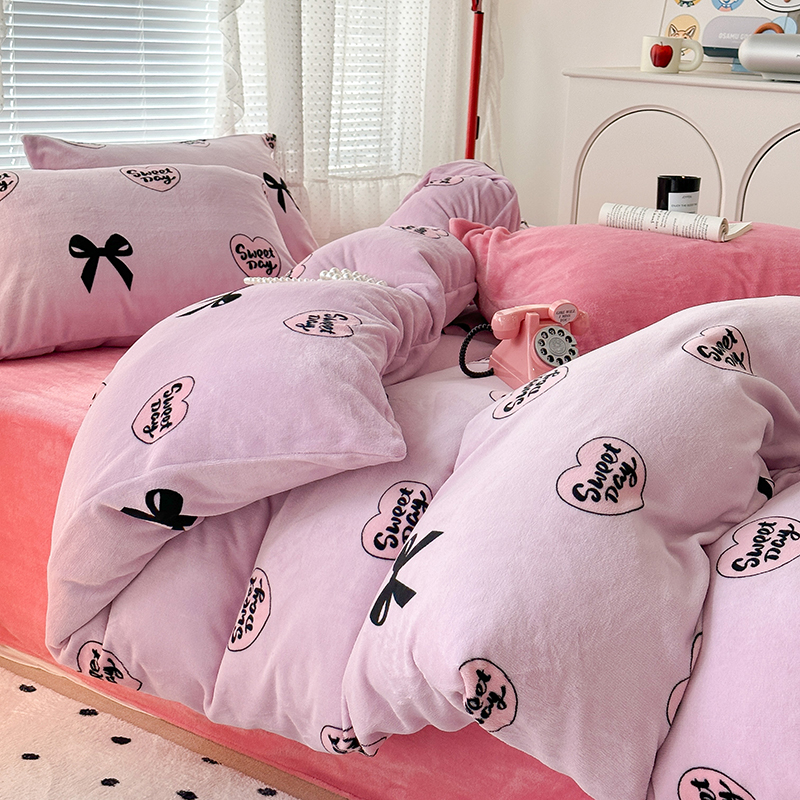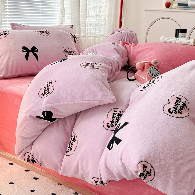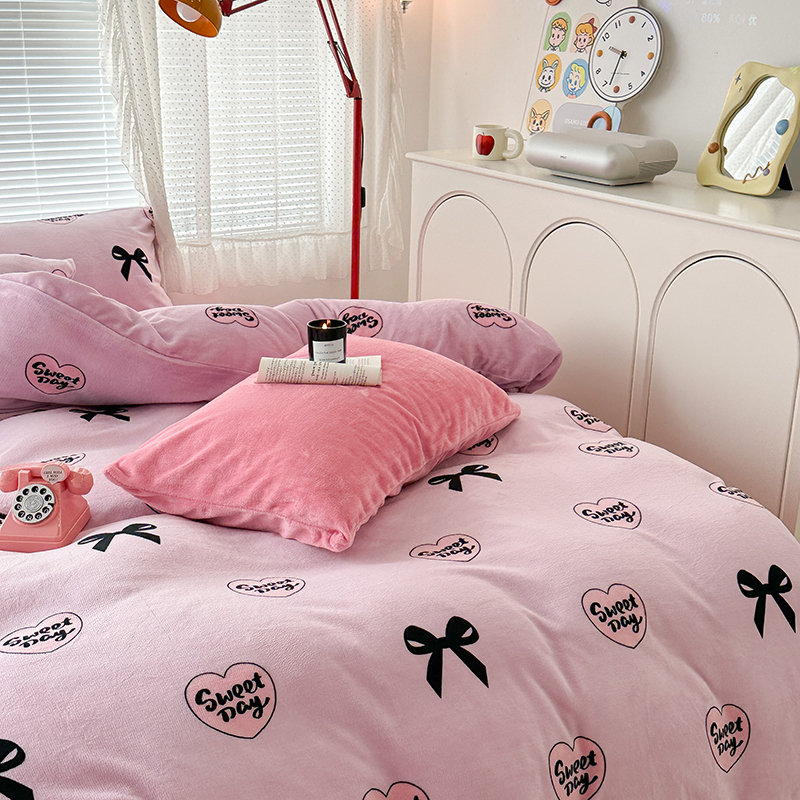 商品名称:昔可家纺 2023新款高克重印花牛奶绒小清新系列四件套 黑粉芭蕾少女心