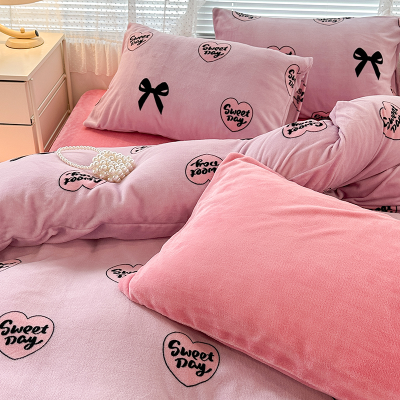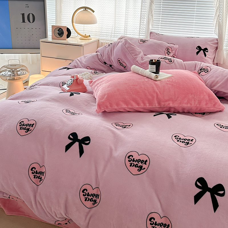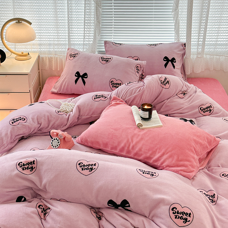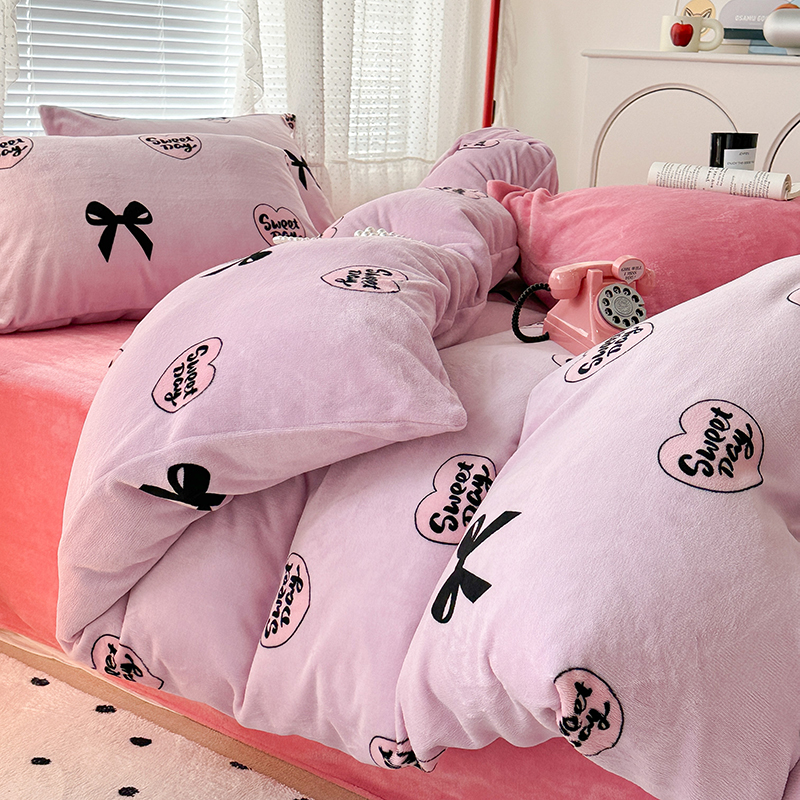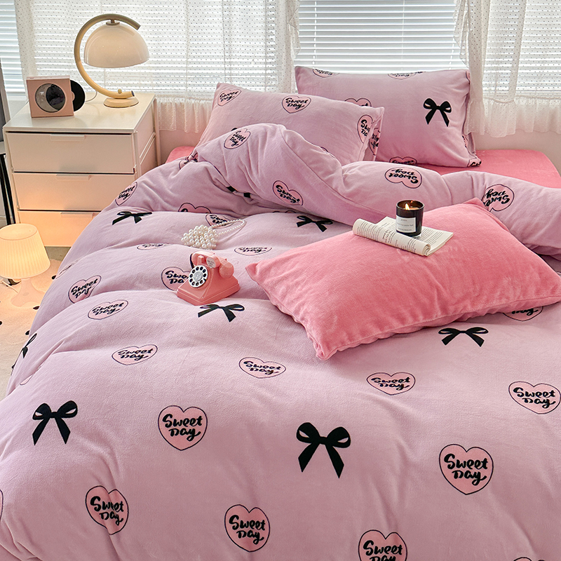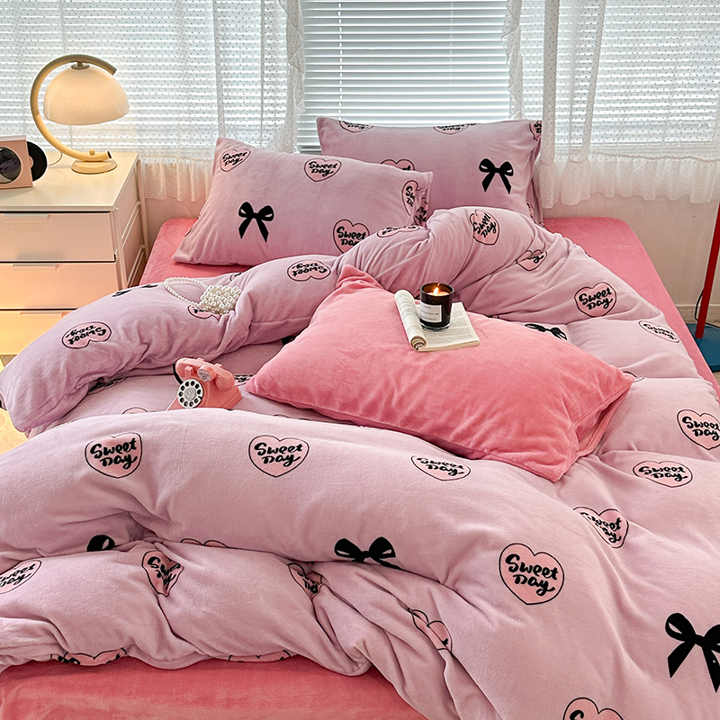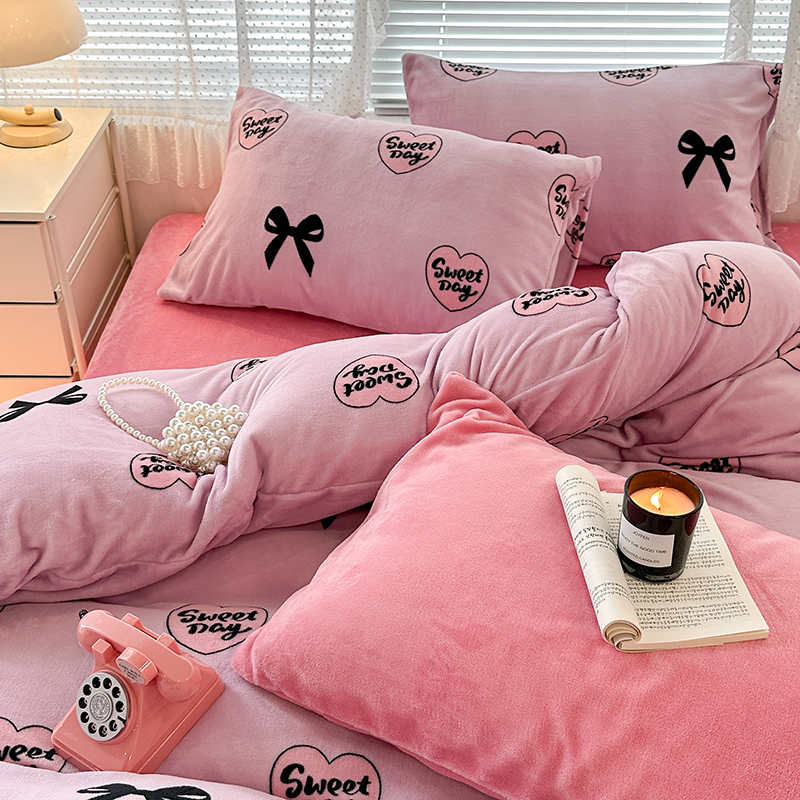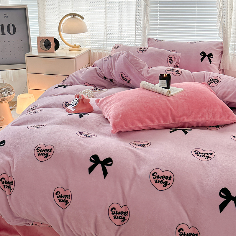 商品名称:昔可家纺 2023新款高克重印花牛奶绒小清新系列四件套 黑粉芭蕾少女心
