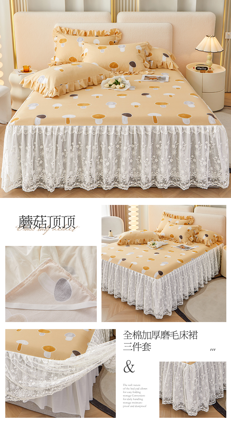 商品名称:宜凡家纺 2023新款全棉加厚磨印花毛床裙三件套 蘑菇顶顶
