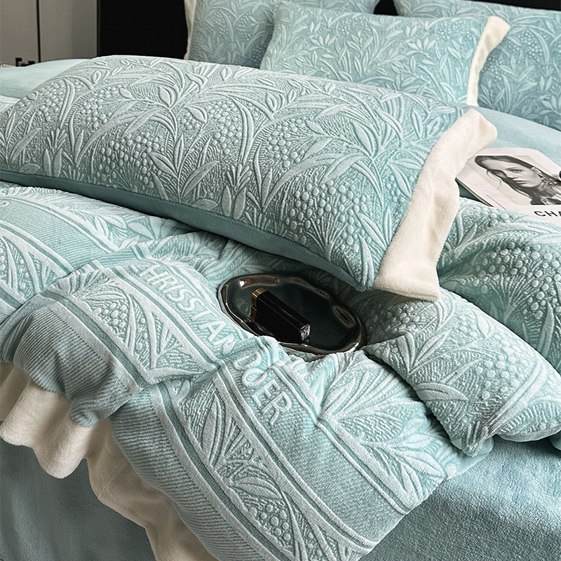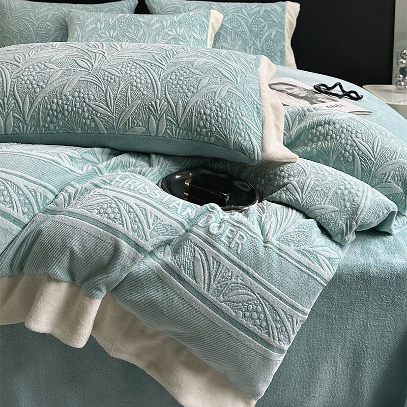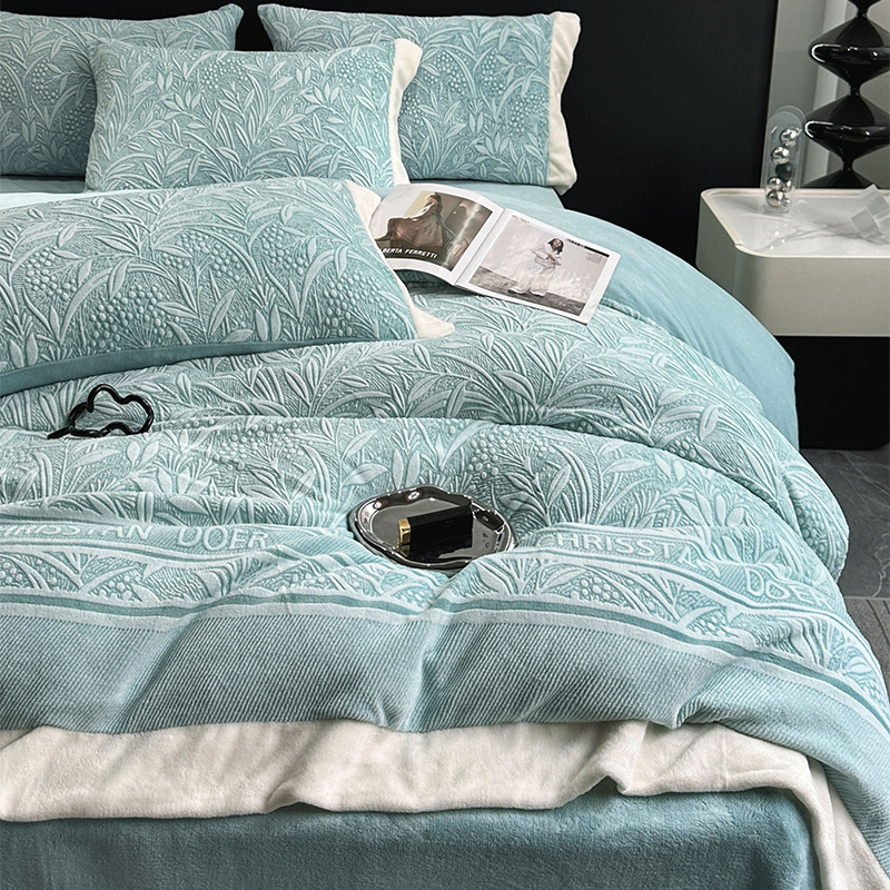 商品名称:宅家居 2023新款高奢加厚A类高克重浮雕花绒剪花烂花牛奶绒四件套 芳华-湖蓝