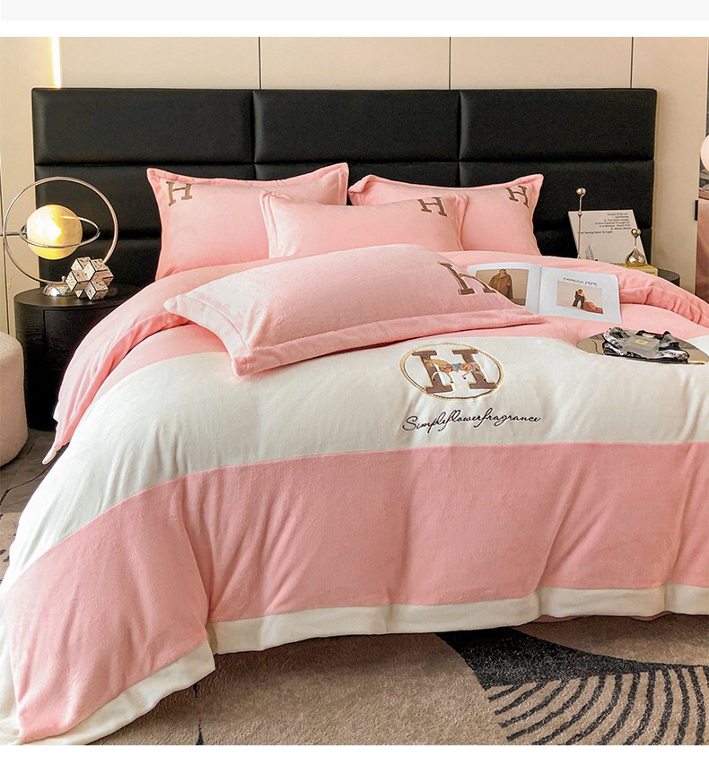 230克牛奶绒拼接刺绣四件套艾琳系列大牌刺绣四件套 奶油粉