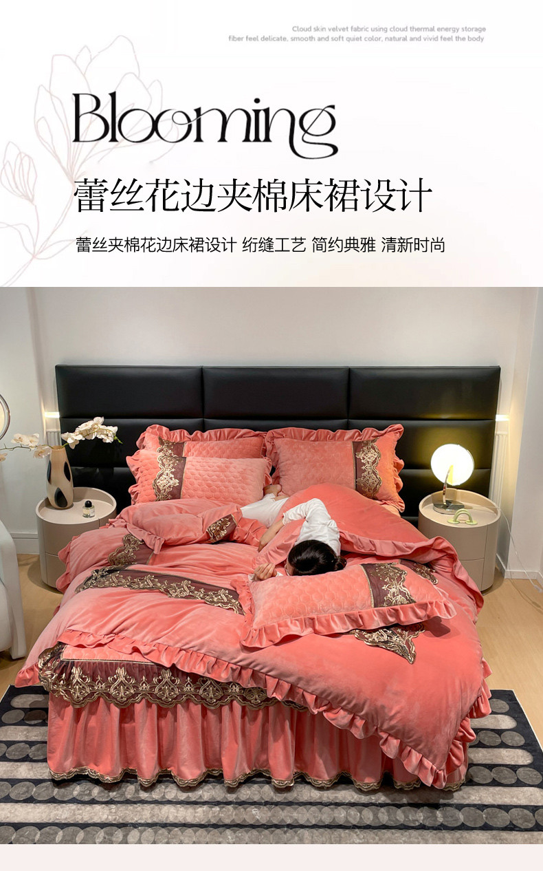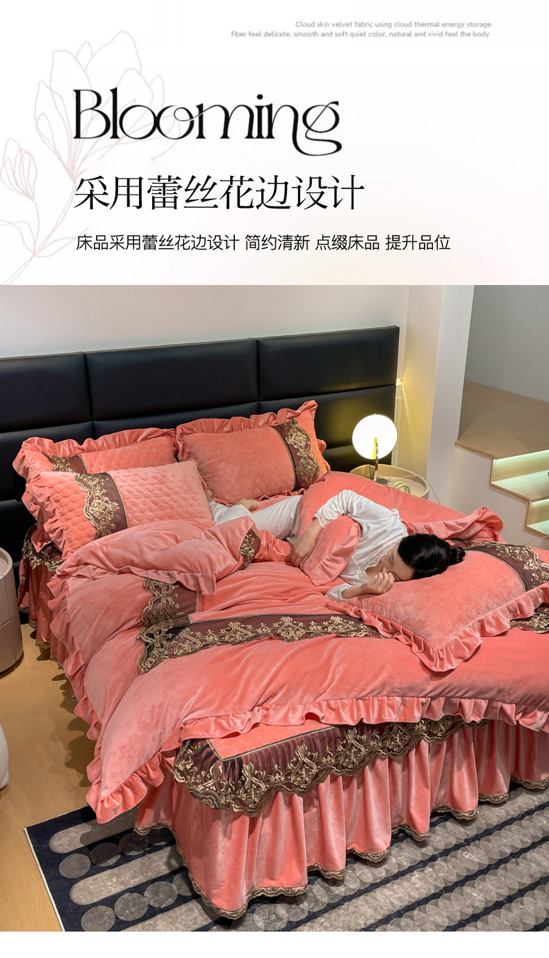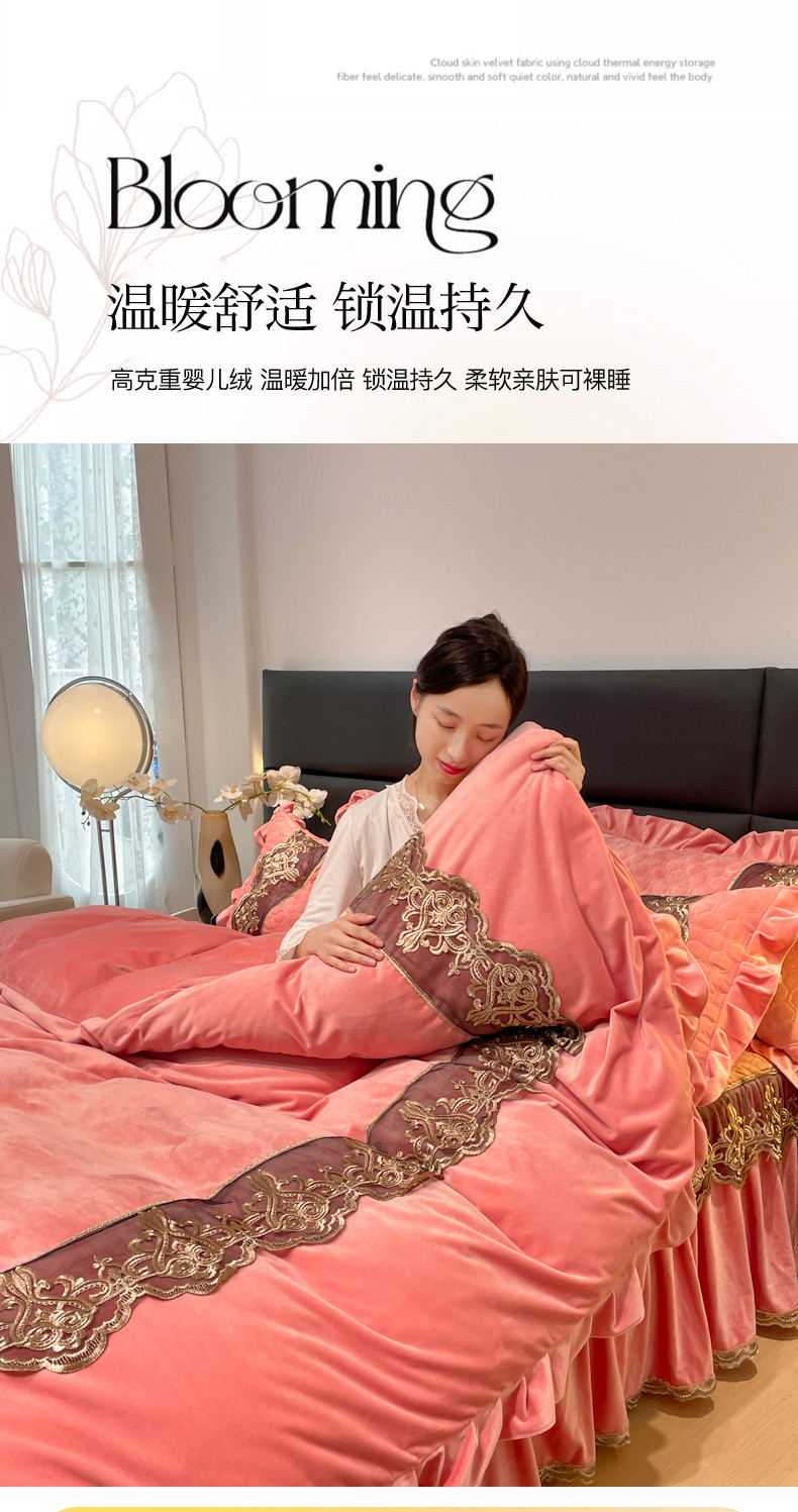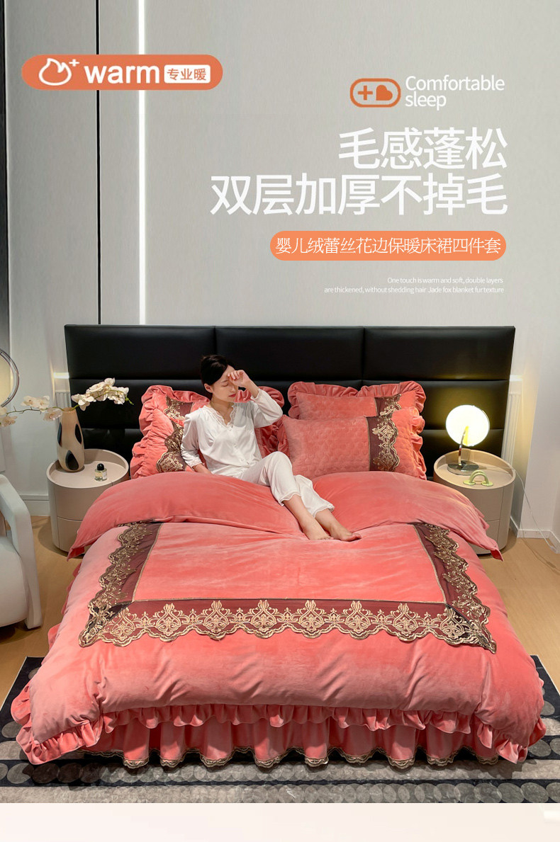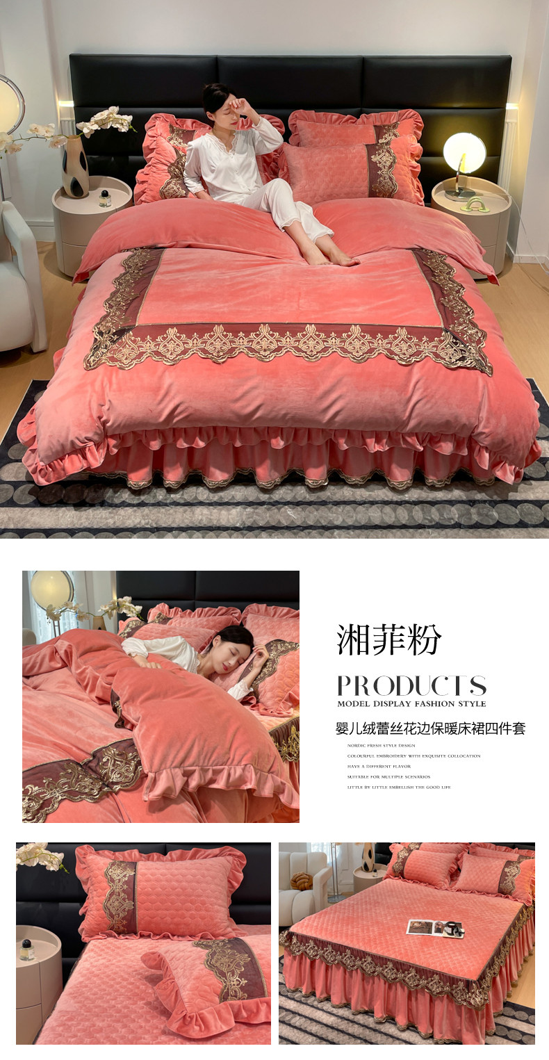 当前位置: 91家纺网 > 商品网购 > 床品套件 > 四件套 > 宝宝绒四件套 > 忘忧草 2023新款婴儿绒夹棉床裙四件套-爱莎 湘菲粉