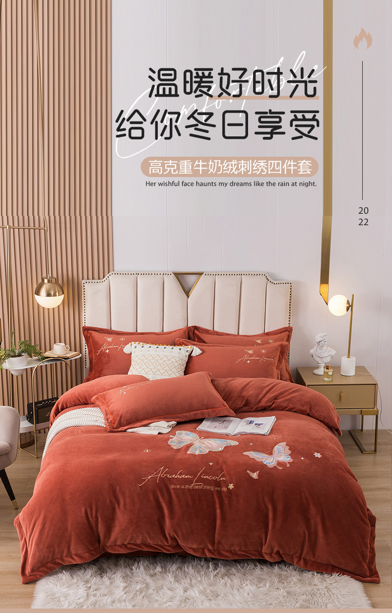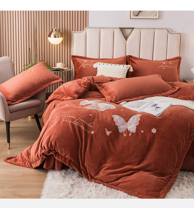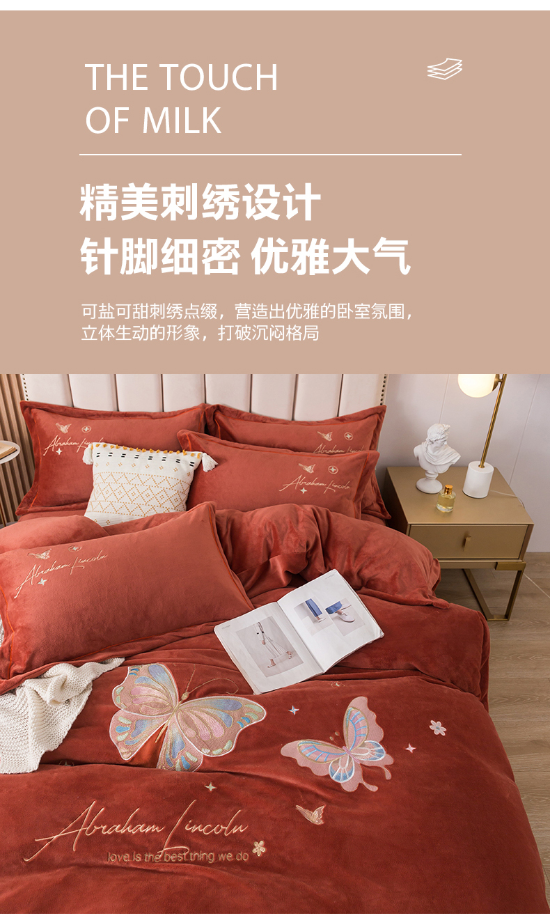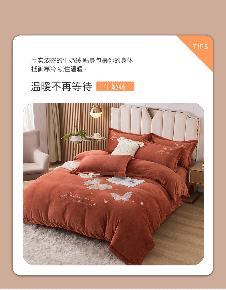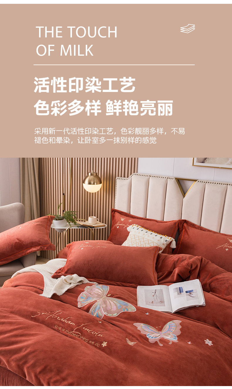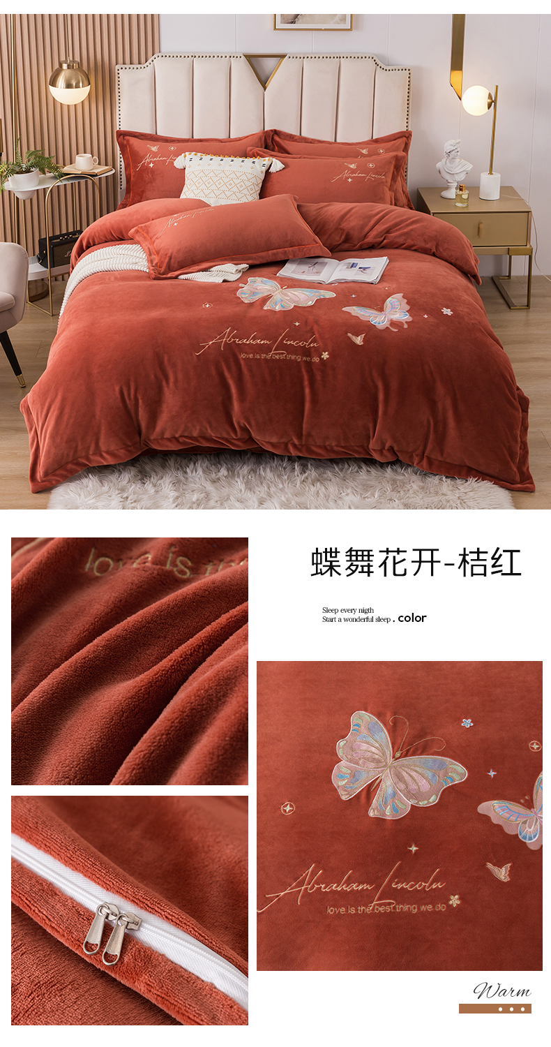 商品名称:找底底家纺 2023款220克全消光重工刺绣纯色牛奶绒四件套-蝶舞花开 蝶舞花开-桔红