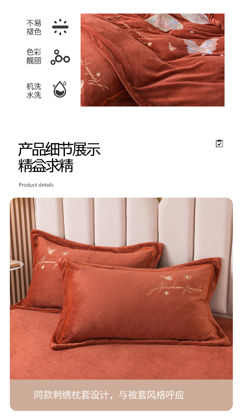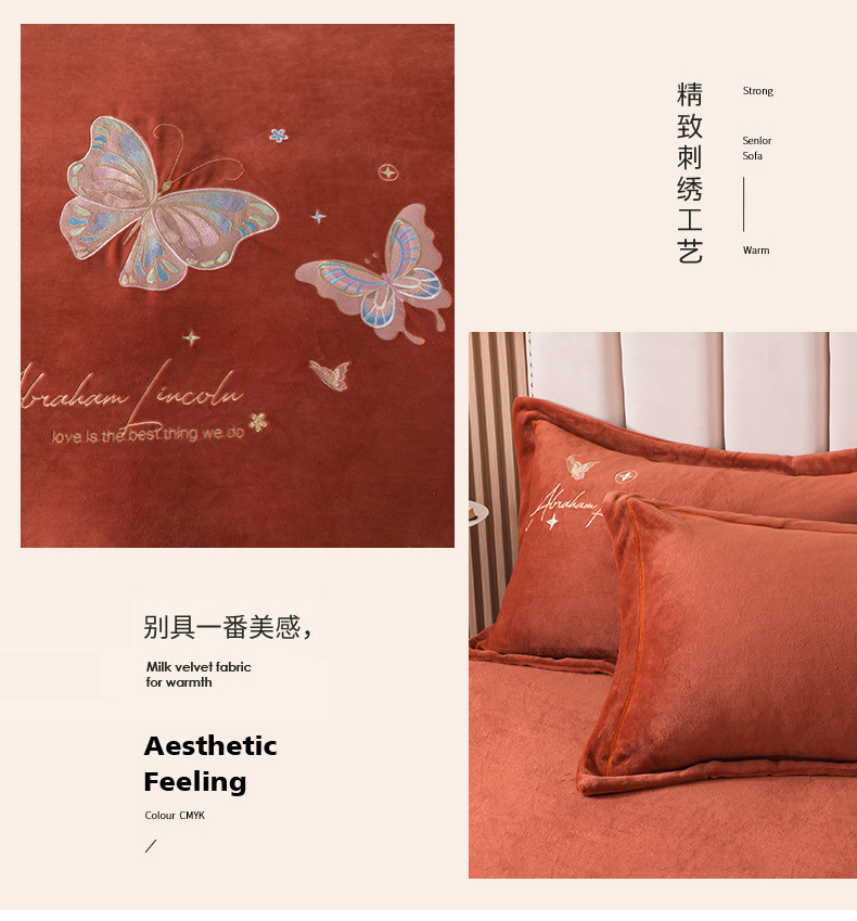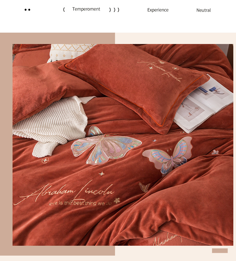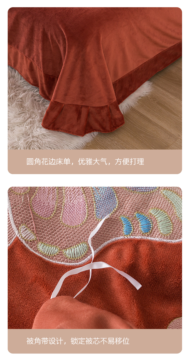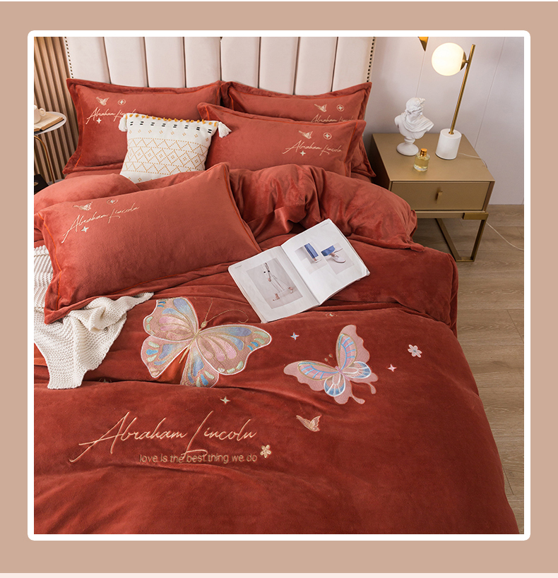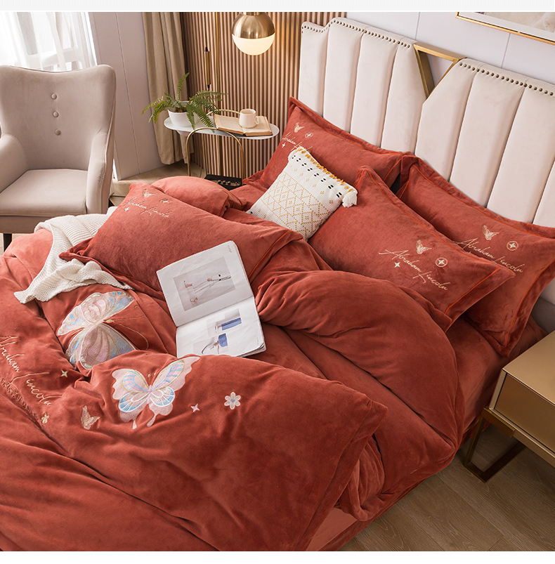 商品名称:找底底家纺 2023款220克全消光重工刺绣纯色牛奶绒四件套-蝶舞花开 蝶舞花开-桔红