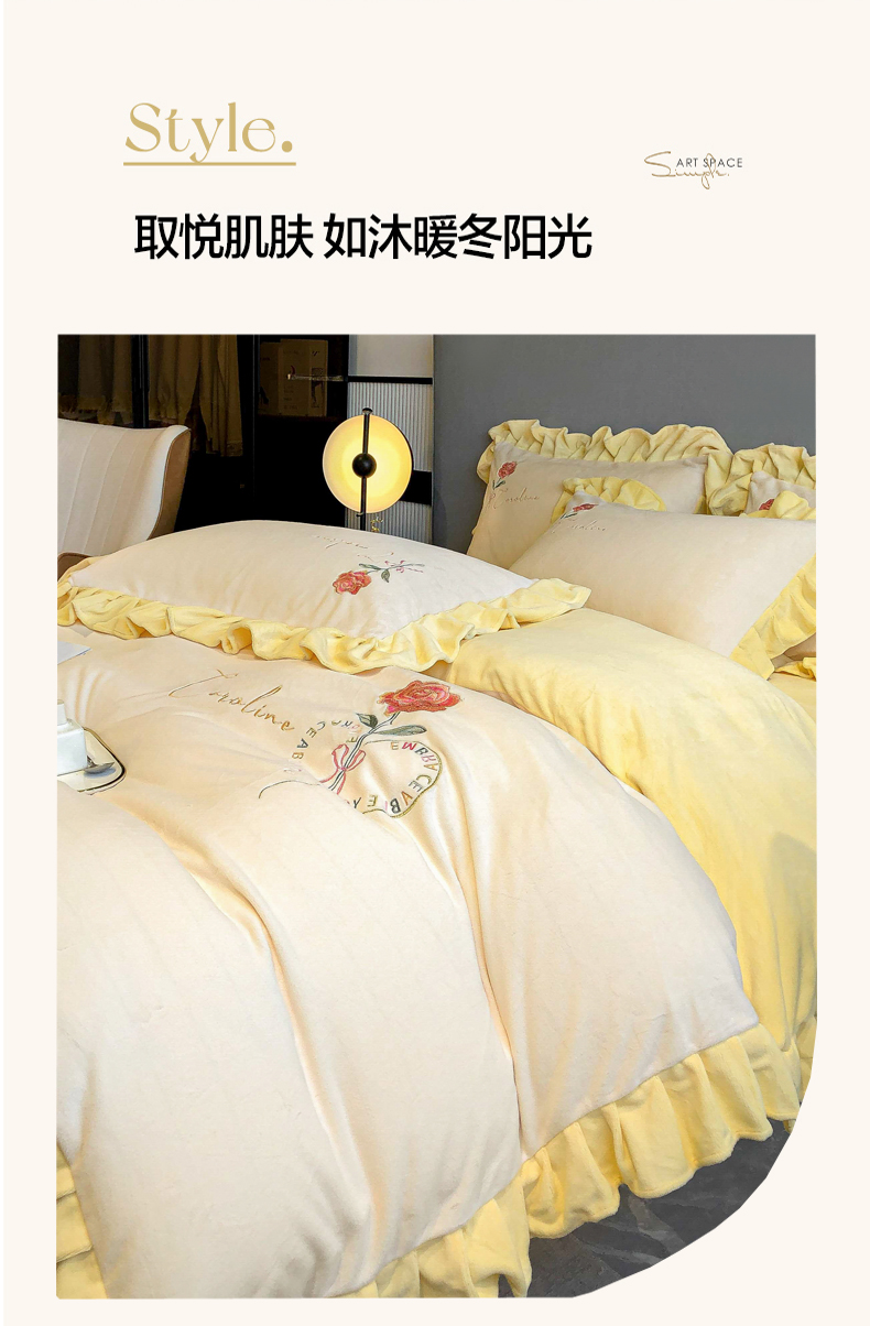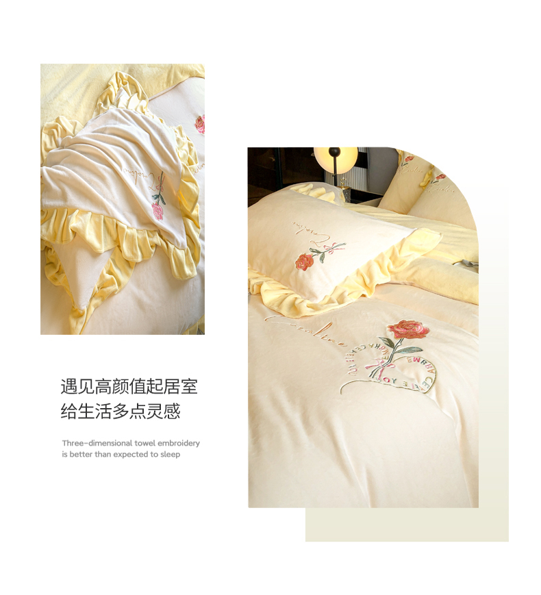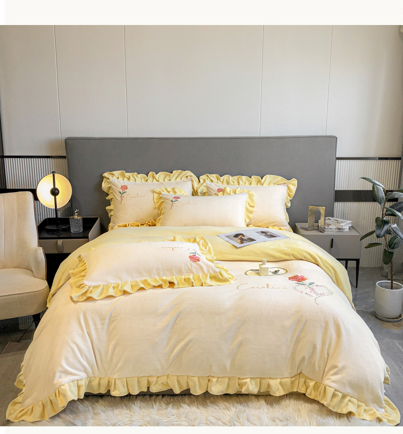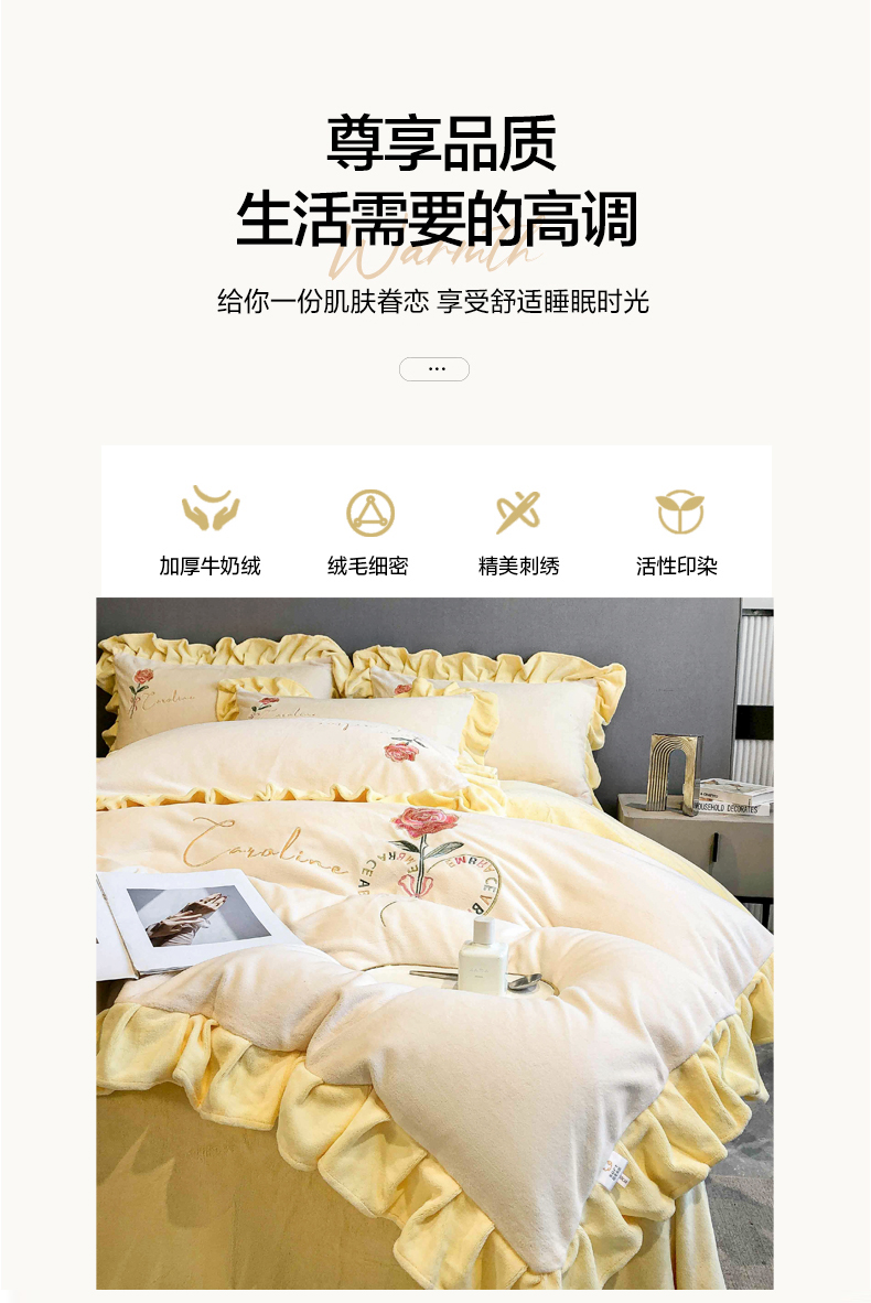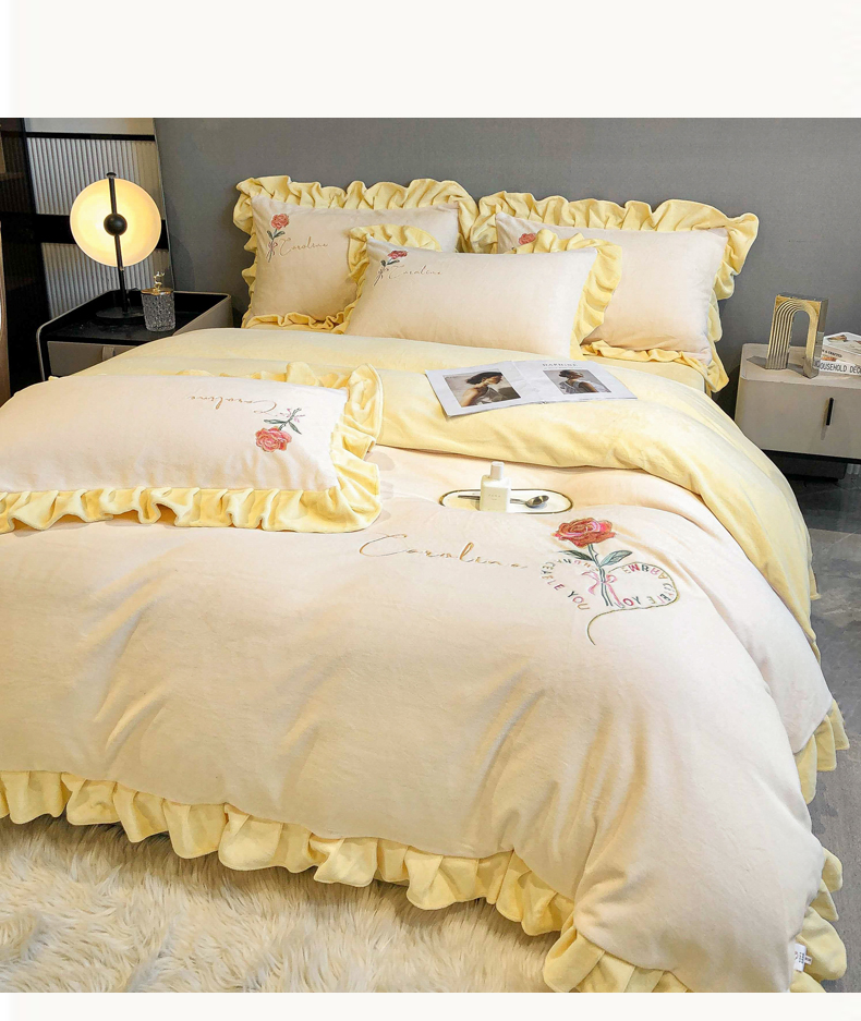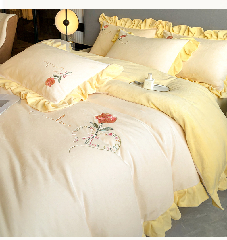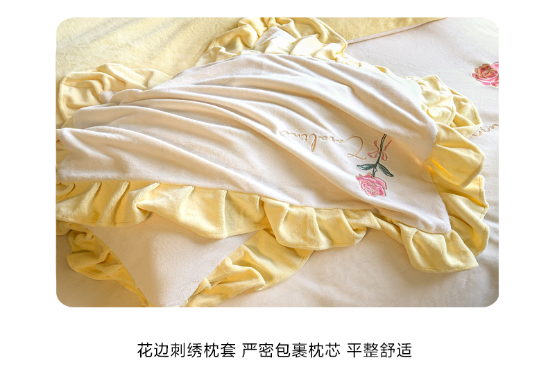 当前位置: 91家纺网 > 商品网购 > 床品套件 > 四件套 > 牛奶绒四件套 > 7V 2024新款韩版花边牛奶绒刺绣四件套8斤多加厚牛奶绒面料法兰绒宝宝绒 偏爱-暖白+嫩黄
