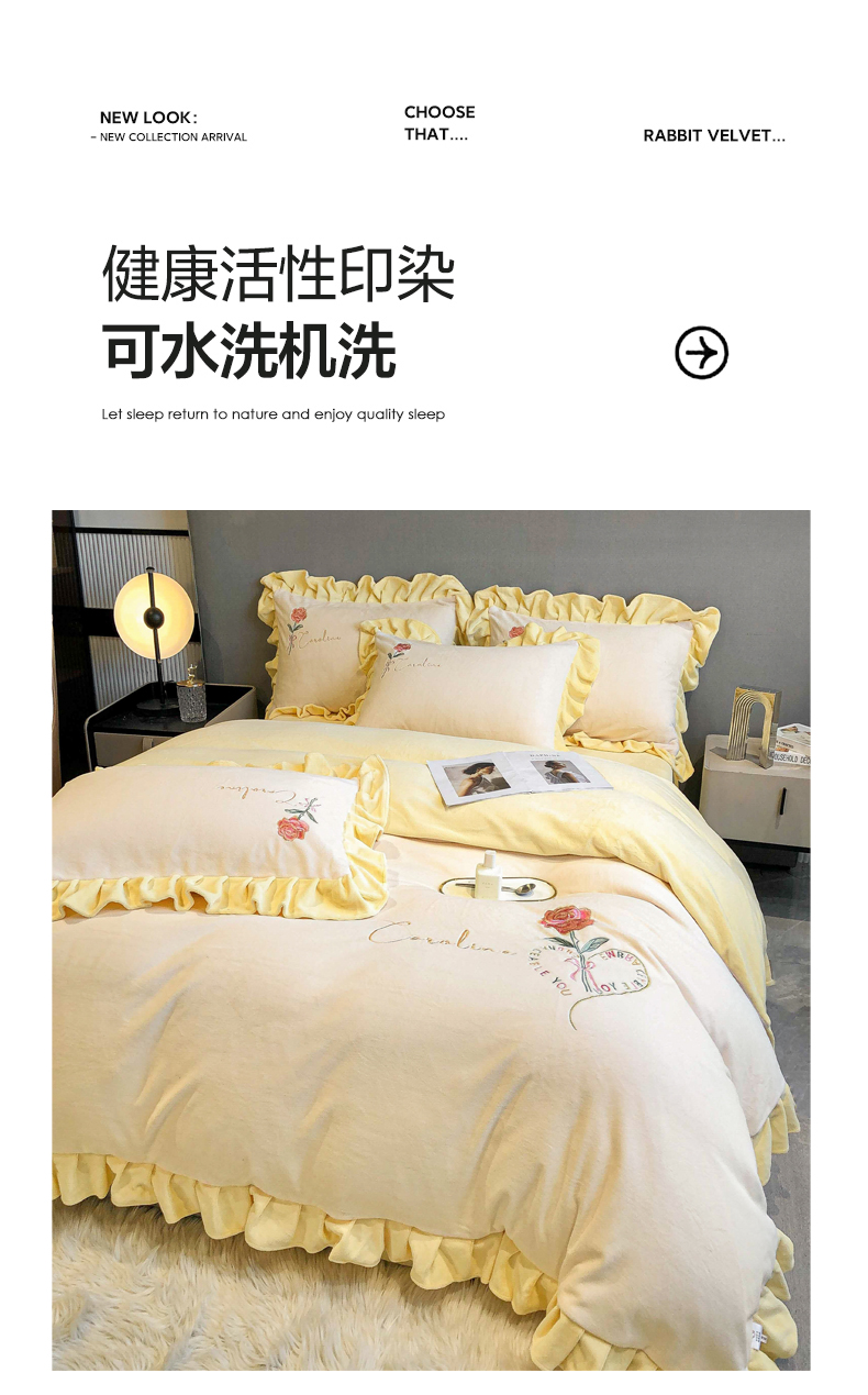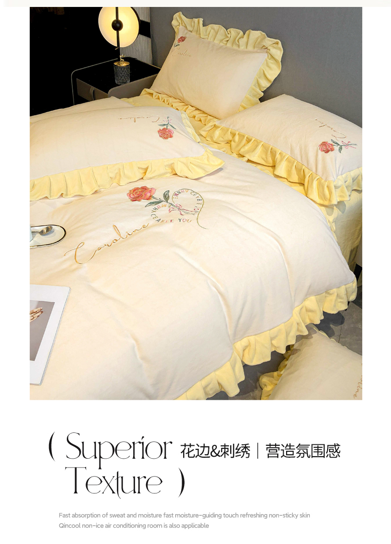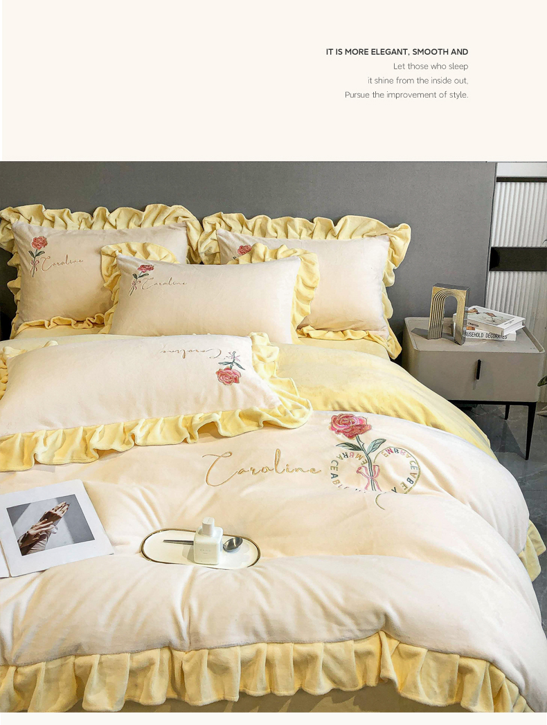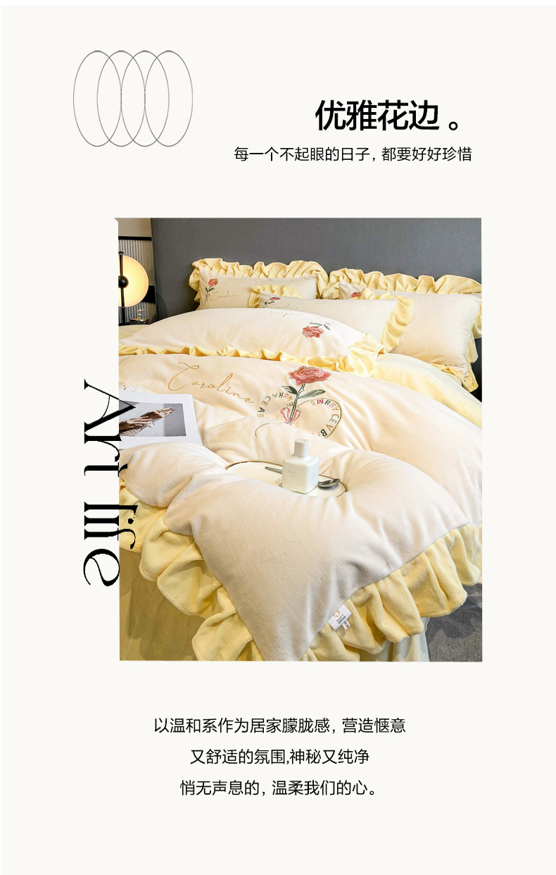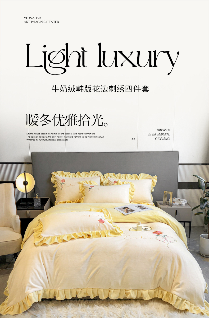 当前位置: 91家纺网 > 商品网购 > 床品套件 > 四件套 > 牛奶绒四件套 > 7V 2024新款韩版花边牛奶绒刺绣四件套8斤多加厚牛奶绒面料法兰绒宝宝绒 偏爱-暖白+嫩黄