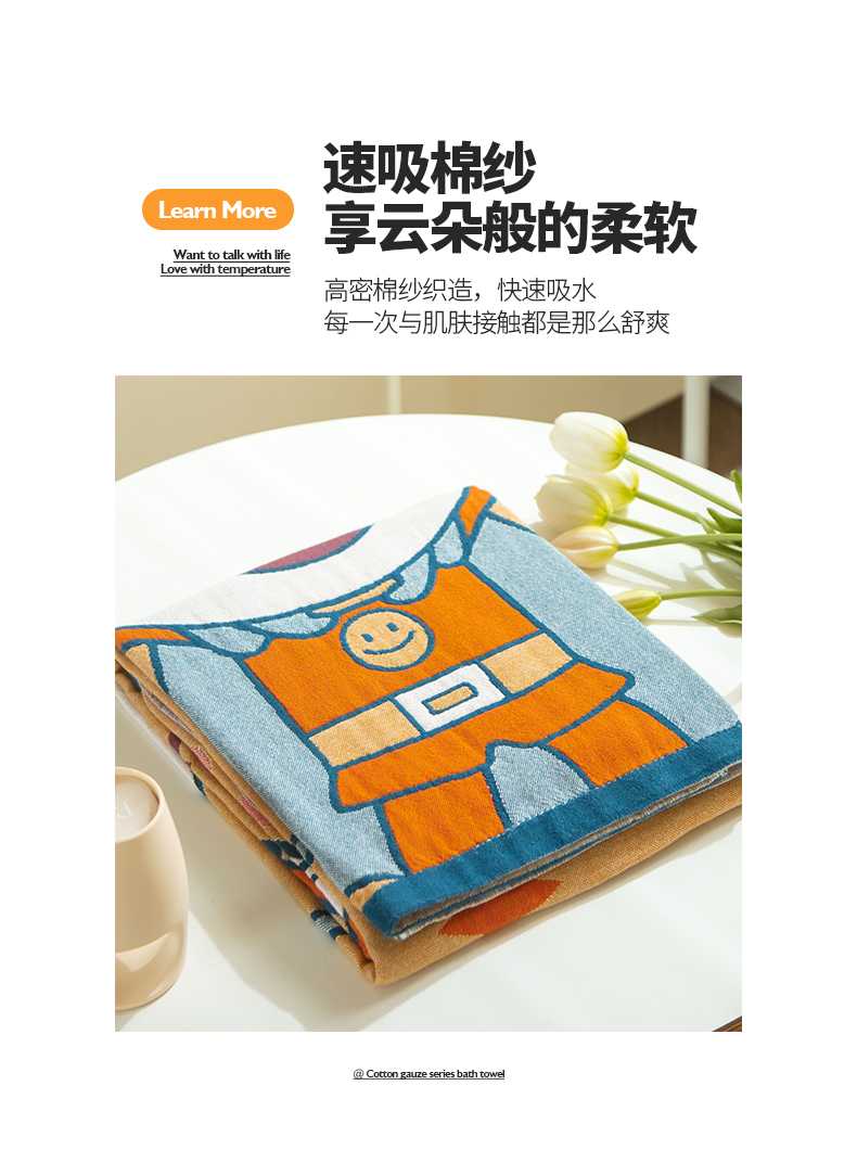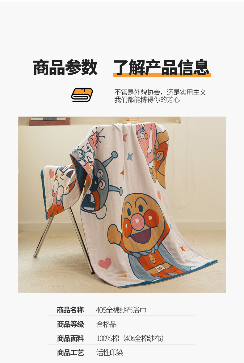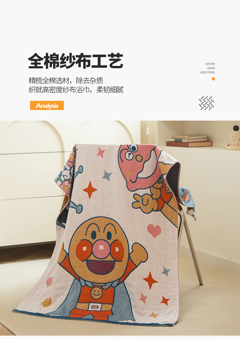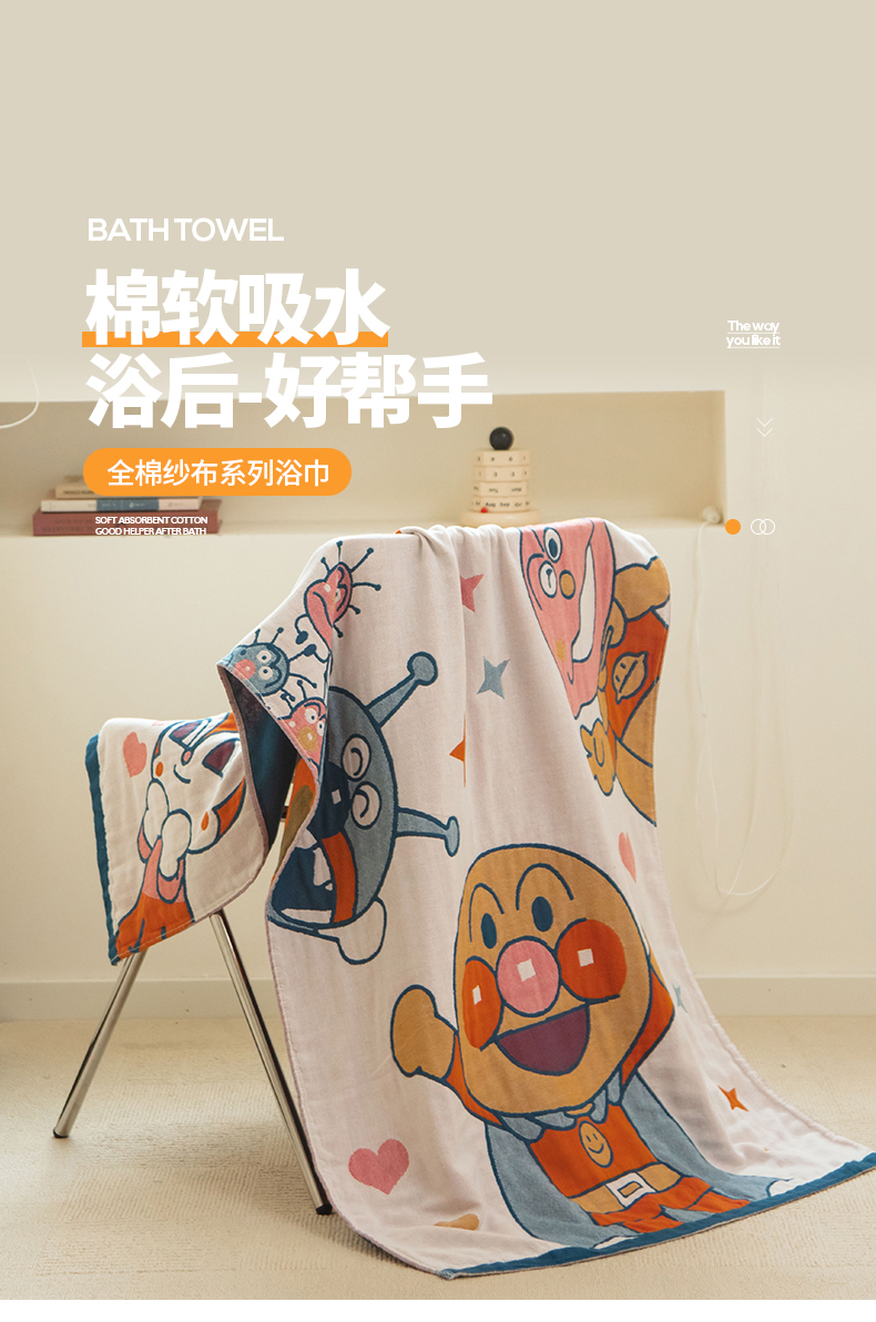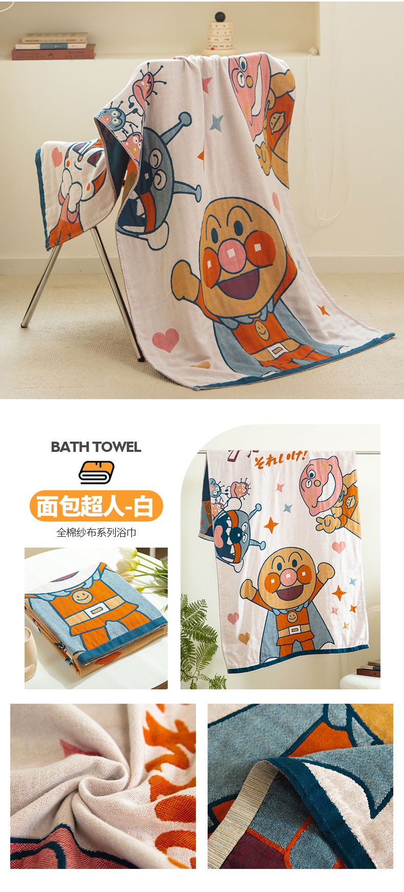 当前位置: 91家纺网 > 商品网购 > 居家日用 > 毛巾/浴巾/浴袍 > 浴巾 > 雯雨家纺 2023新款全棉卡通系列纱布浴巾 面包超人-白