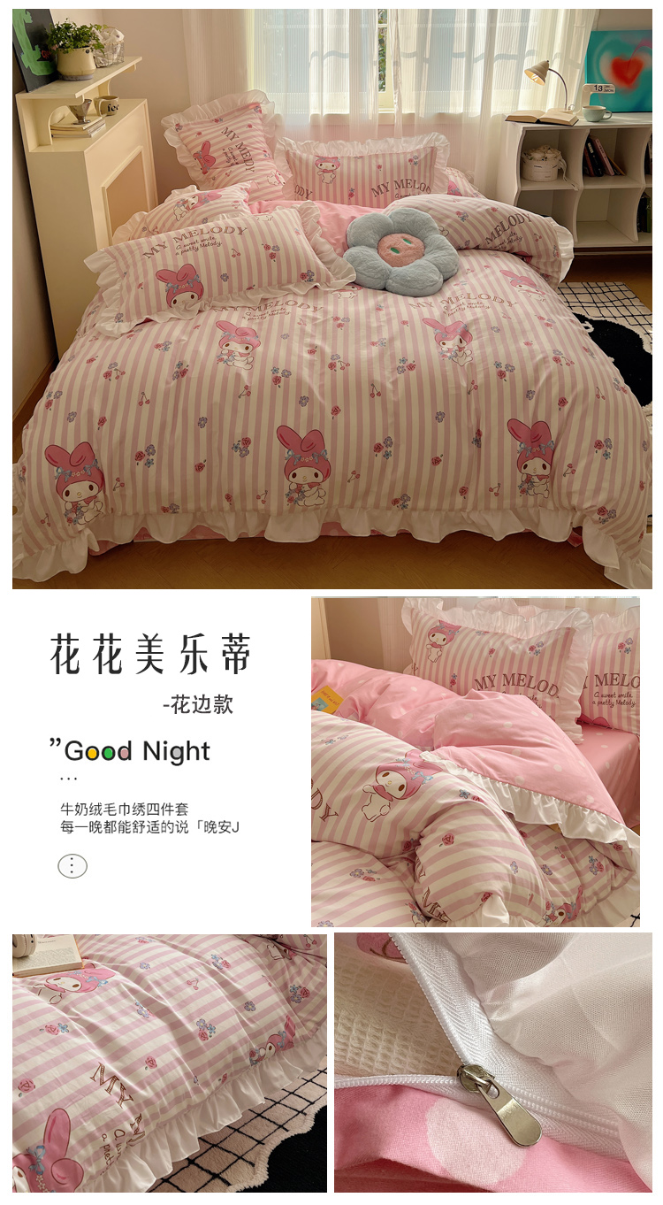 (总)三朵家纺 2024新款牛奶绒绣花四件套三丽鸥系列,草莓公主KT,梦幻旅行,逃学帕恰,淘气宝贝,甜心搬运工,香香公主KT,樱桃美乐蒂