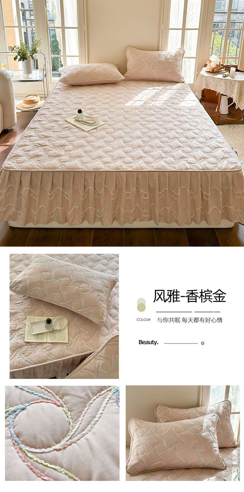 尊康家纺(原磊科) 2024新款亲肤奶昔棉夹棉床裙-风雅 风雅-香槟金,风雅-香槟金