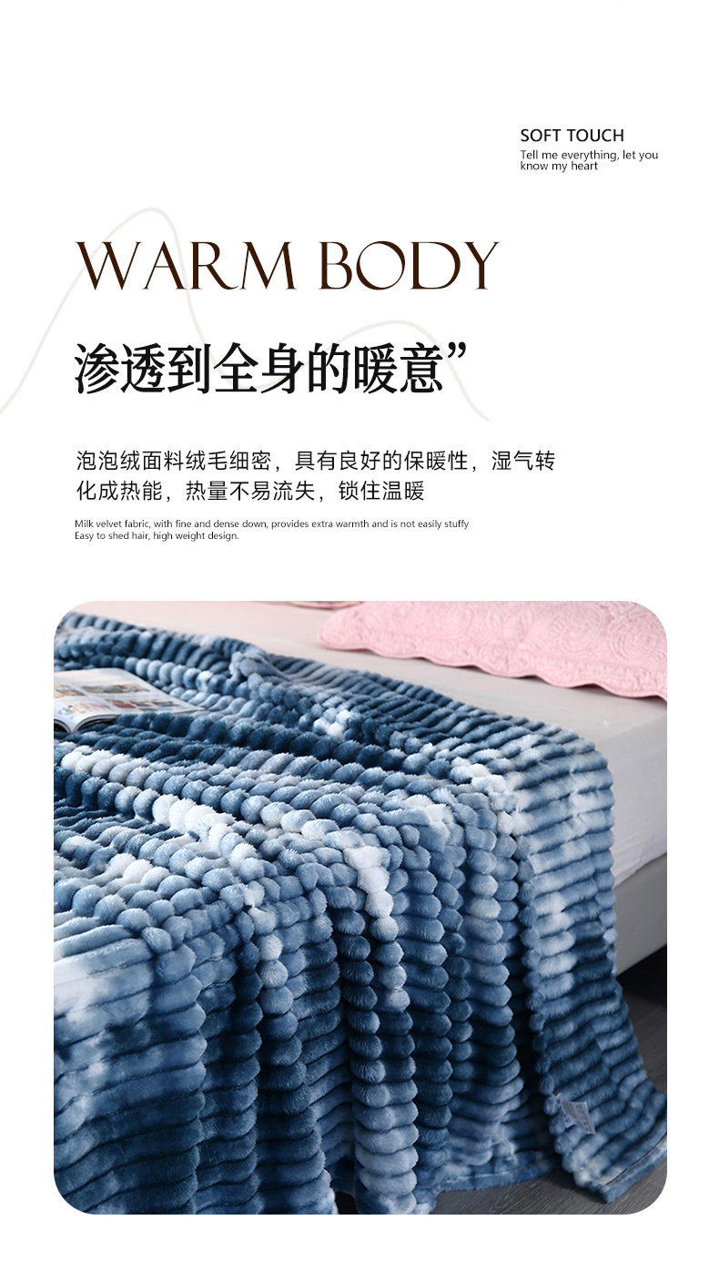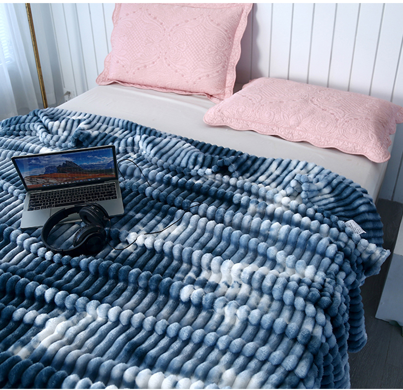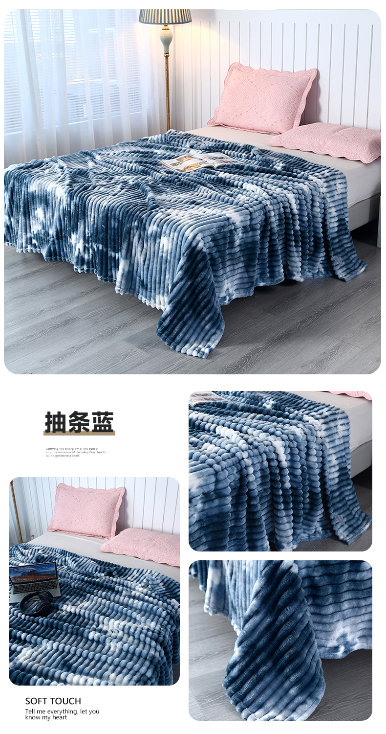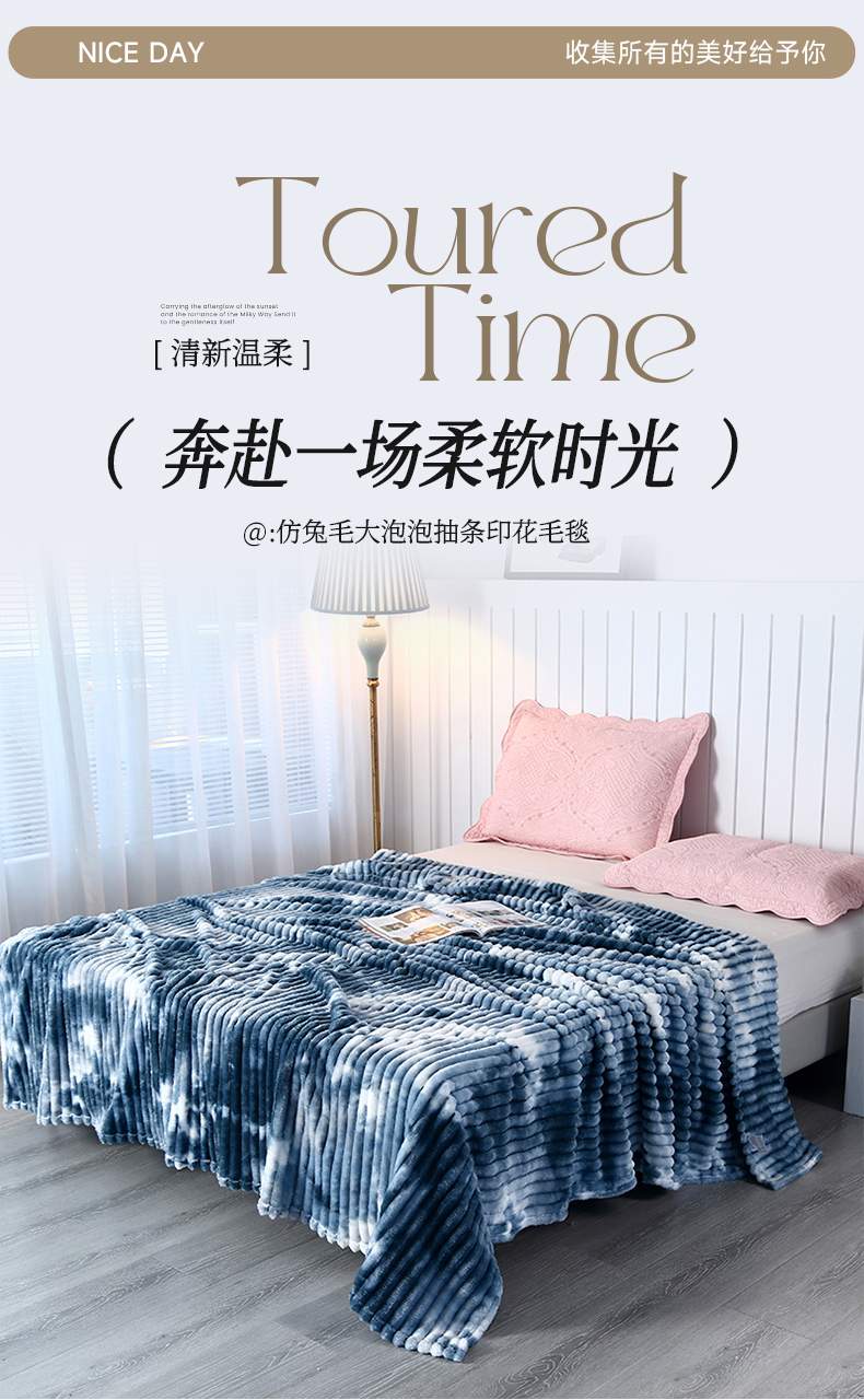 商品名称:美洲琳 2025新款仿兔毛大泡泡抽条印花毛毯 抽条蓝
