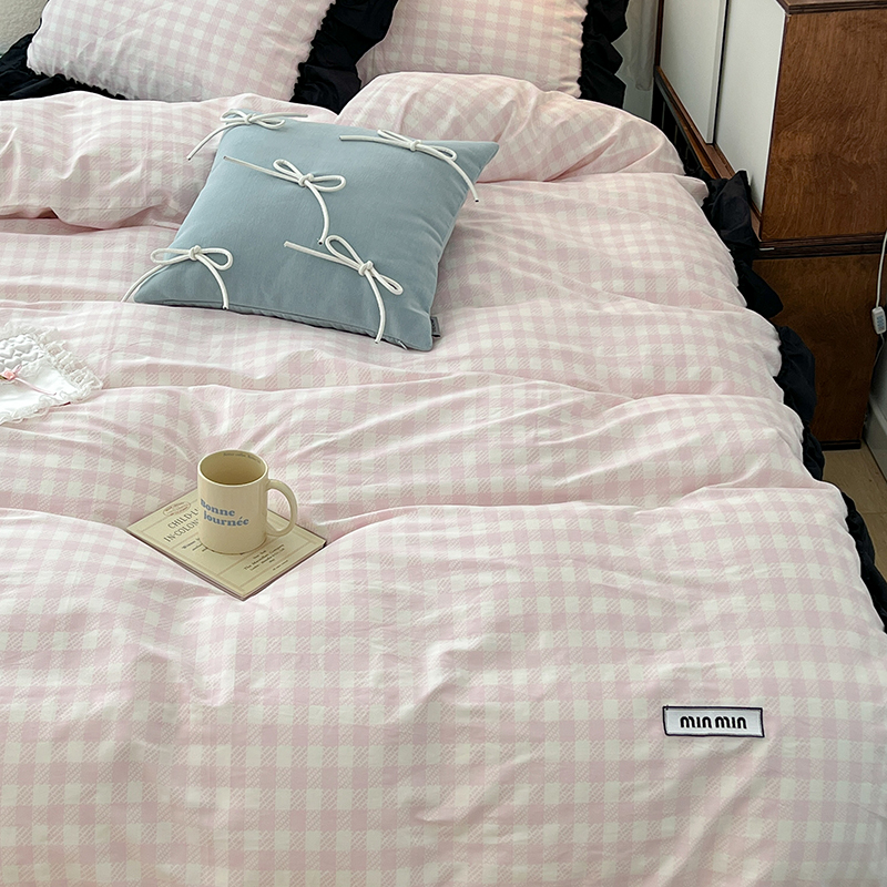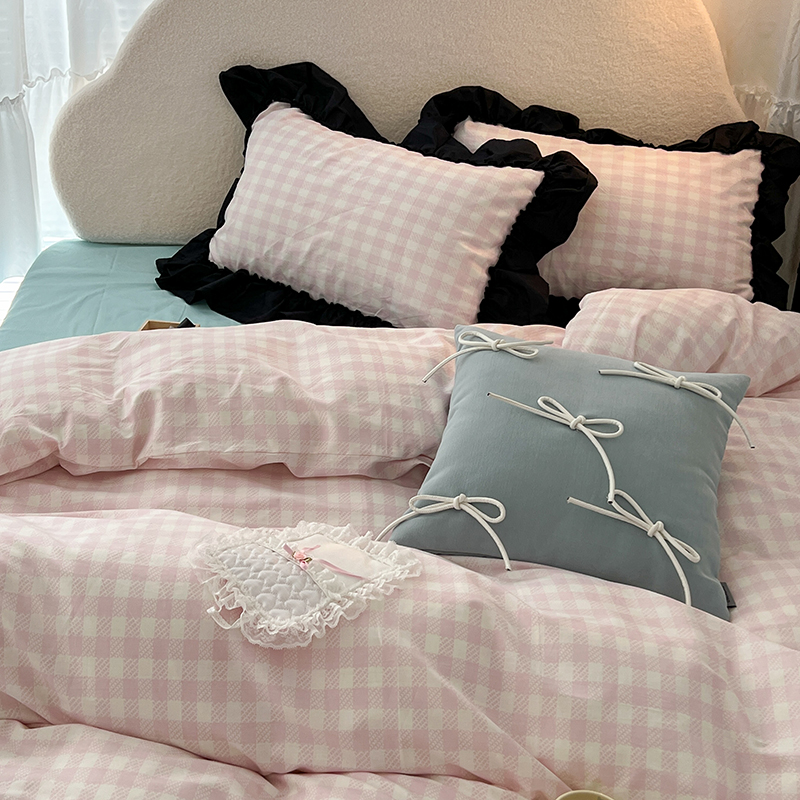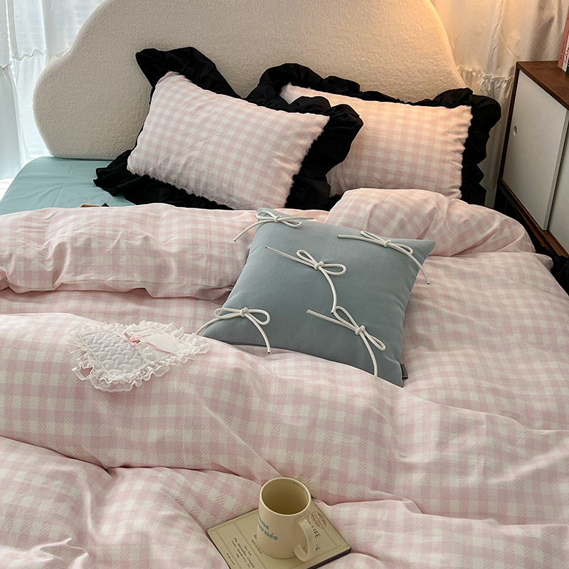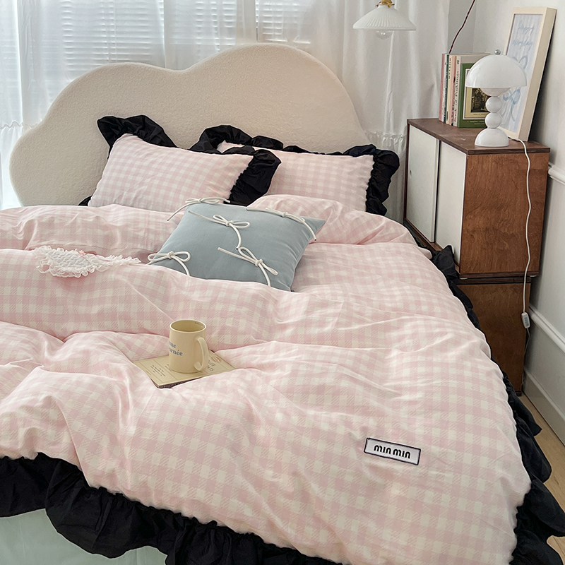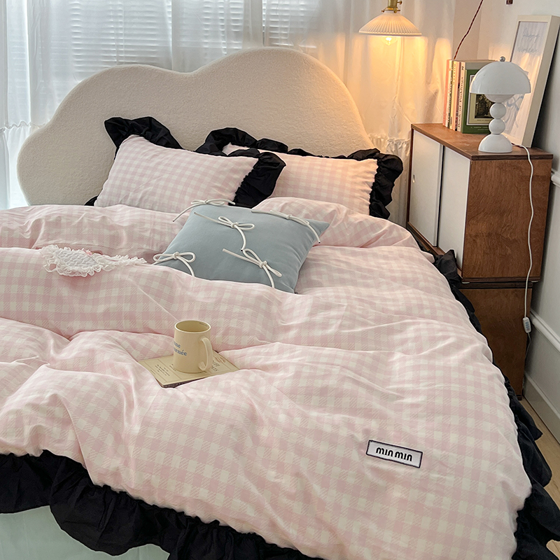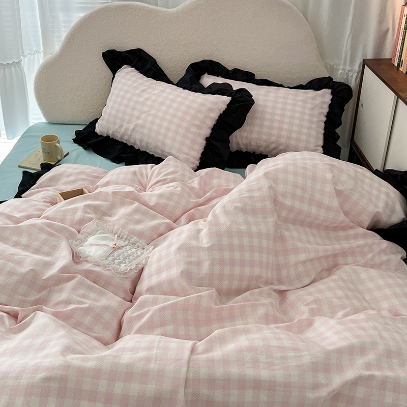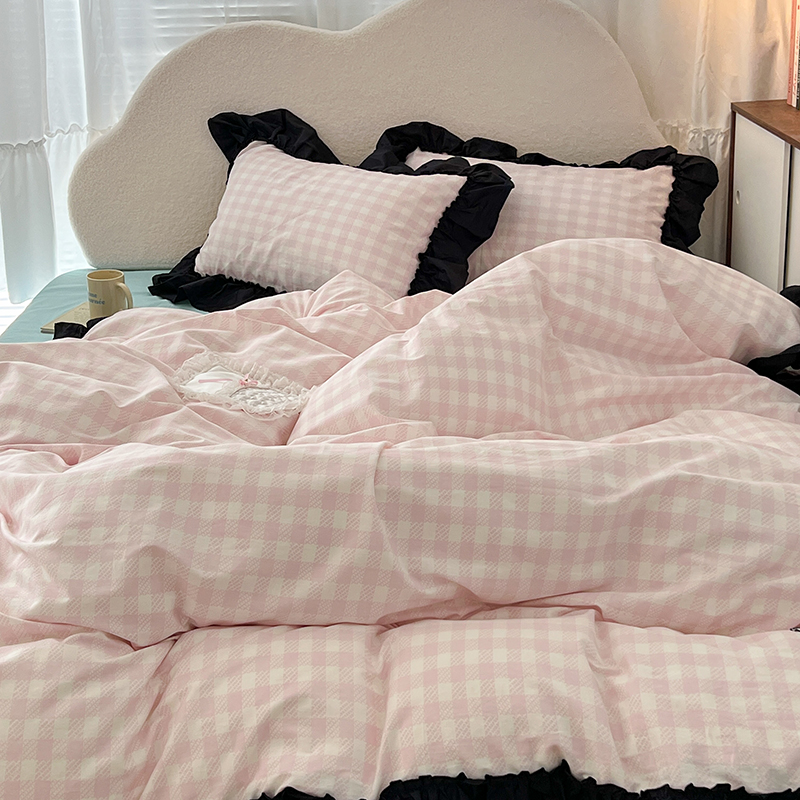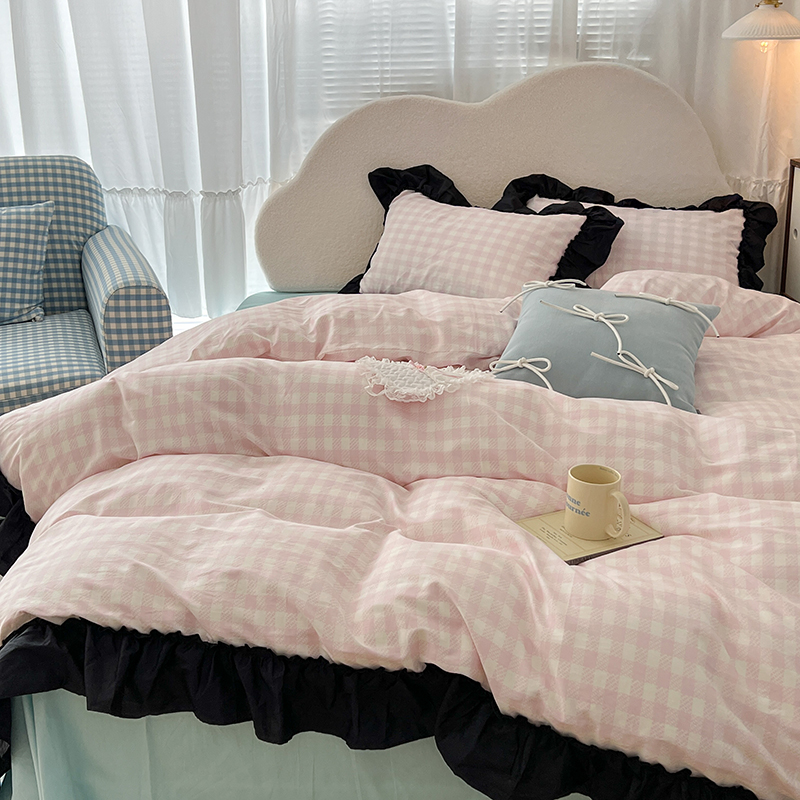 昔可家纺 2024黑色贴边花边款格子系列四件套 缪缪粉格