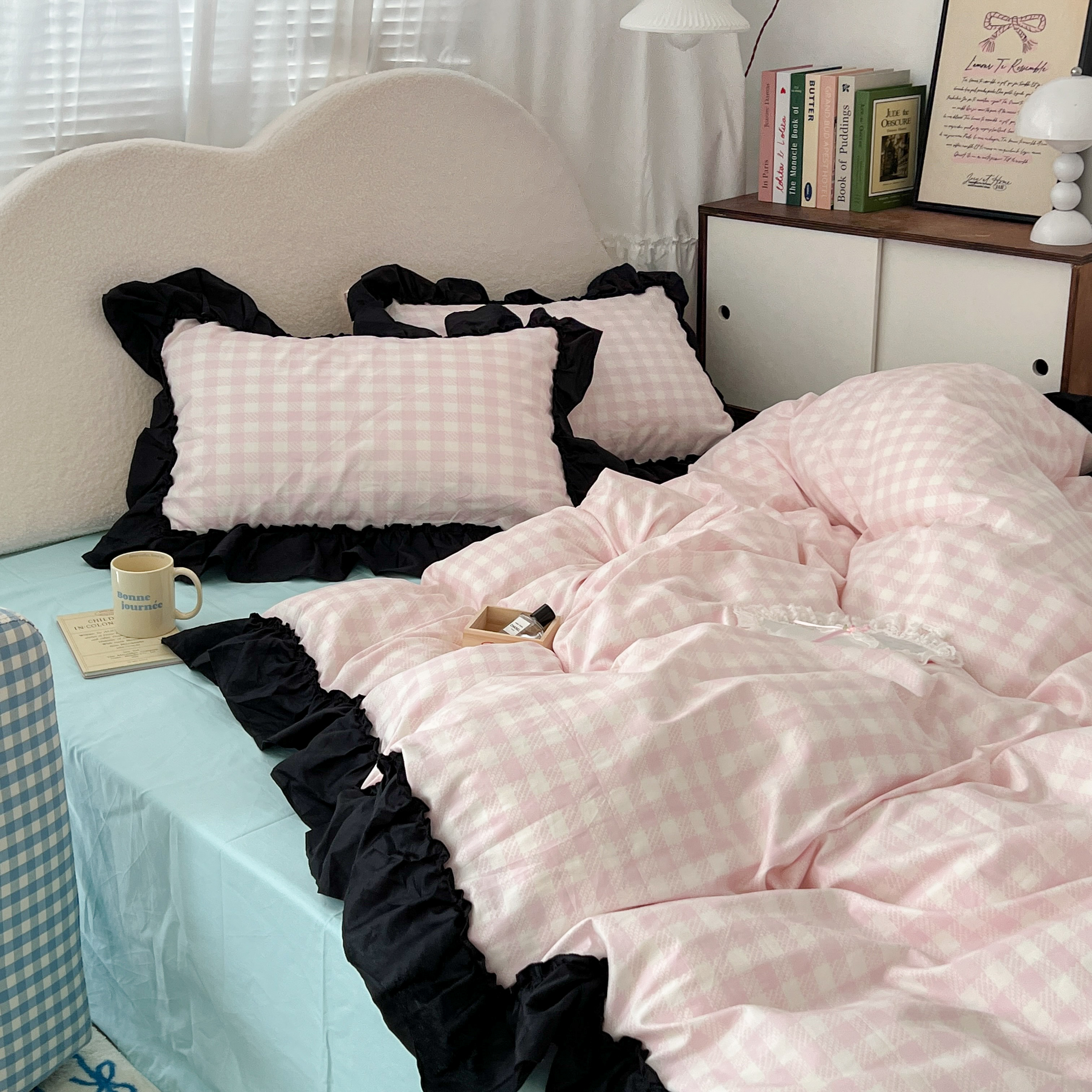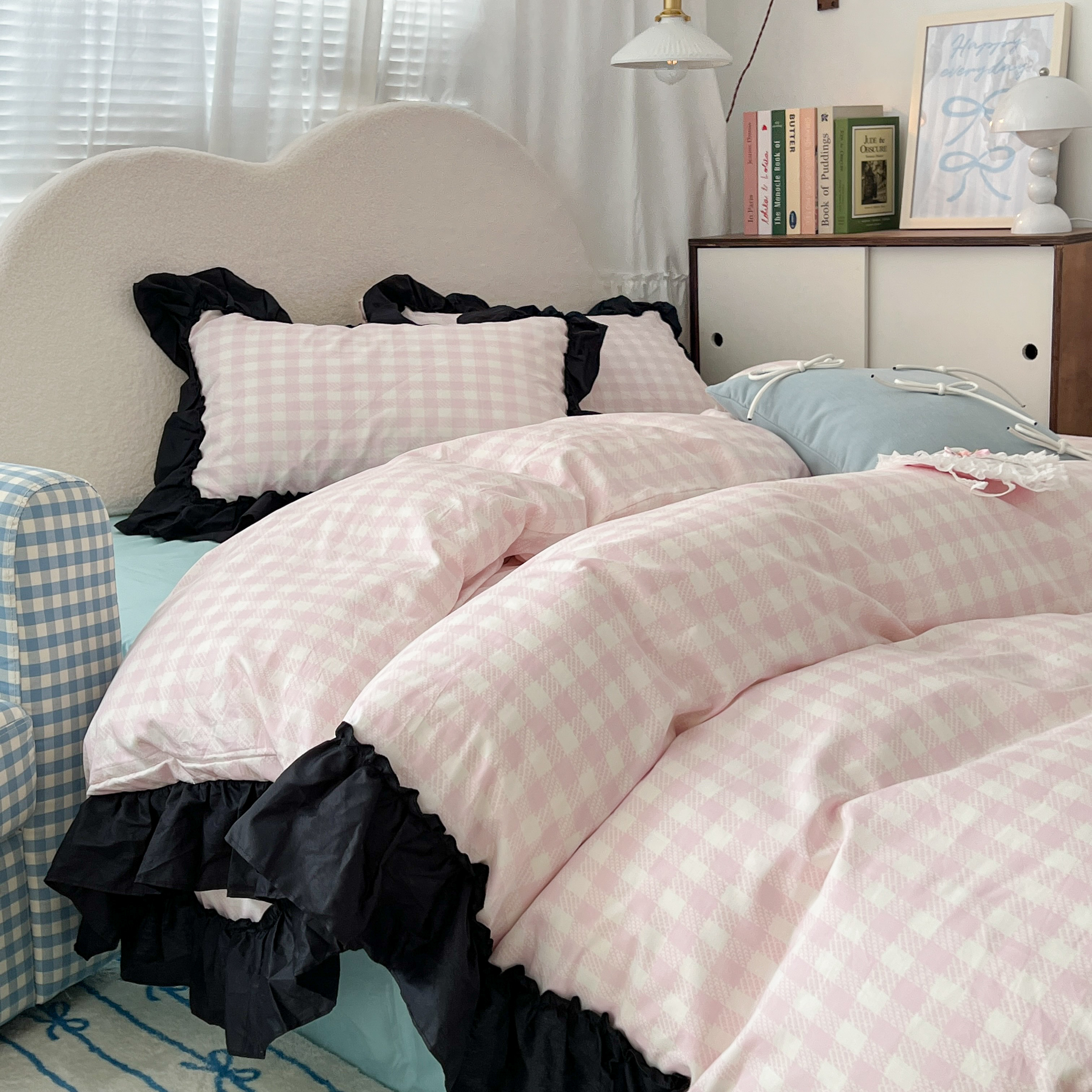 商品名称:昔可家纺 2024黑色贴边花边款格子系列四件套 缪缪粉格