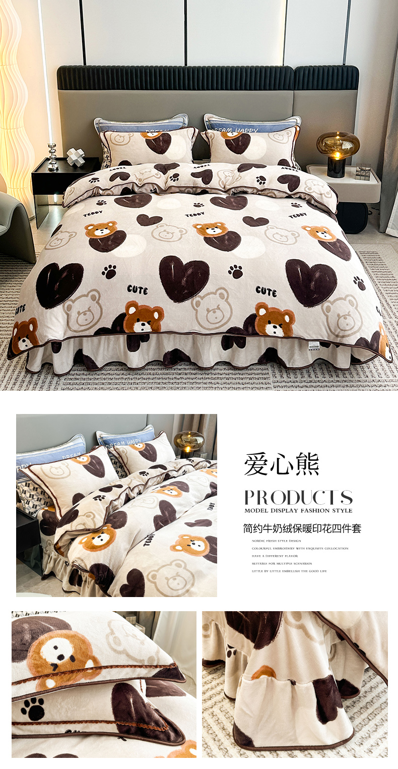 欧喜璐 2024年新款 8.5-9.5斤加厚牛奶绒金貂绒法莱绒四件套单被套 爱心熊