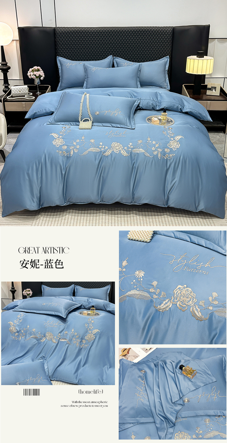 商品名称:帝菲妮 2025新款法式轻奢风暖氧磨毛重工刺绣四件套-安妮 安妮-蓝色