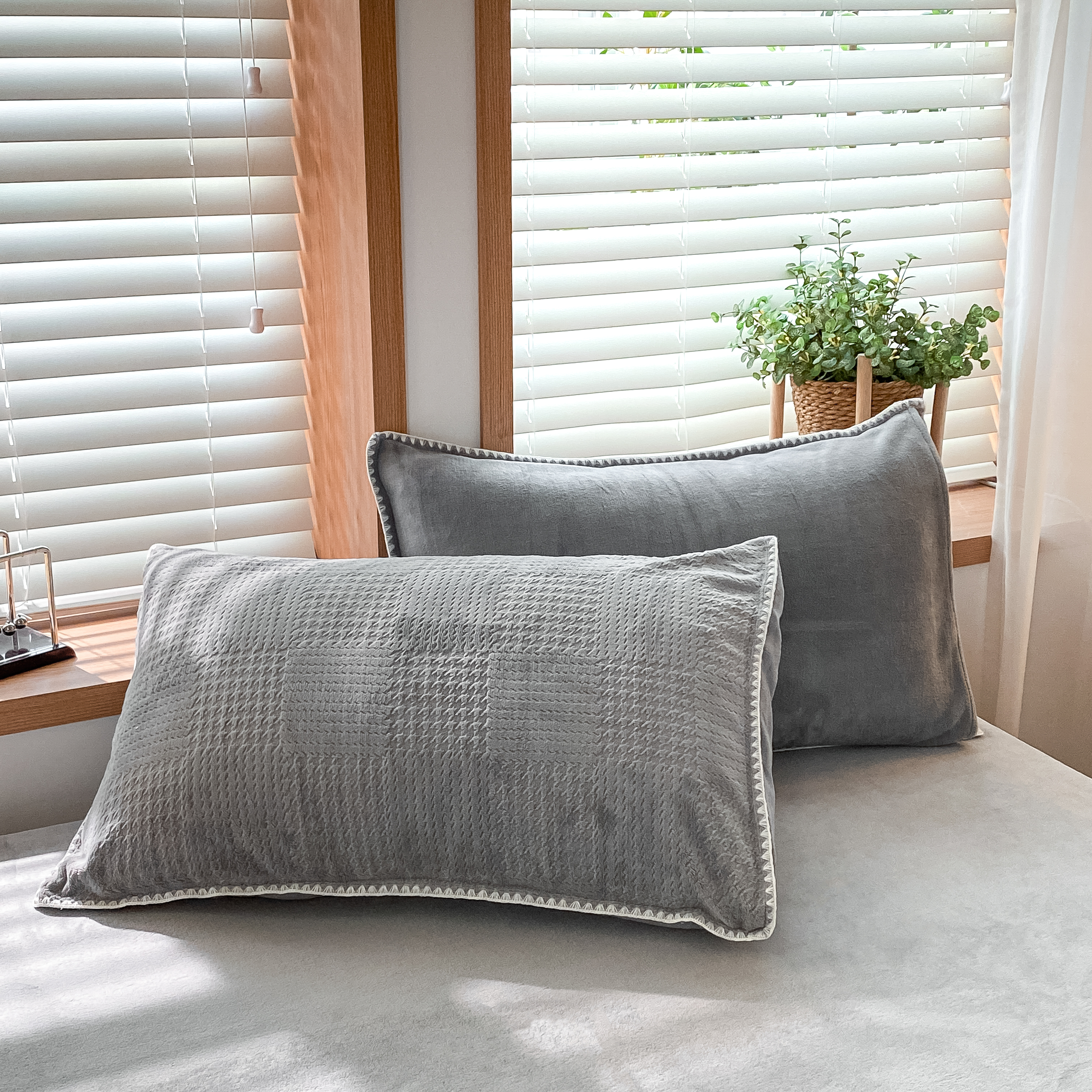 商品名称:桃子家居 2024新款A类无印ins华夫格提花烂花雕花剪花三角贝壳边工艺加厚牛奶绒枕套 绒华夫格-高级灰