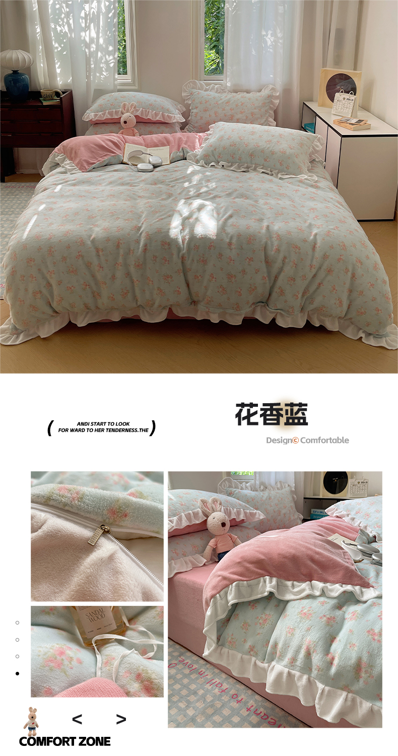 商品名称:美乐迪家纺 2024新款花边牛奶绒印花四件套 花香蓝