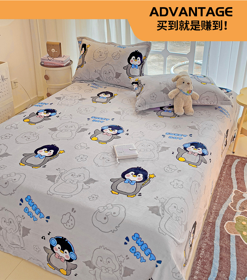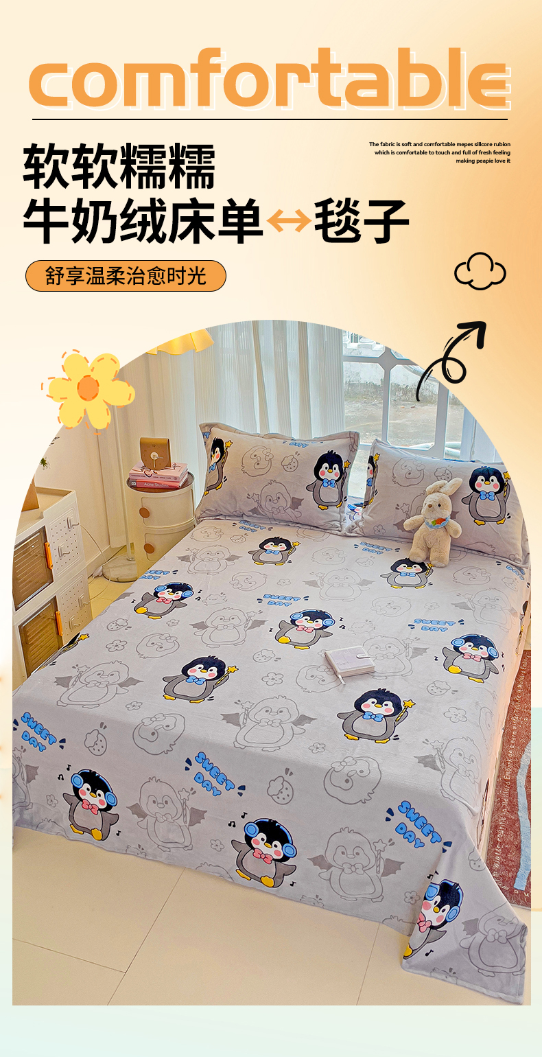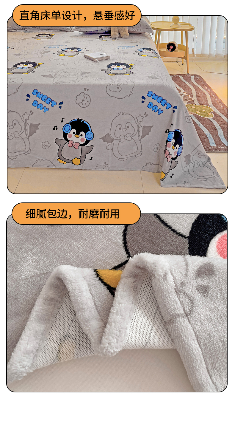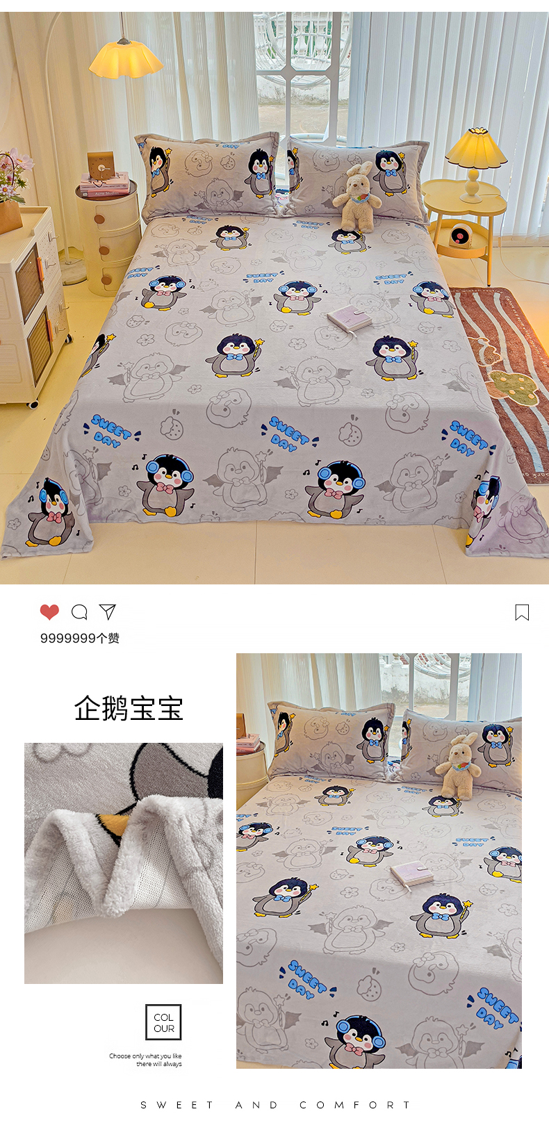 名兮家居 2024新款时尚卡通风高克重牛奶绒床单-盖毯 企鹅宝宝