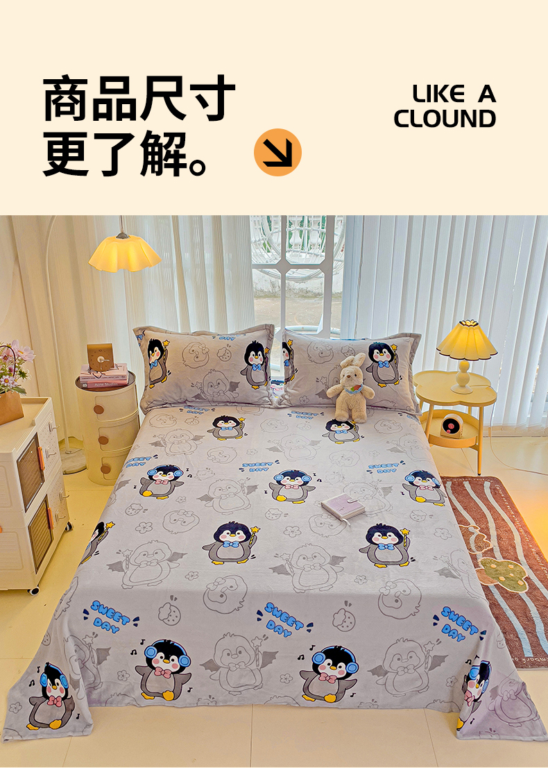 当前位置: 91家纺网 > 商品网购 > 床上用品 > 床单 > 名兮家居 2024新款时尚卡通风高克重牛奶绒床单-盖毯 企鹅宝宝