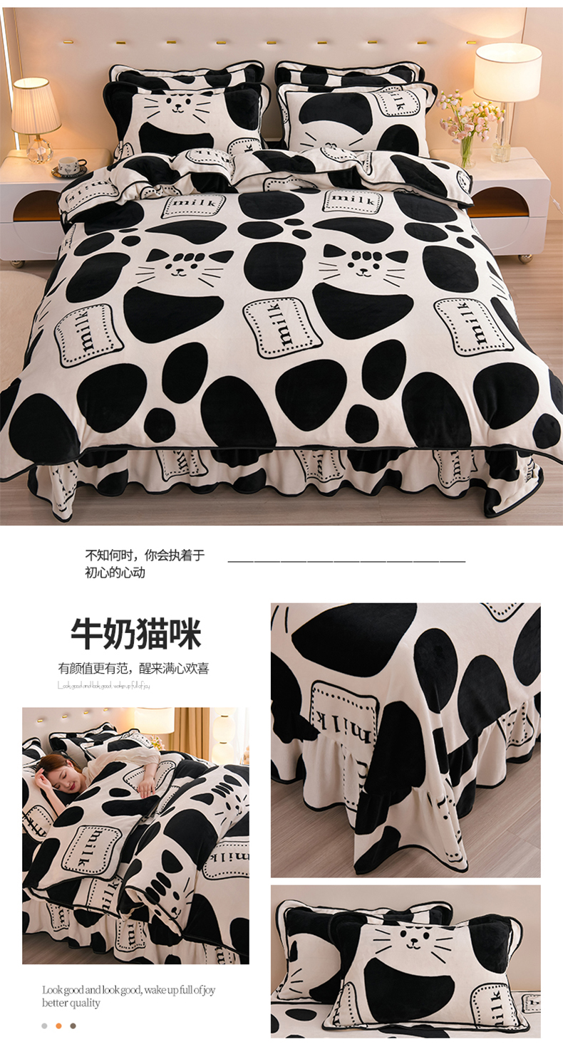 当前位置: 91家纺网 > 商品网购 > 床品套件 > 四件套 > 牛奶绒四件套 > 阿亮家居 2024新款8.5斤保暖牛奶绒金貂绒床裙款四件套 牛奶猫咪