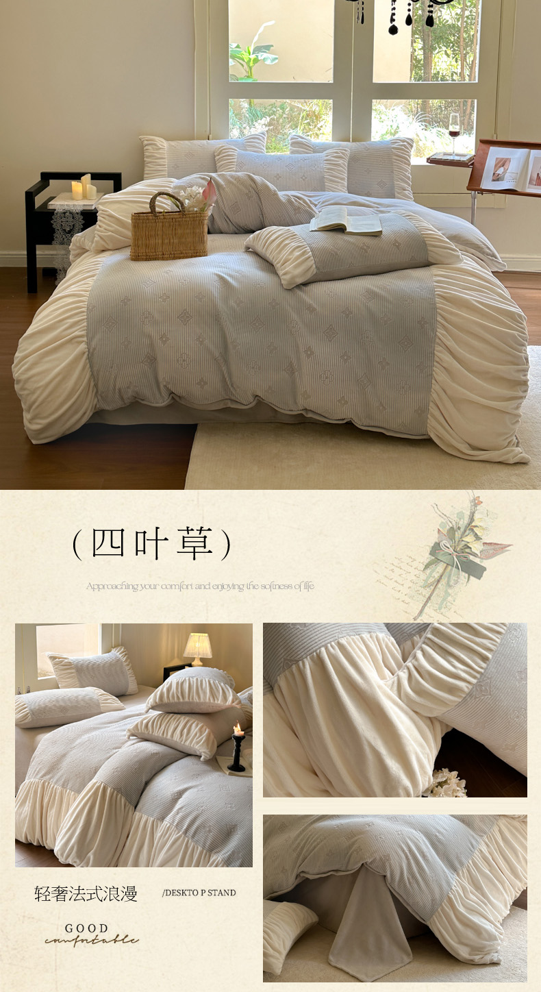 商品名称:慕澄家纺 2024新款法式轻奢款琢色烂花牛奶绒四件套 四叶草
