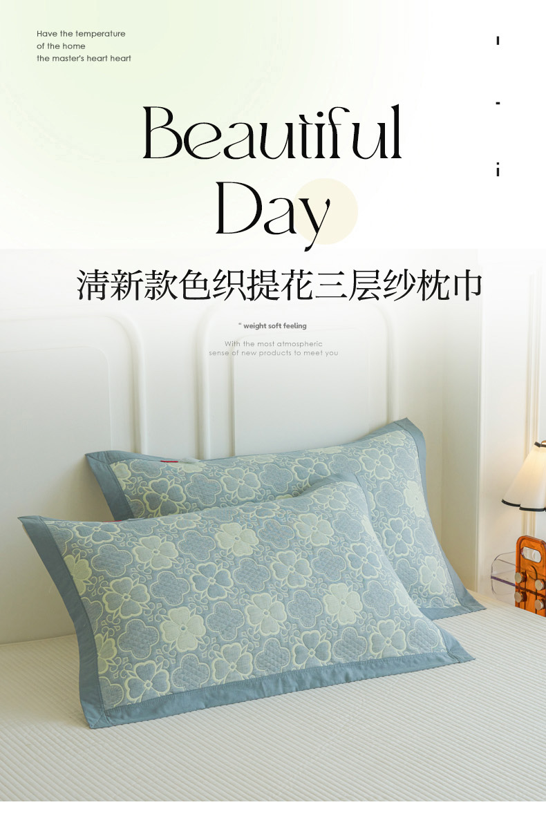 商品名称:棠薇家纺 2025新款清新款全棉细纱三层纱包边枕巾一对装 四片叶子-枕巾