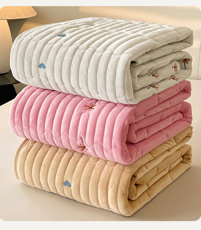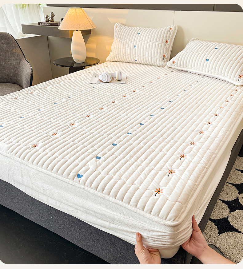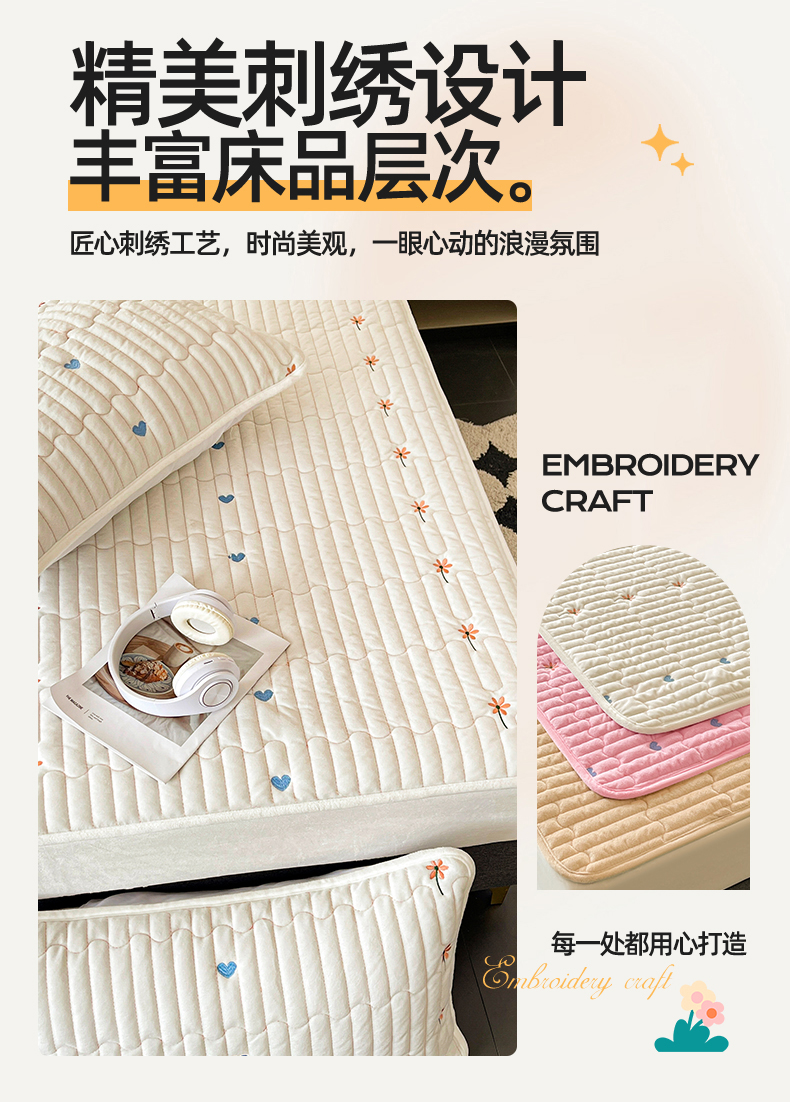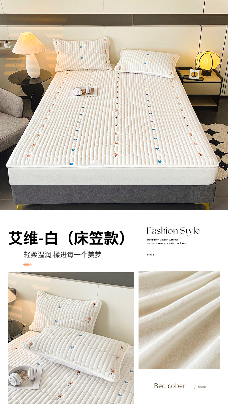 2024新款A类纯色牛奶绒刺绣薄款床垫加厚绒保暖床笠床护垫 艾维-白(床笠款)