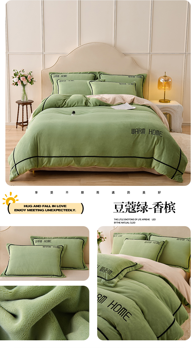 商品名称:同田家纺 2024新款230克蓄暖高克重牛奶绒四件套 豆蔻绿-香槟