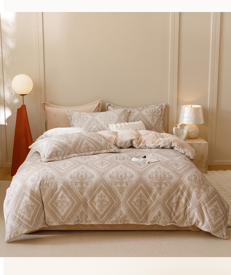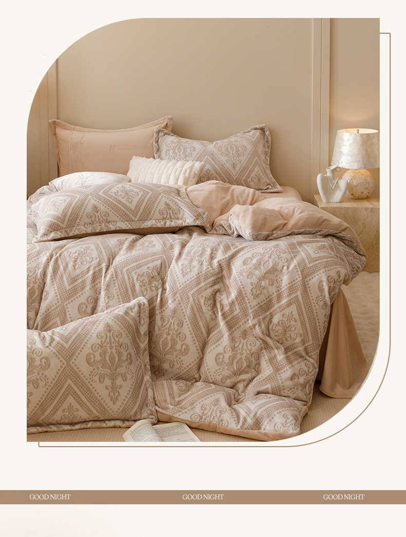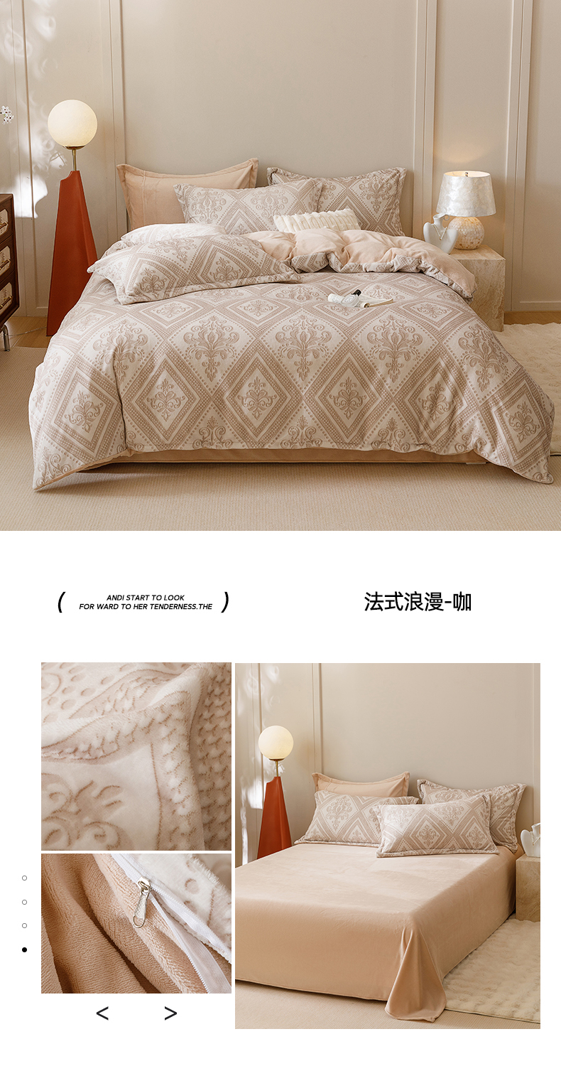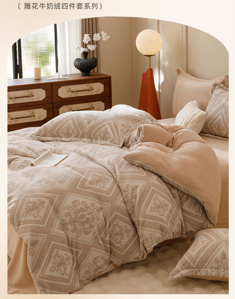 商品名称:卡派 2024新款轻奢肌理纹雕花工艺款230克加厚牛奶绒四件套(提供买家秀 ) 法式浪漫-奶咖