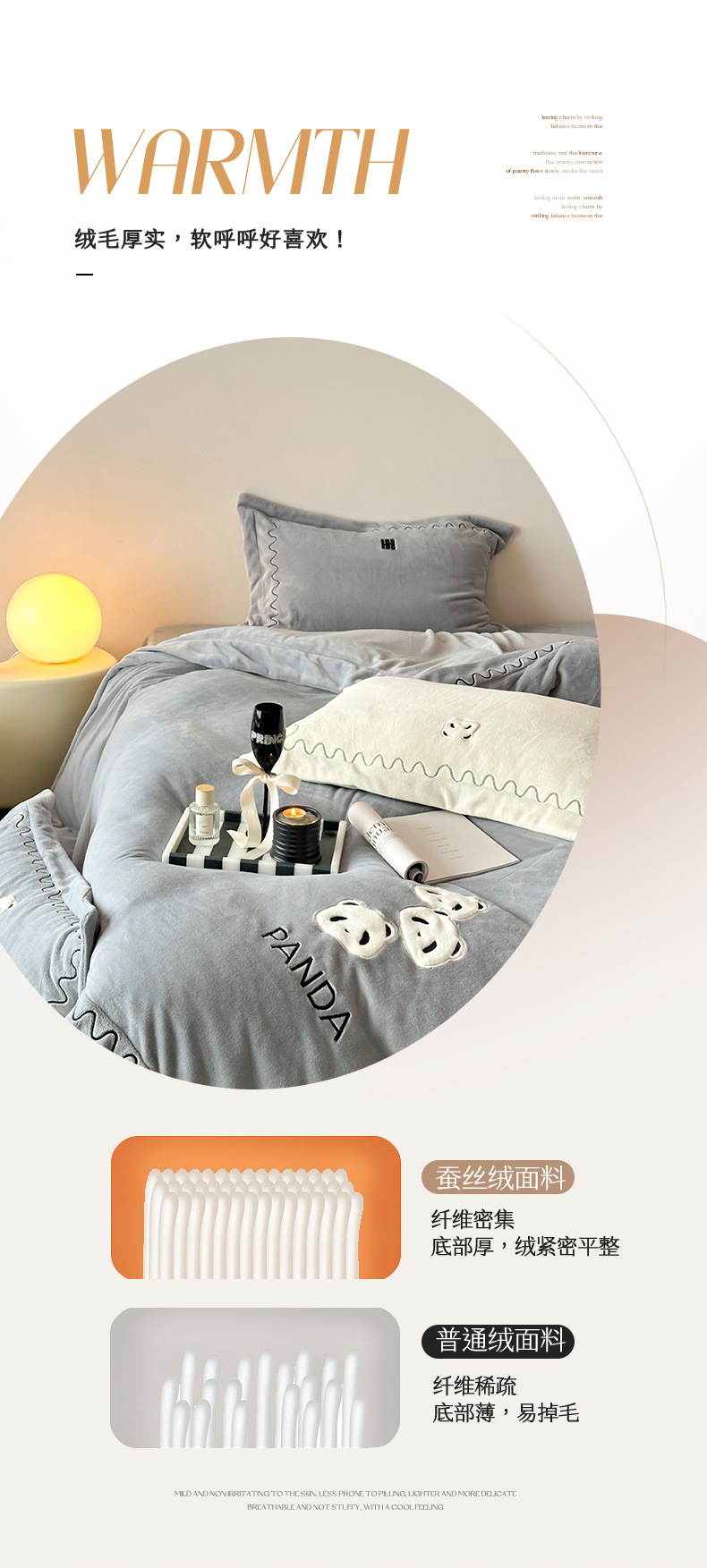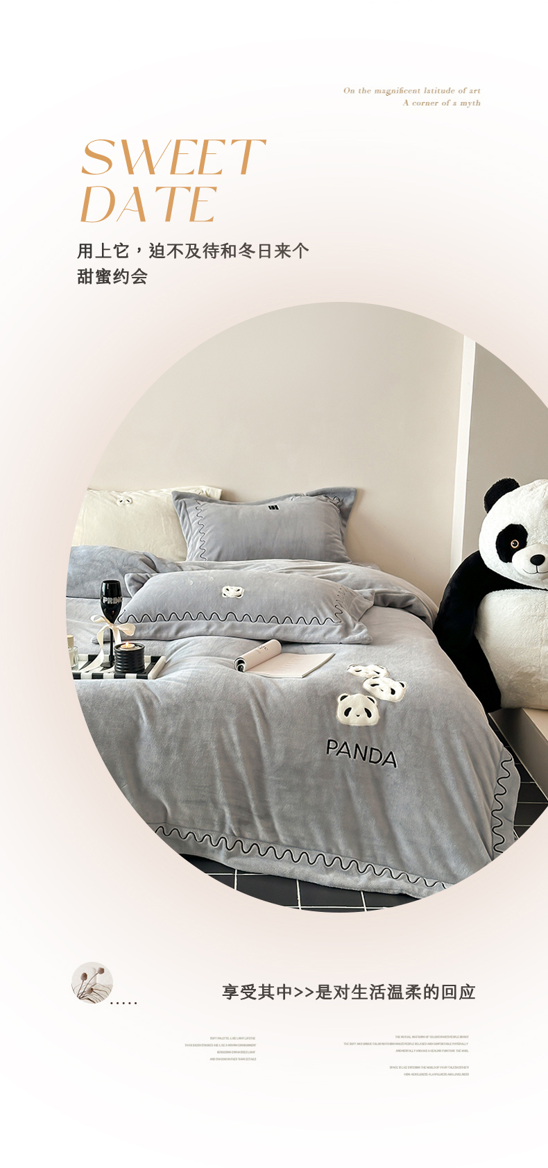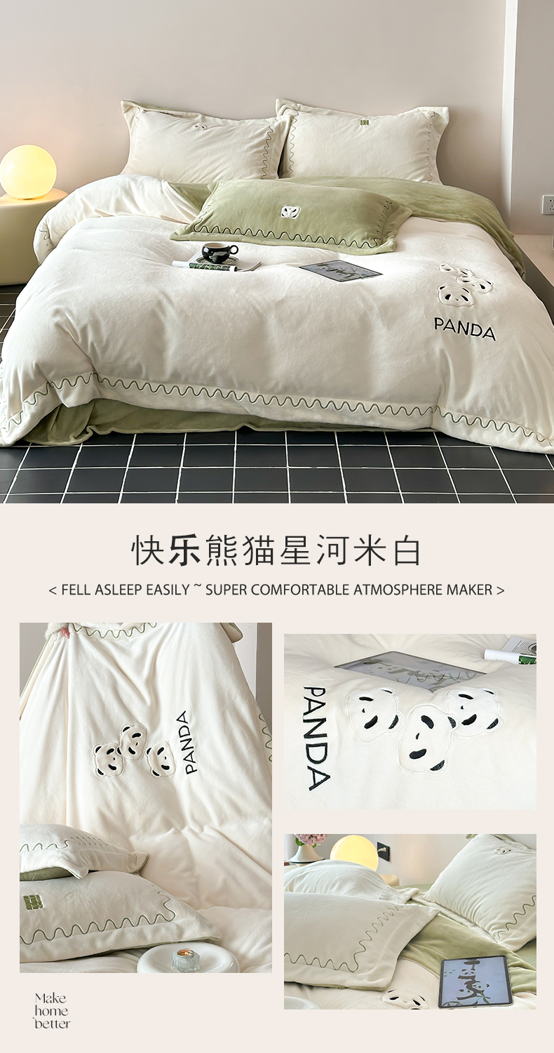 商品名称:名品优仓 2024新款高克重牛奶绒刺绣四件套-快乐熊猫 快乐熊猫 慕云灰