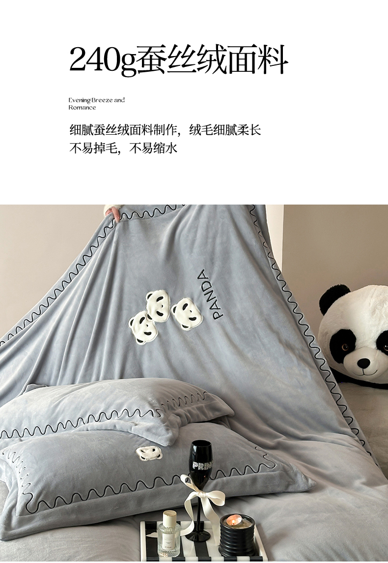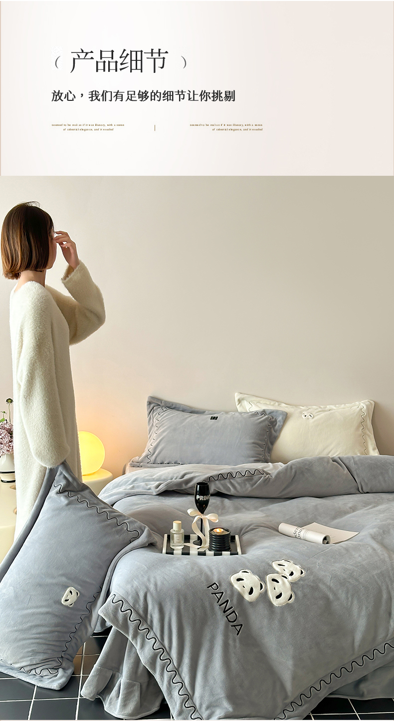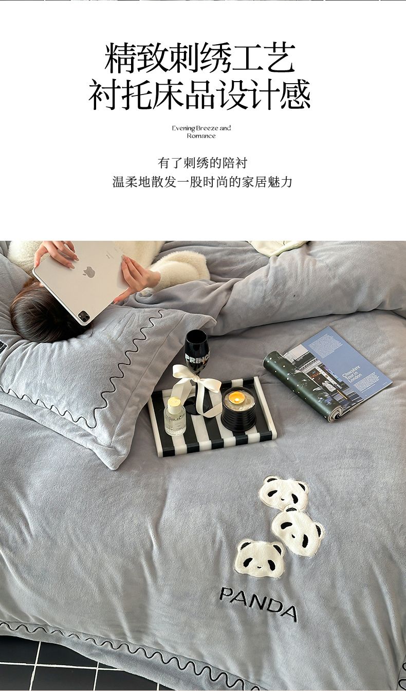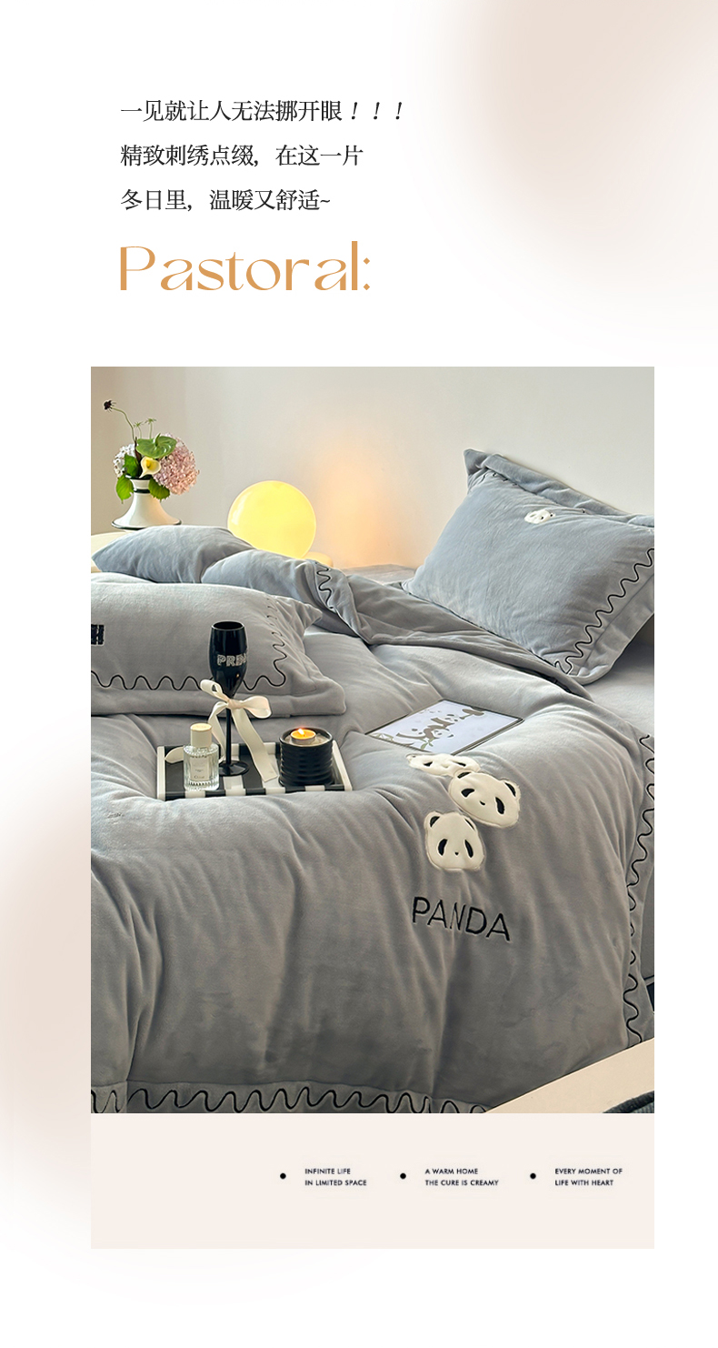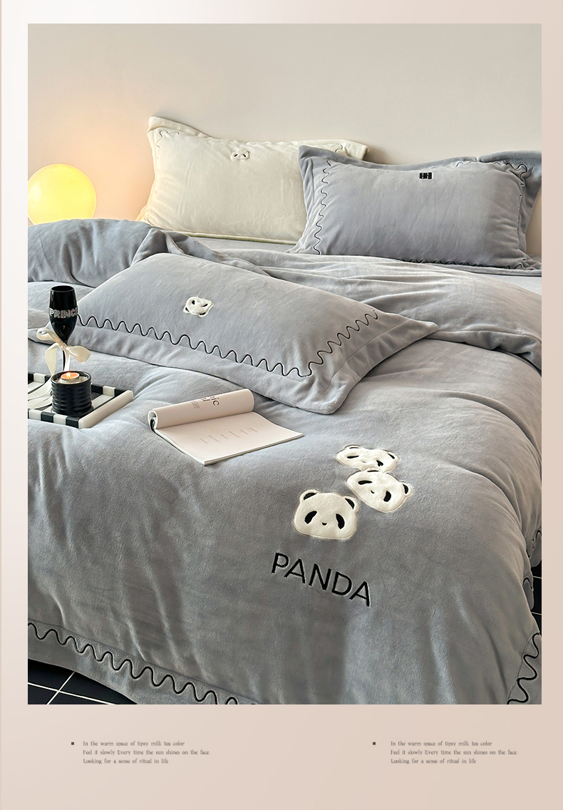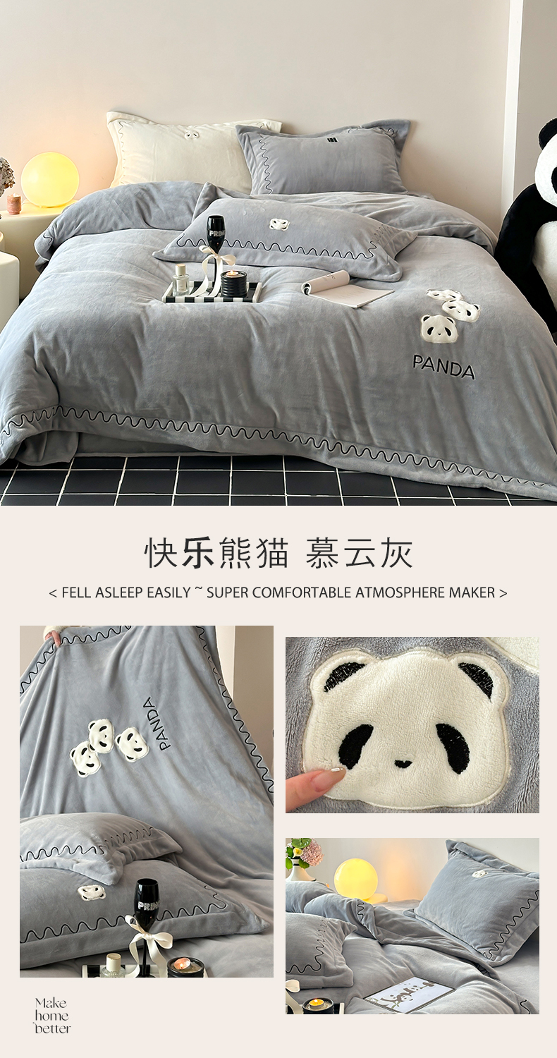名品优仓 2024新款高克重牛奶绒刺绣四件套-快乐熊猫 快乐熊猫 慕云灰