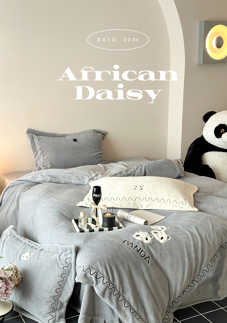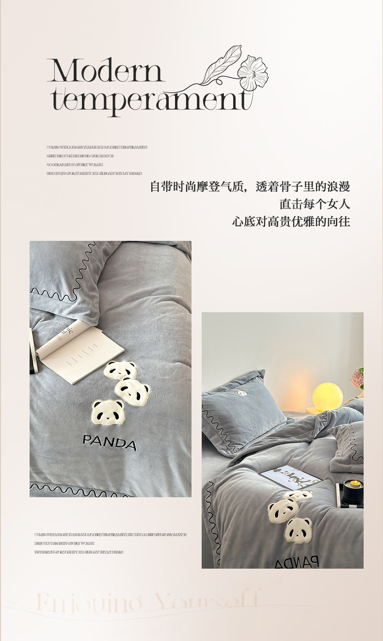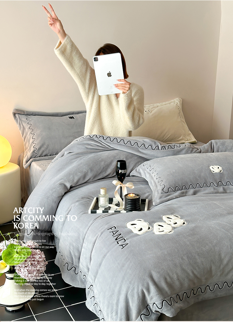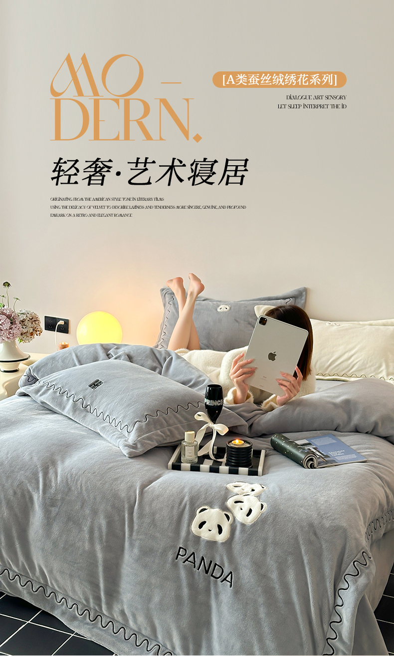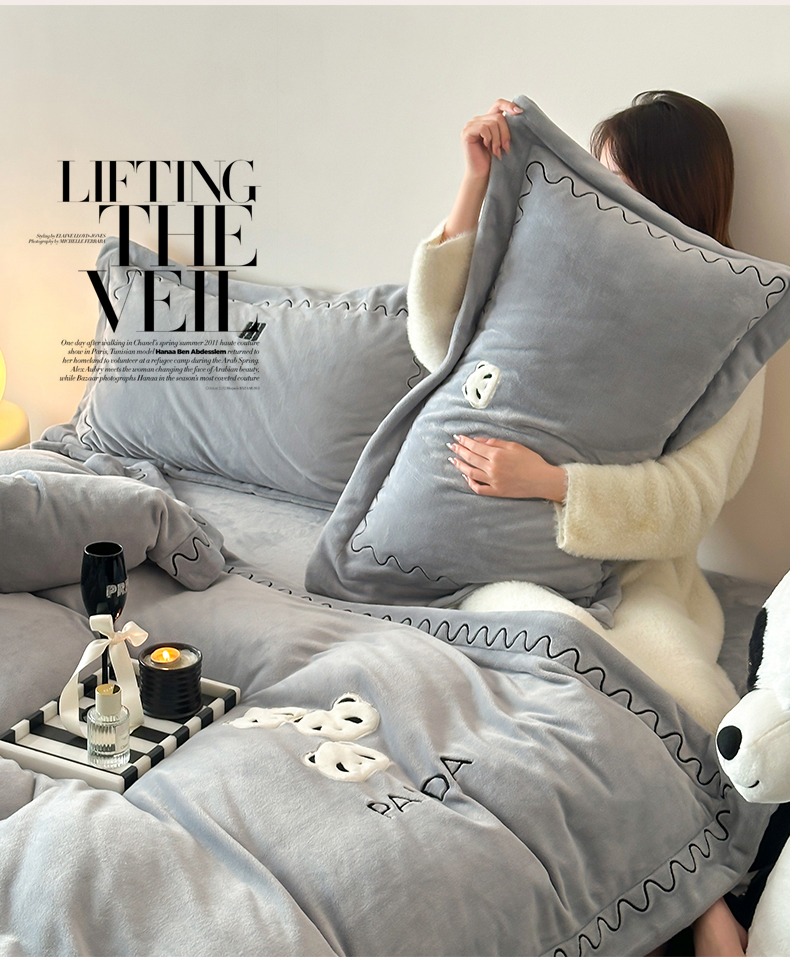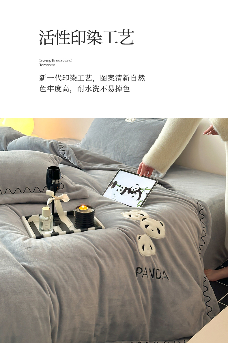 名品优仓 2024新款高克重牛奶绒刺绣四件套-快乐熊猫 快乐熊猫 慕云灰
